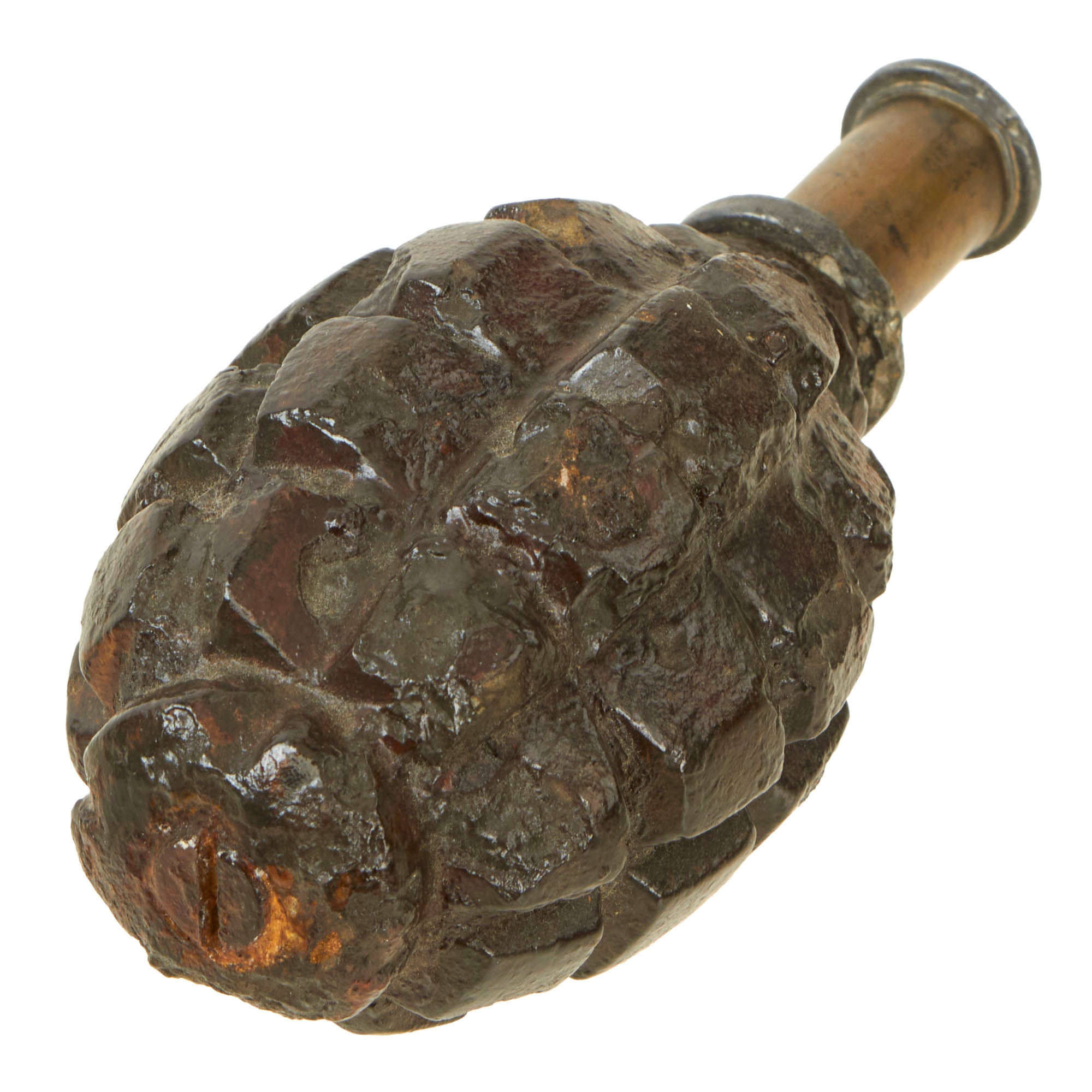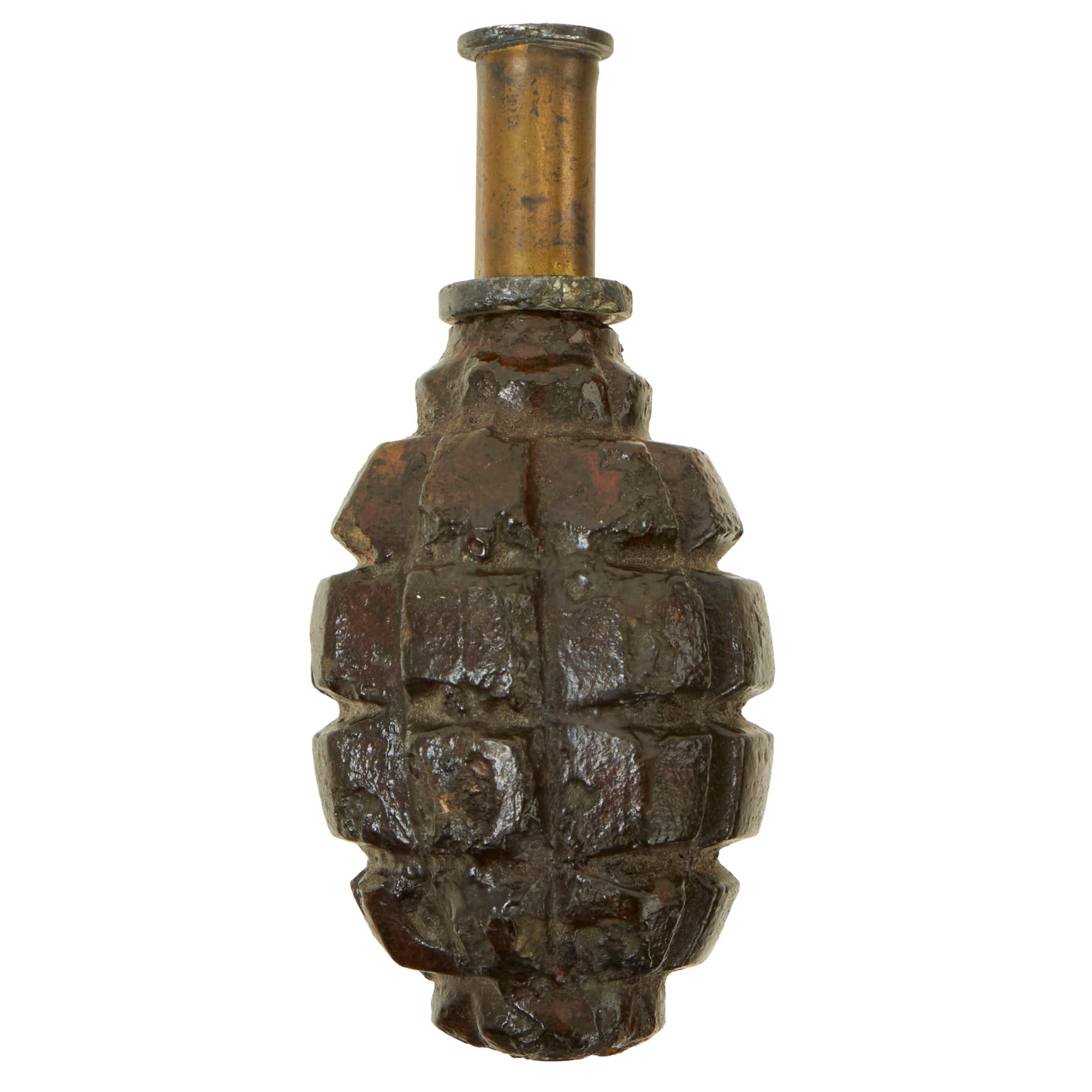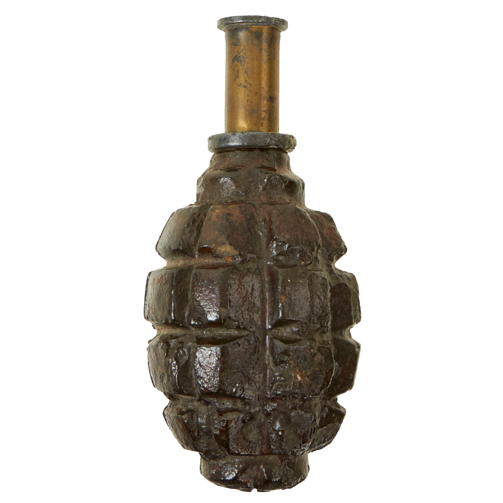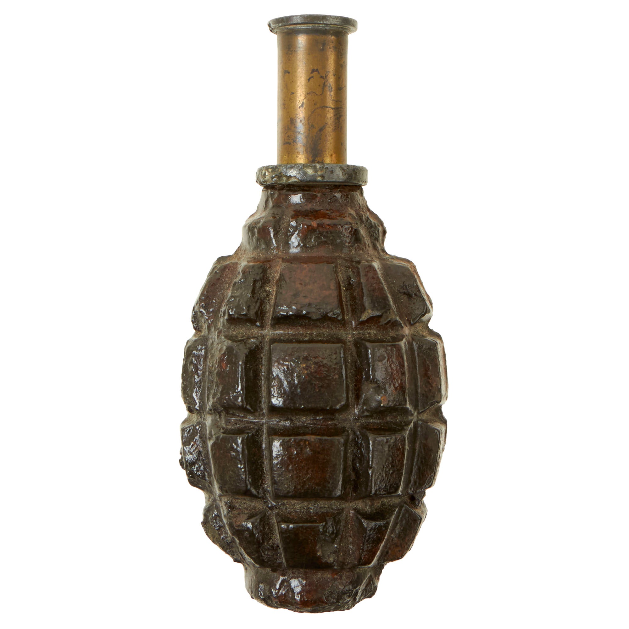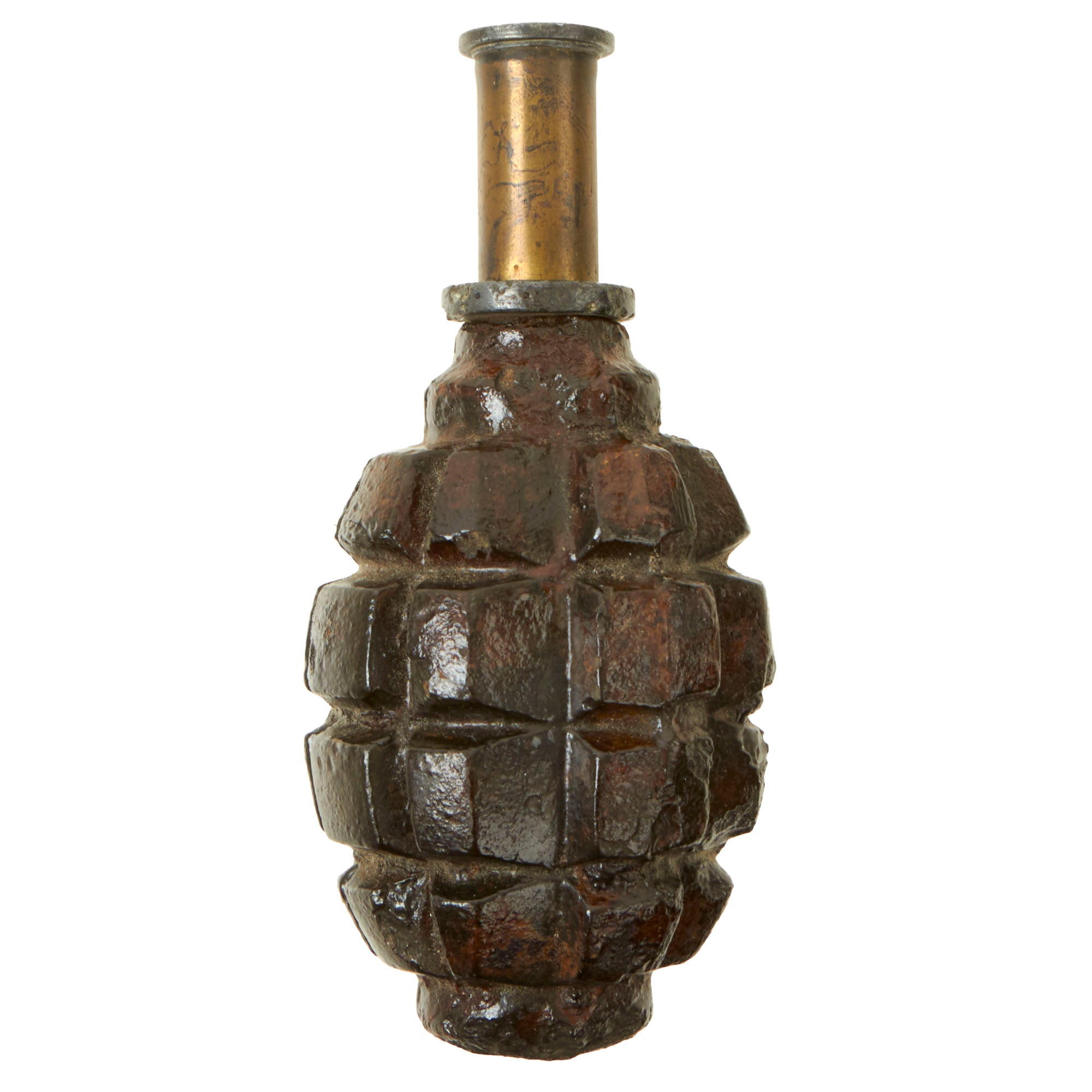 Original Item: Only One Available. This is a totally inert BATF compliant genuine World War One French F1 Grenade with an original fuse and cap. The grenade was rendered completely inert and is unable to be used as a destructive device. Like all deactivated ordnance, this is Not Available For Export.
