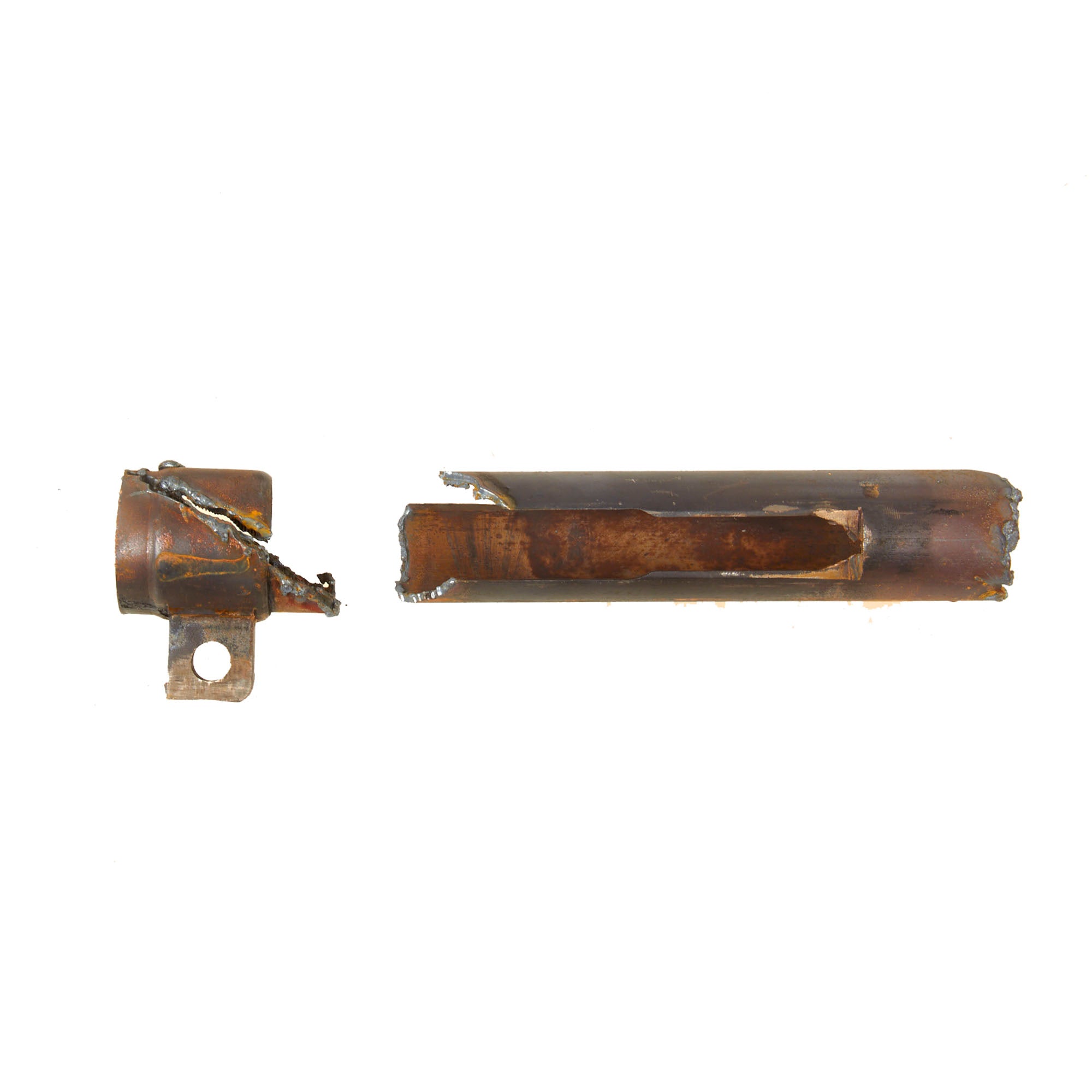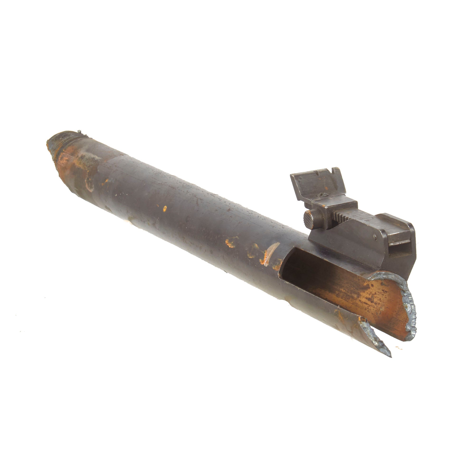 The relic is made up of the Chauchat’s receiver and barrel jacket, and when all four pieces are together, it measures roughly 40” long. It also includes the removable rear end cap with the recoil spring buffer still intact. This would look best mounted on the wall together, or could be a great start to making a BATF compliant display machine gun. The rear and front sights are both still intact, and the rear sight is still fully functional.
