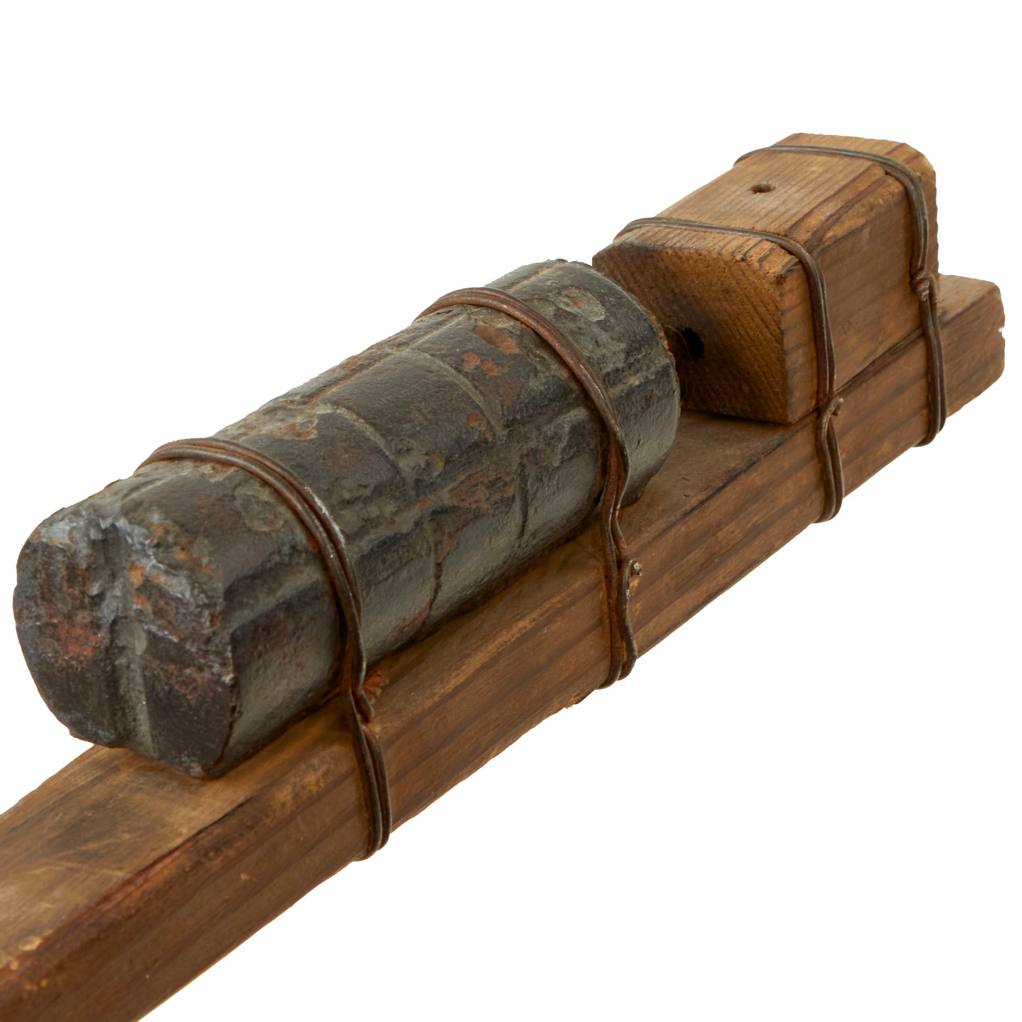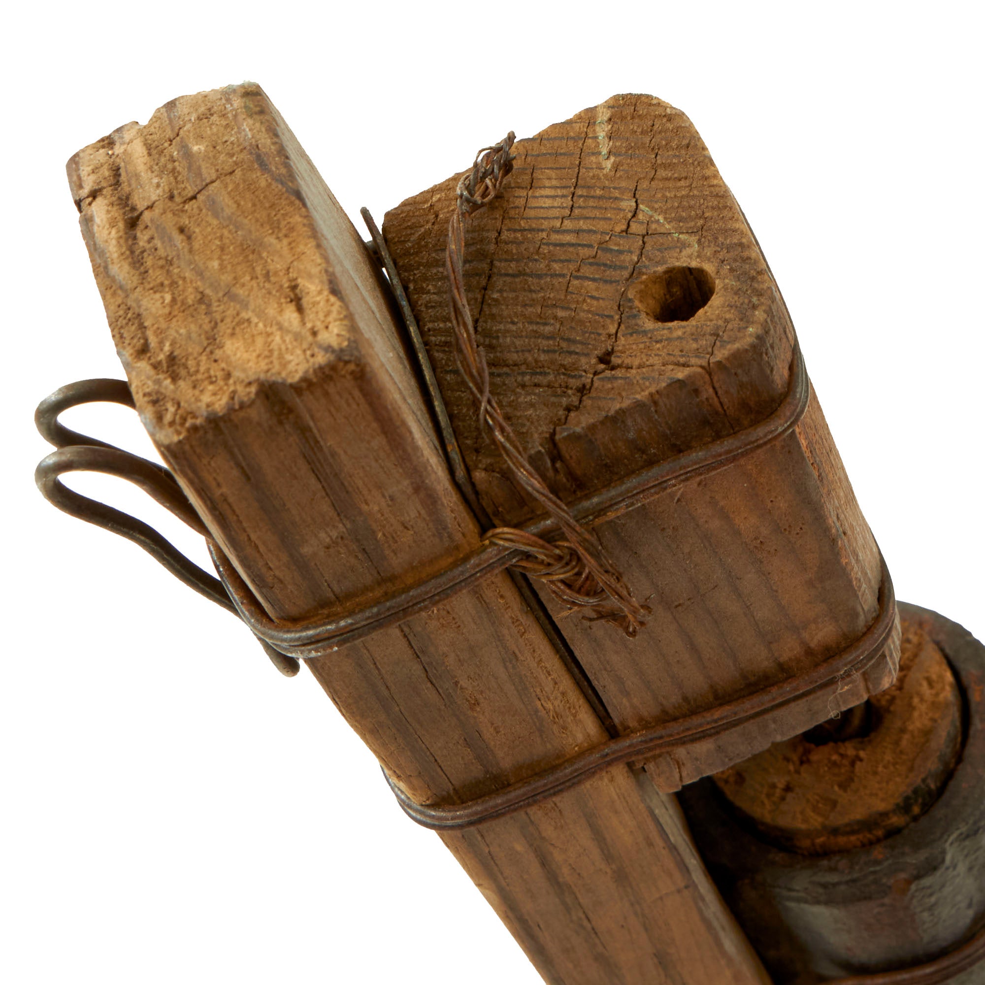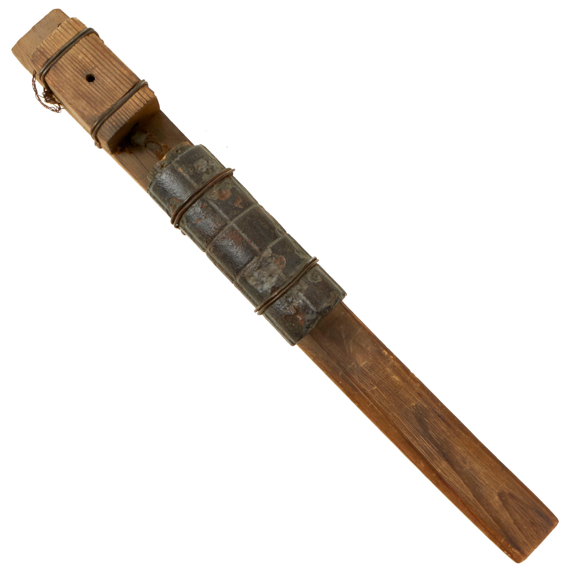 Original Item: Only One Available. This is a very nice French WWI IIIrd Army Stick Grenade (grenade de la troisième armée), which was basically an improvised design developed by factories during the first months of the war. These famous pétards or 'hairbrush grenades' were composed of a wooden paddle, cheddite explosive charge, and an explosive housing, often filled with nails or gravel. The design was made necessary by the low capacity of the French military armories to develop and manufacture more modern models of grenades rapidly enough to meet front line demand. This example has a new-made stick with the rest of the grenade being original.