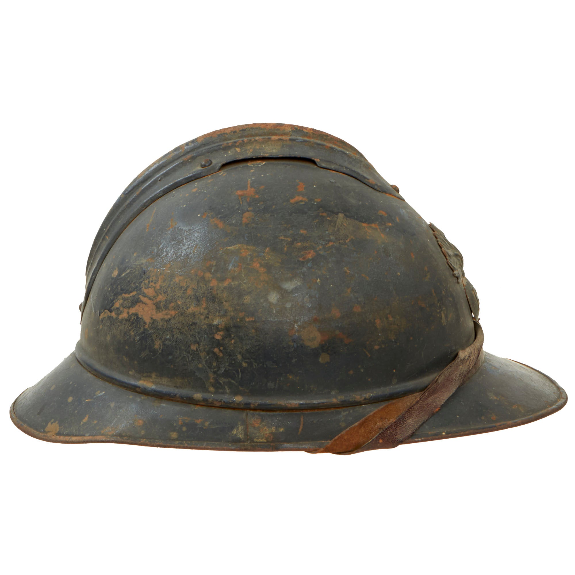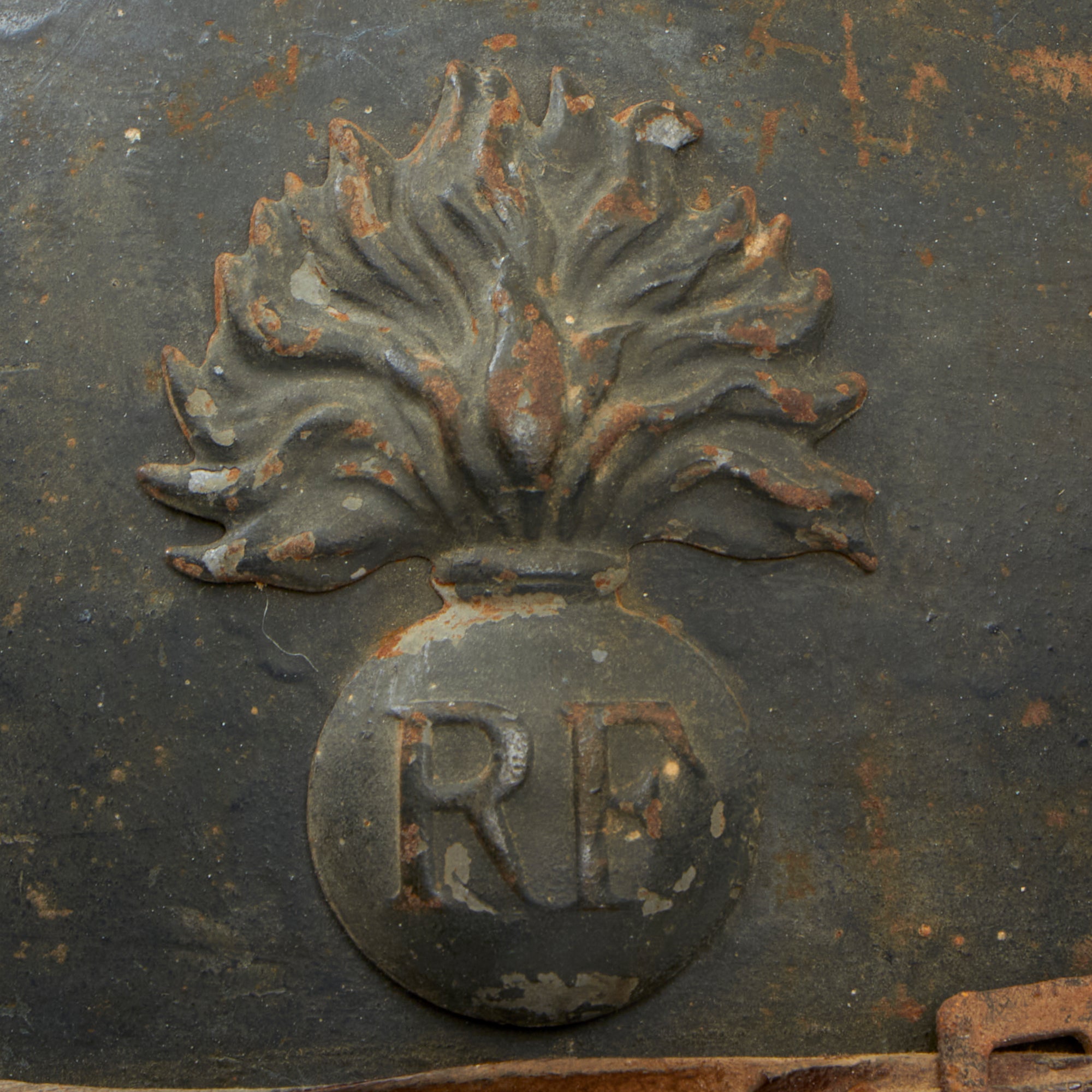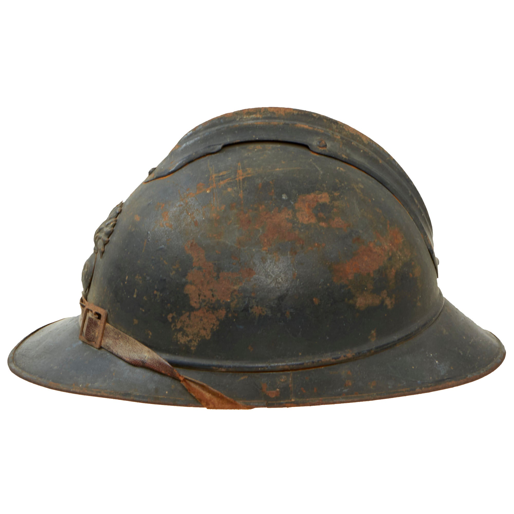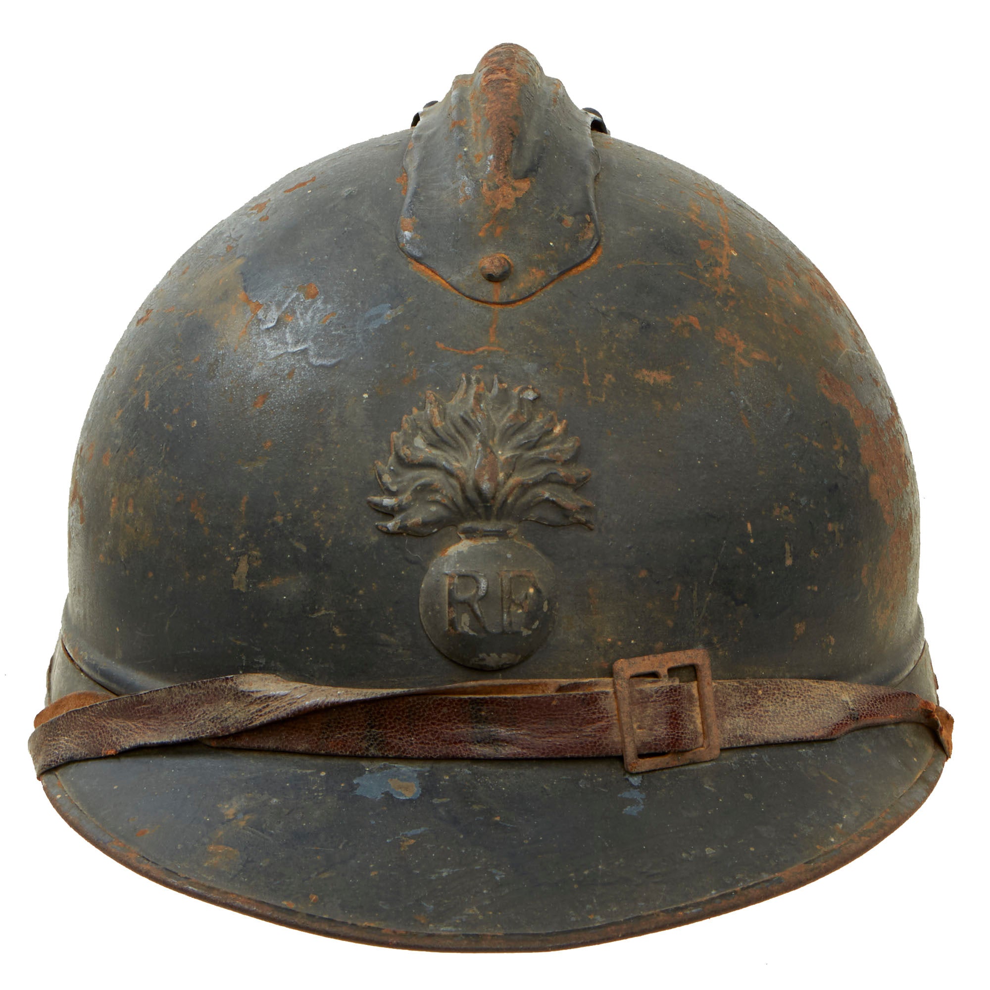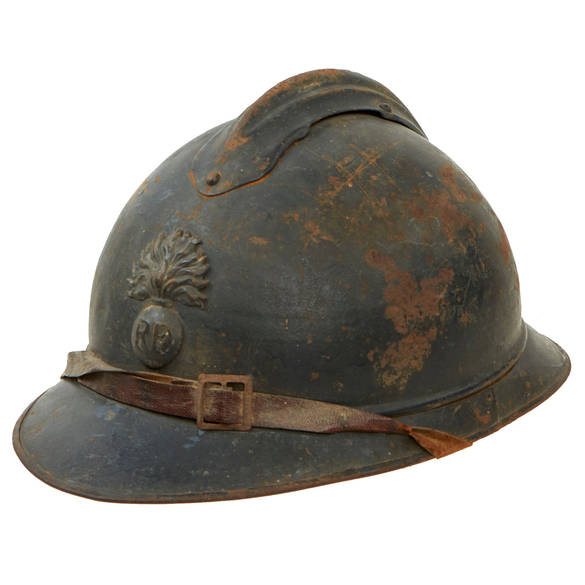 • Original Item: Only One Available. This is a nice example of a genuine World War I M-1915 French Army "Adrian" steel helmet, which looks to have seen long service. The front of the helmet still has its original French "Flaming Bomb" badge. The badge has the standard R F on the "bomb", for Republique Francaise. This is the badge used on standard Infantry issue helmets. The helmet shows signs of being repainted several times, which was not uncommon to see a few coats of paint on a helmet in the French Army, especially a helmet as early as this one.