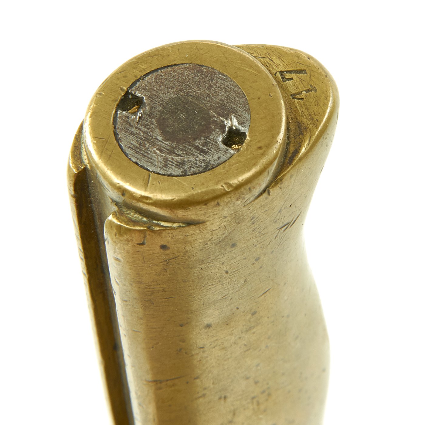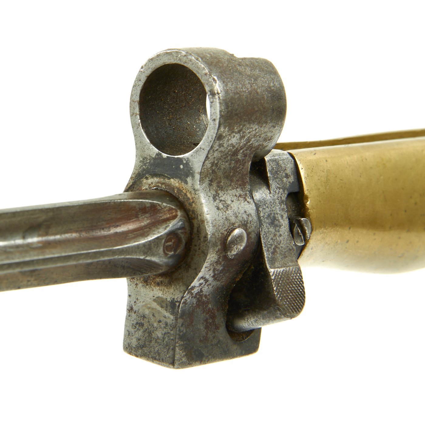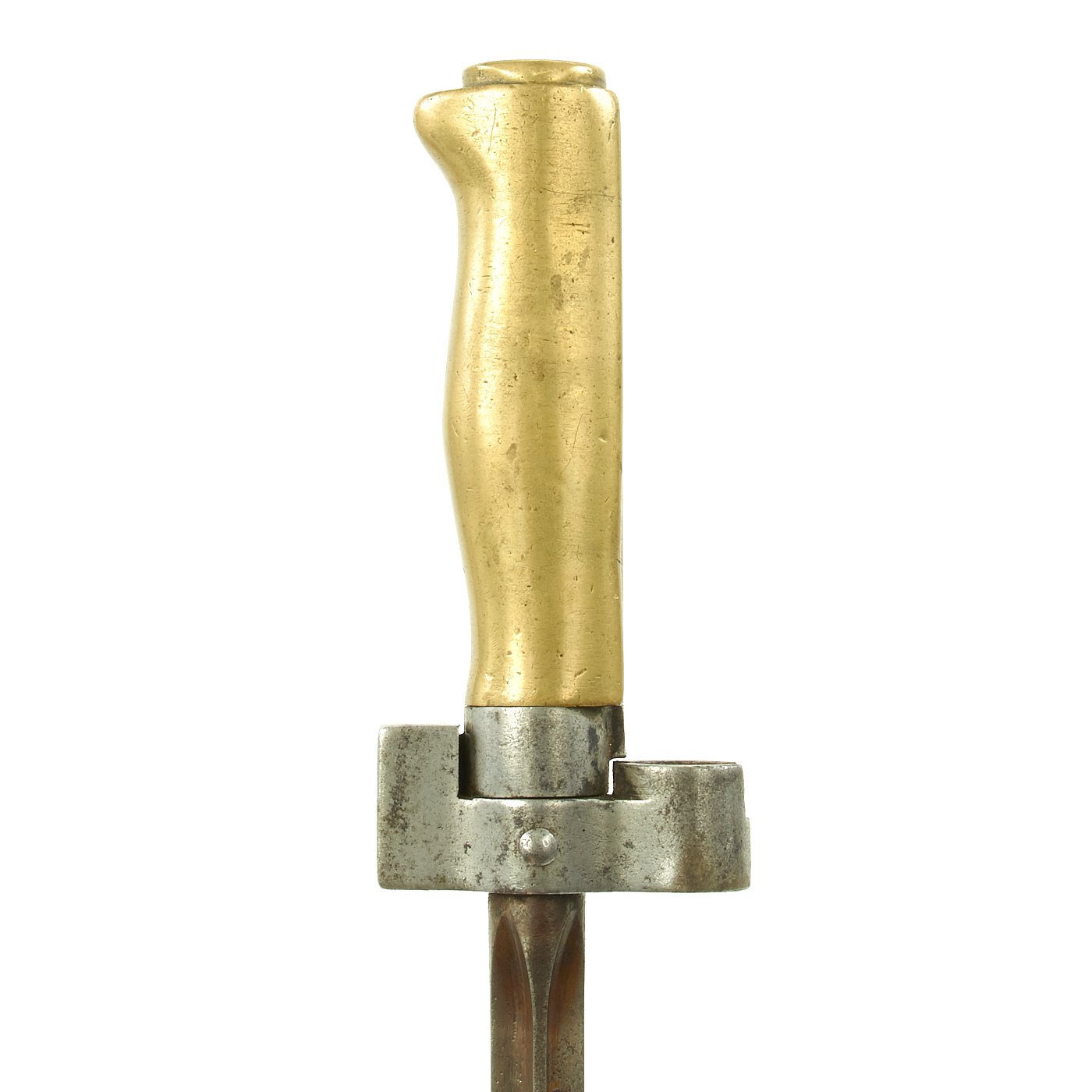 The bayonet design underwent many revisions during service history. The very first model is identified by a brass grip with a very small steel tang rod shown on the pommel of the bayonet. This was swiftly replaced with Nickel grip with a much larger tang nut one allowing easier disassembly of the bayonet in field workshops. After WWI had started, the need to conserve Nickel resulted in the grips being made again out of brass, which is what this example is. This bayonet also was shortened post 1916, so it now has a 13 1/4" long blade, with an overall length of 18".