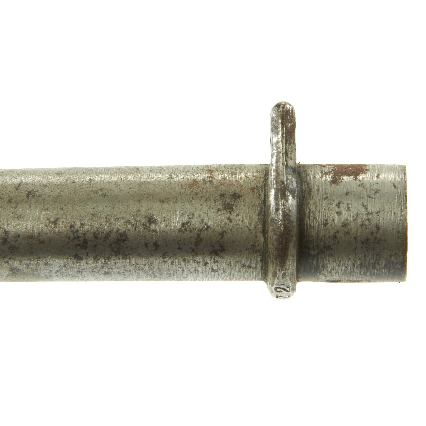 The bayonet is maker marked on the blade, however it is an unidentified private contractor marking. There is also serial number J P 16793 on the minimal crossguard. Condition is very good, with a lot of the original finish present, and a lovely patina on the hilt. There is some evidence of past pitting on the blade.