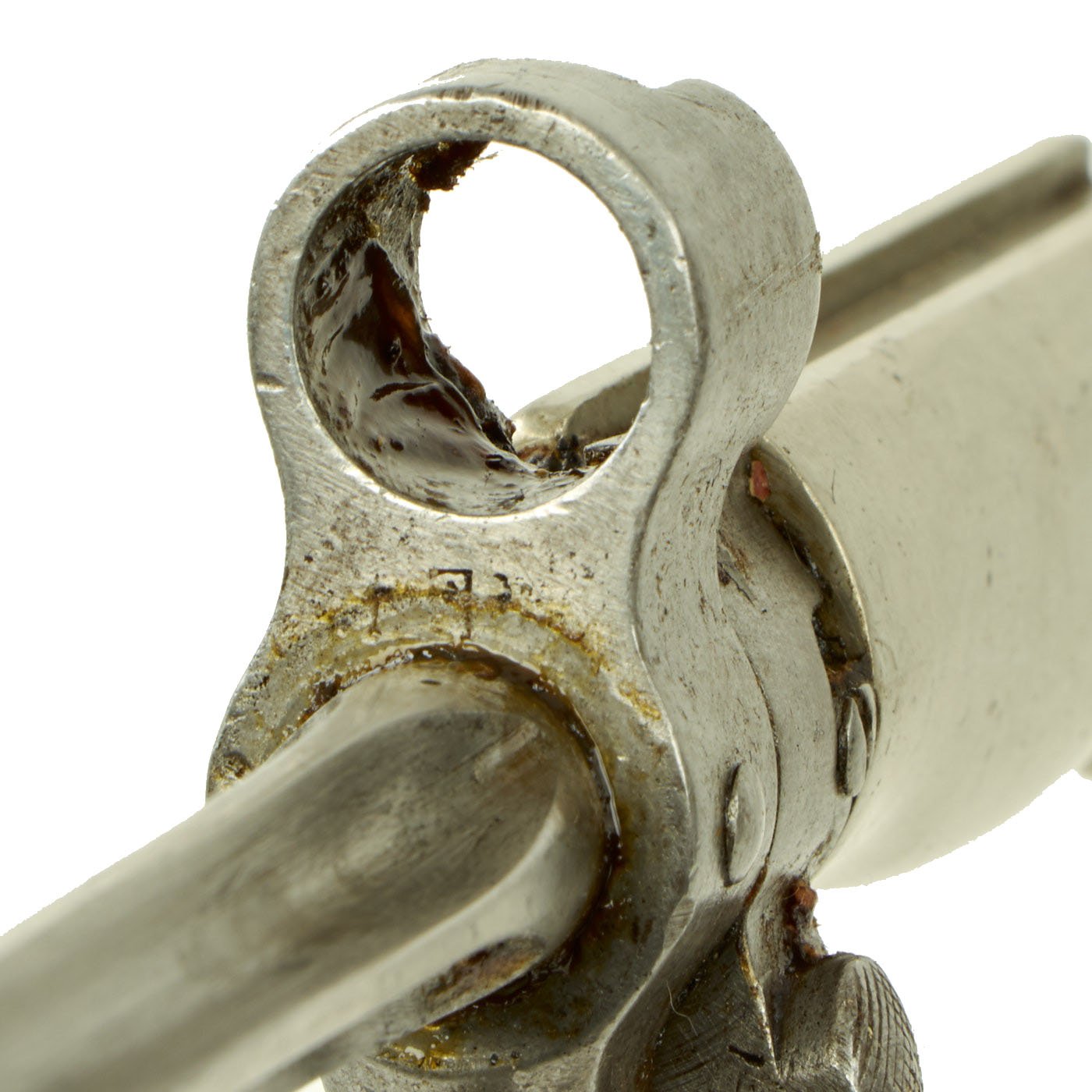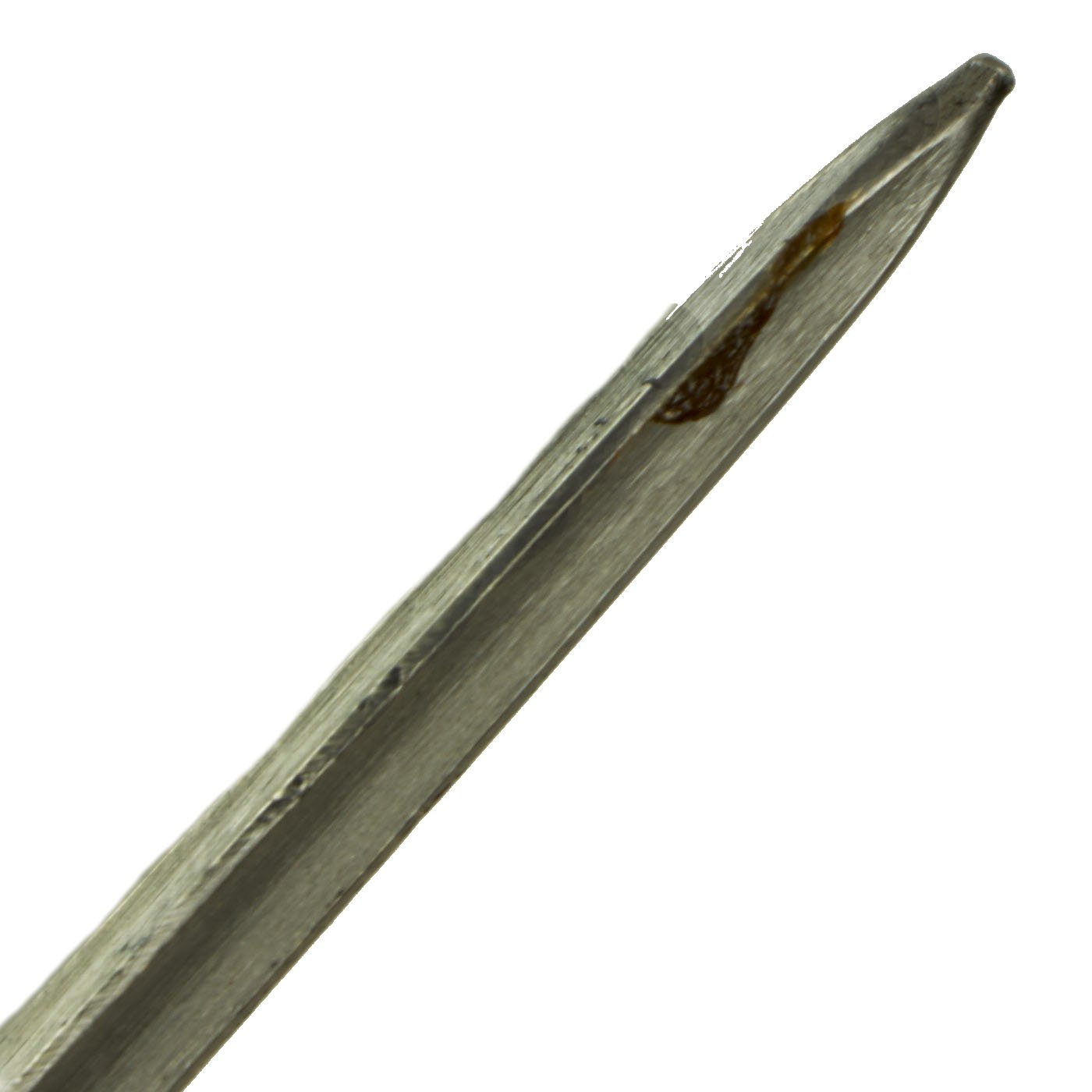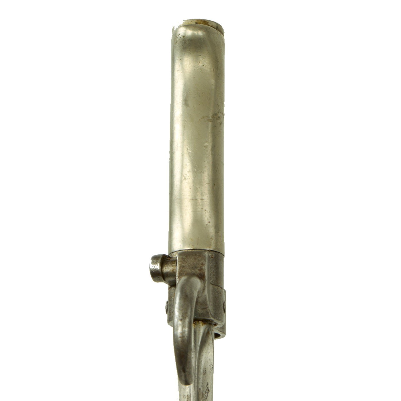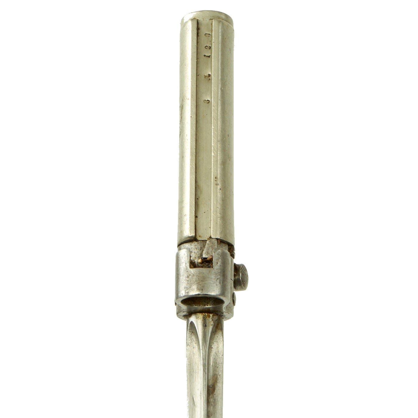 The bayonet design underwent many revisions during service history. The very first model is identified by a brass grip with a very small steel tang rod shown on the pommel of the bayonet. This was swiftly replaced with Nickel gripped version, which is what we have here. It has the correct early pattern round bayonet catch button and full hooked quillon. Unlike many, it was not cut down post war, and still retains its 20 1/2 inch long blade, with an overall length of 25 1/4 inches. For more information please see Watts & White The Bayonet Book, page 96, item 205.