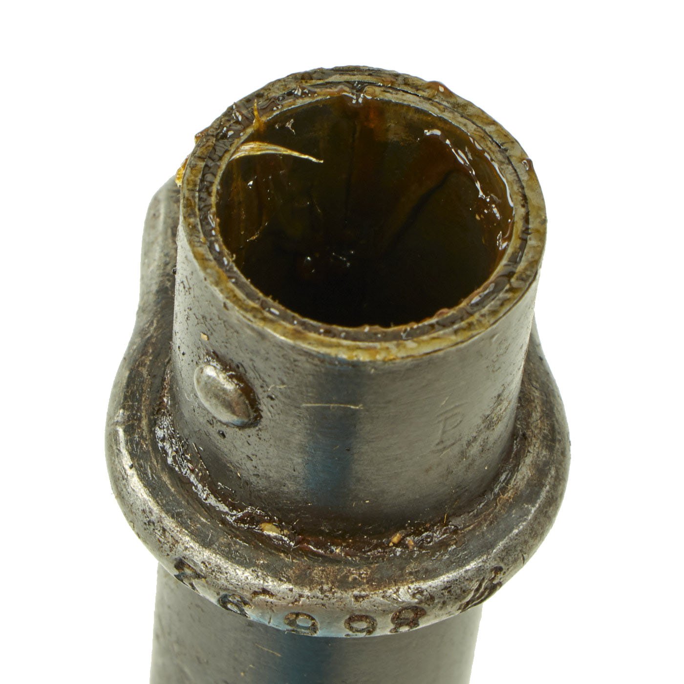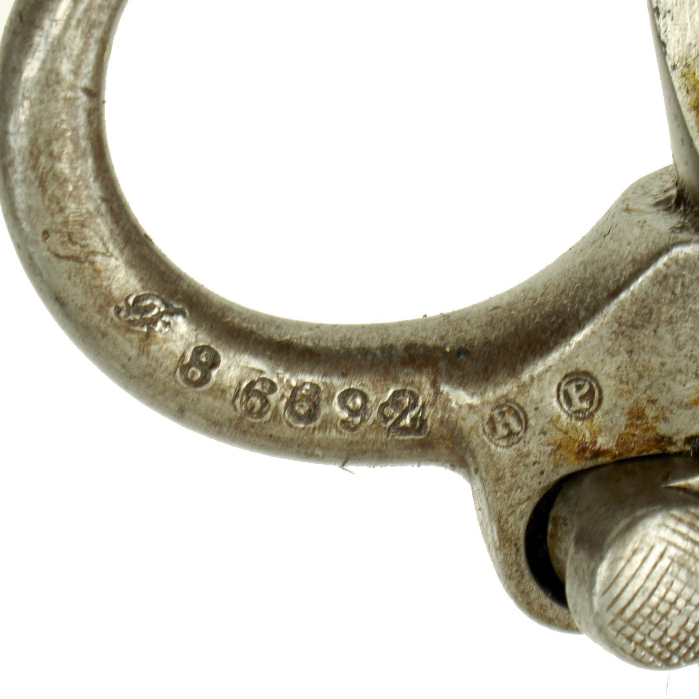 The bayonet is and scabbard are both marked with various proofs and maker marks, which we are unfortunately unable to identify. Both the bayonet and scabbard bear matching serial number F 86692, which is quite rare to see. Condition is very good, with a lot of the original finish present on the scabbard, and a lovely patina on the bayonet hilt. The blade is bright steel with very little sign of oxidation, and is still partly covered in original grease.