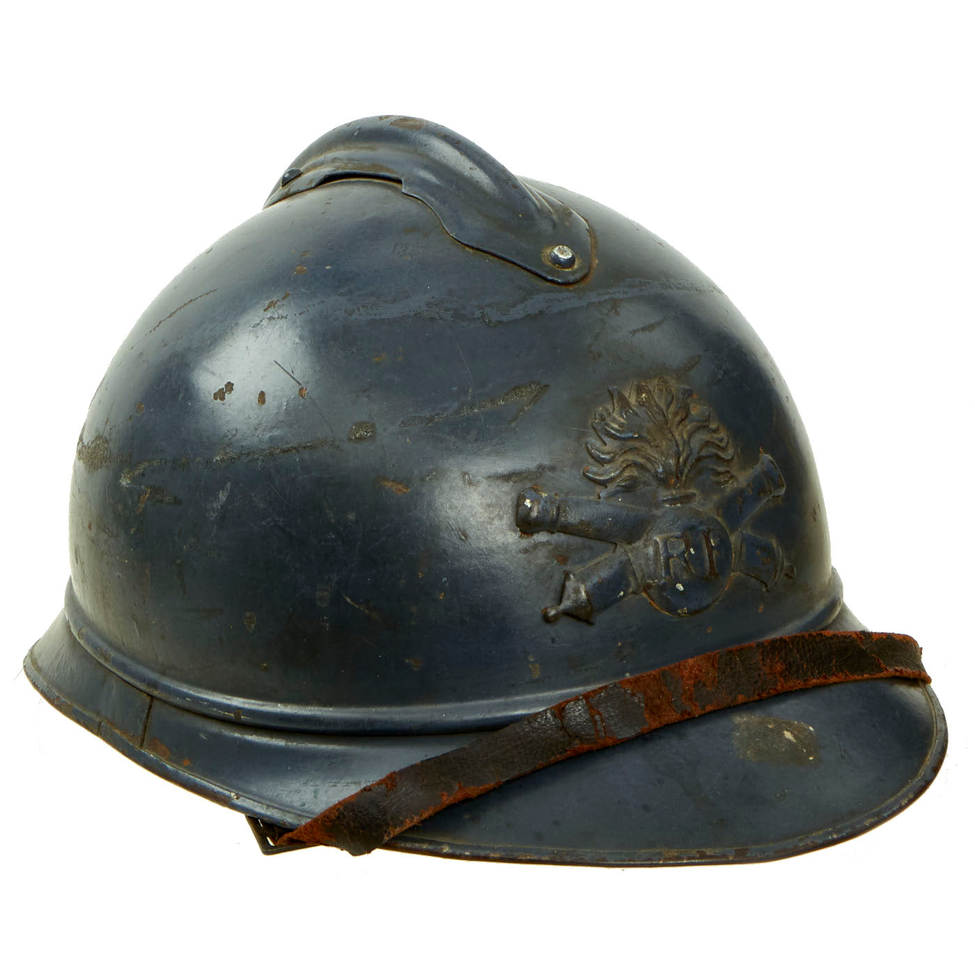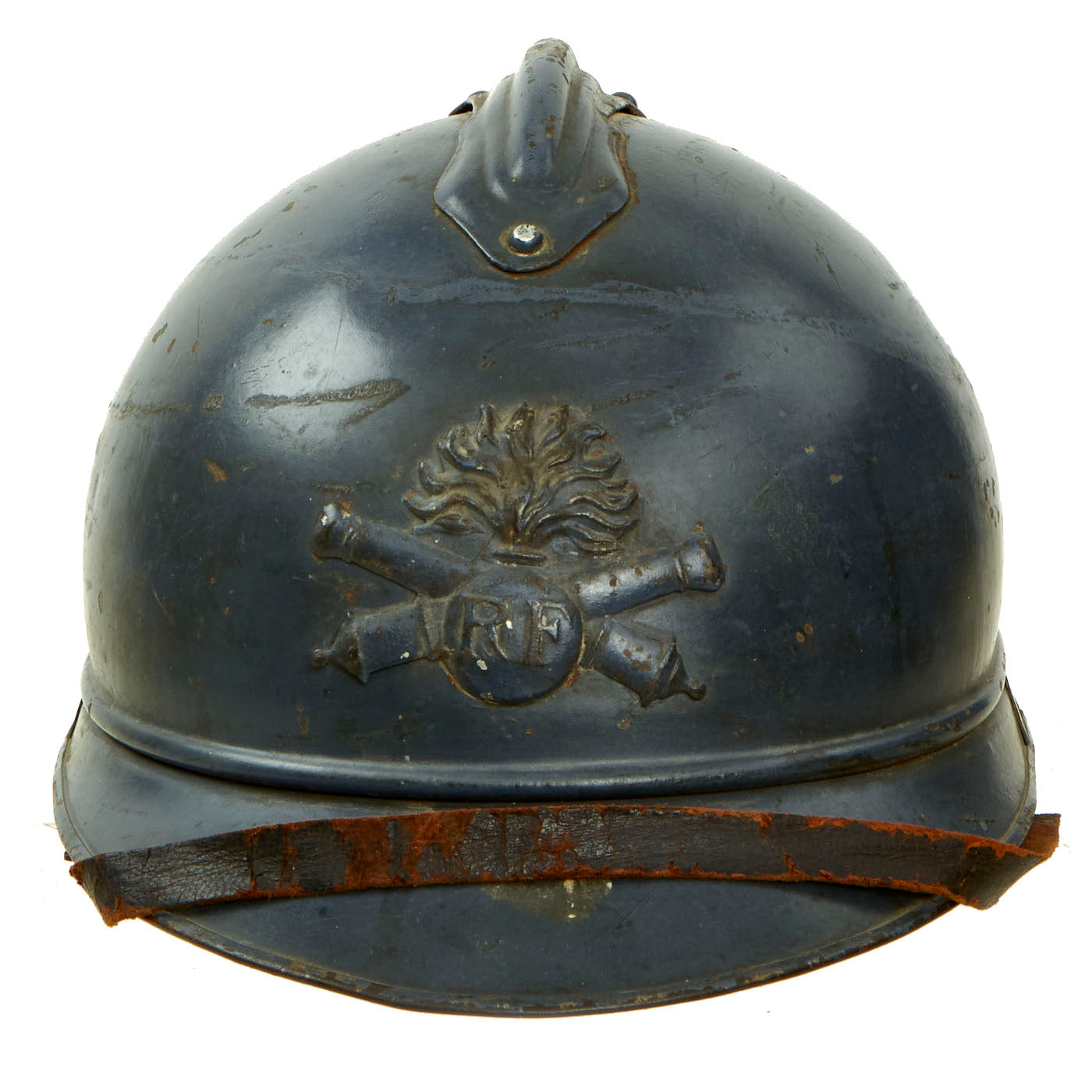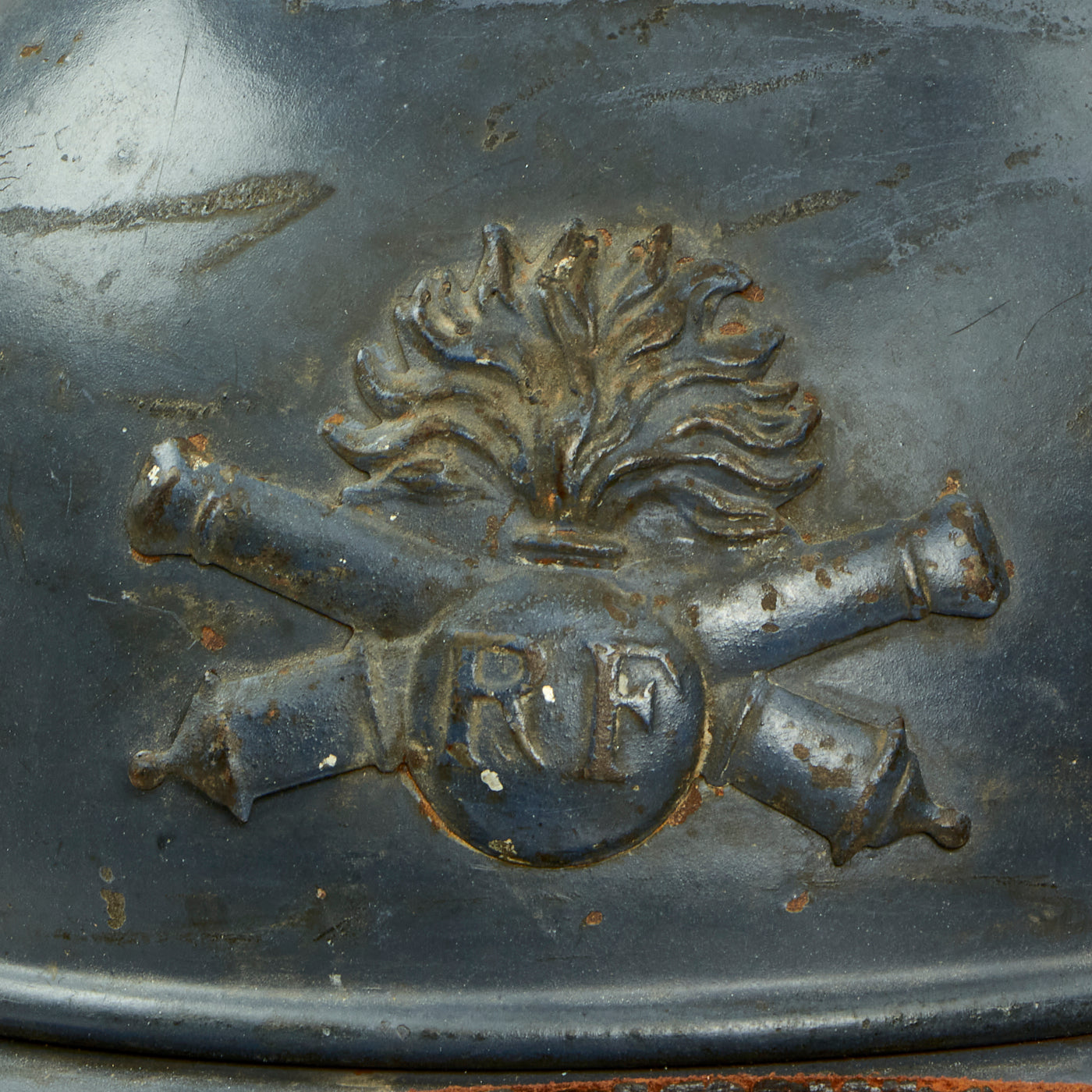 Original Item: Only One Available. This is an excellent genuine World War I M1915 French Army Artillery "Adrian" helmet. The helmet retains the original factory applied "dark horizon blue" paint and has the French Army Artillery Plate with large bomb insignia, crossed cannons and R F (for Republique Francaise) to the front, indicating it was for use in an Artillery Unit.