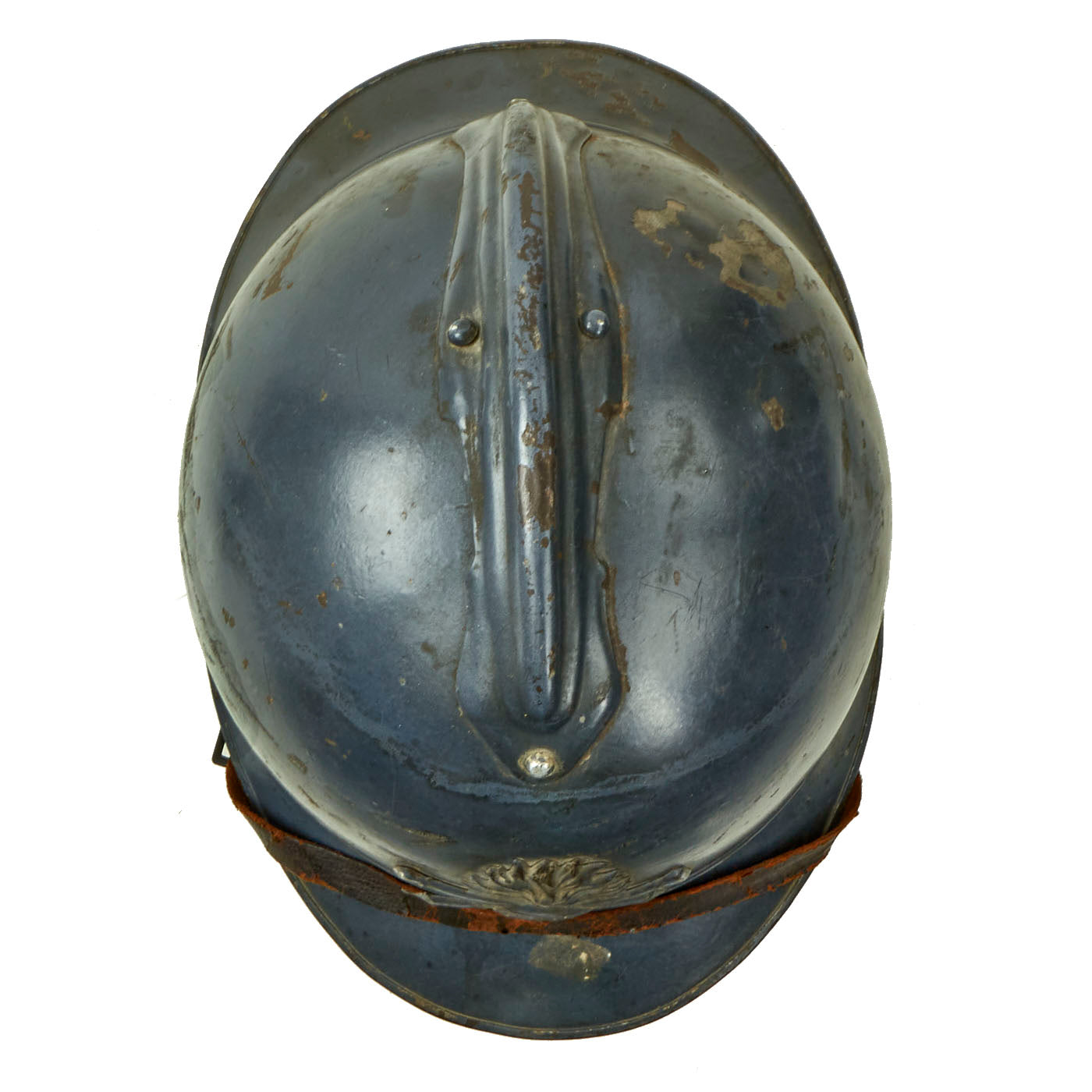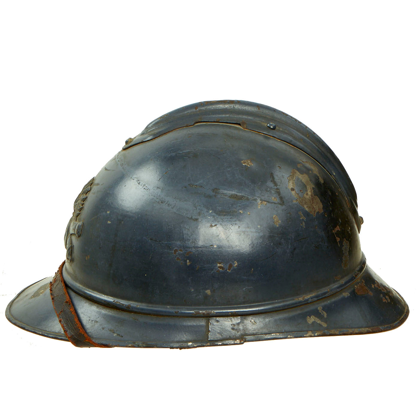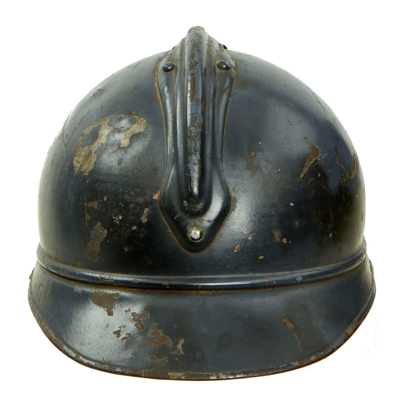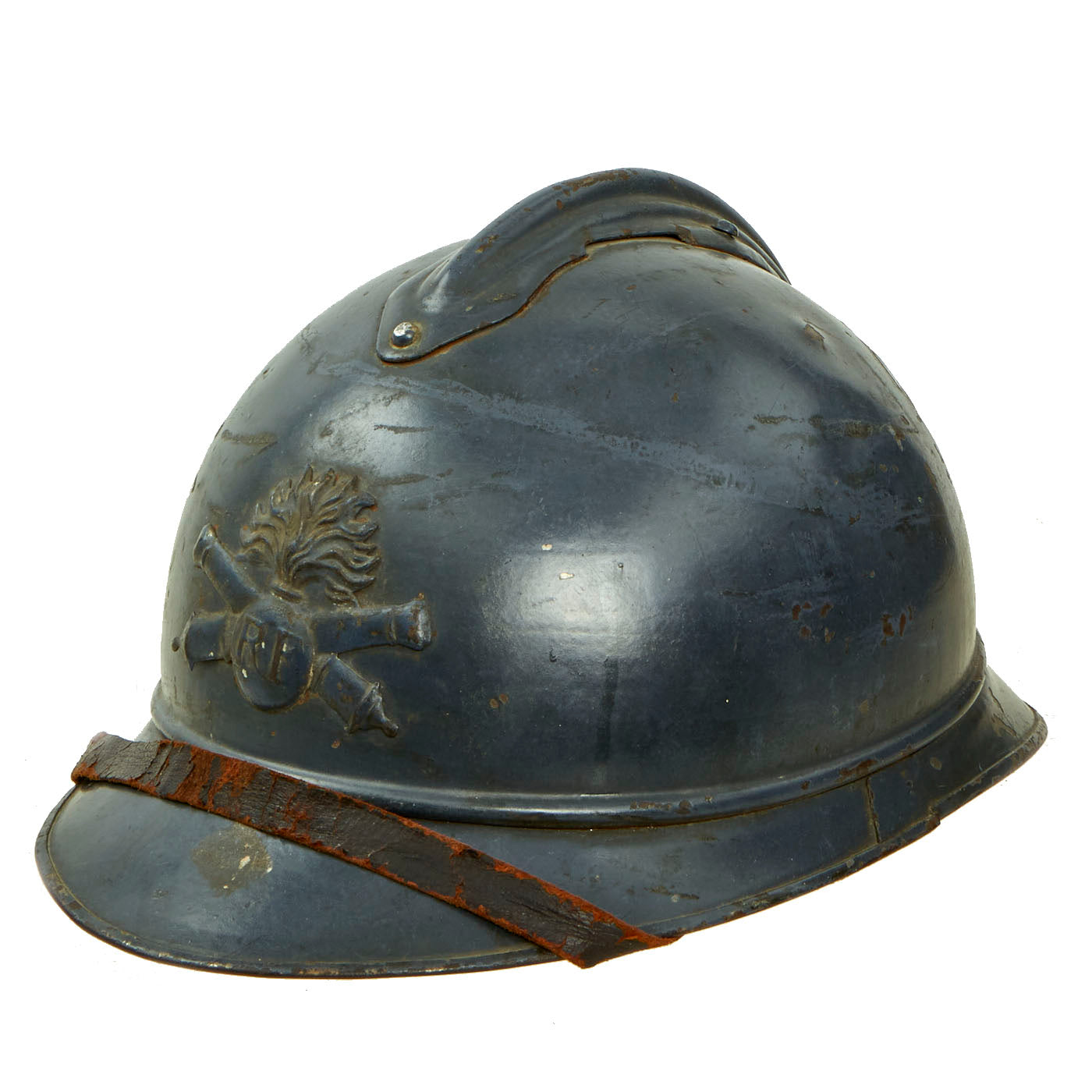 Original Item: Only One Available. This is an excellent genuine World War I M1915 French Army Artillery "Adrian" helmet. The helmet retains the original factory applied "dark horizon blue" paint and has the French Army Artillery Plate with large bomb insignia, crossed cannons and R F (for Republique Francaise) to the front, indicating it was for use in an Artillery Unit.
