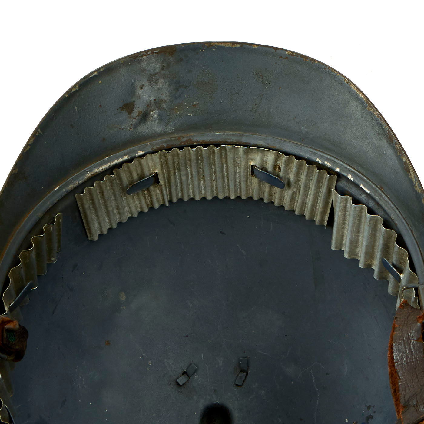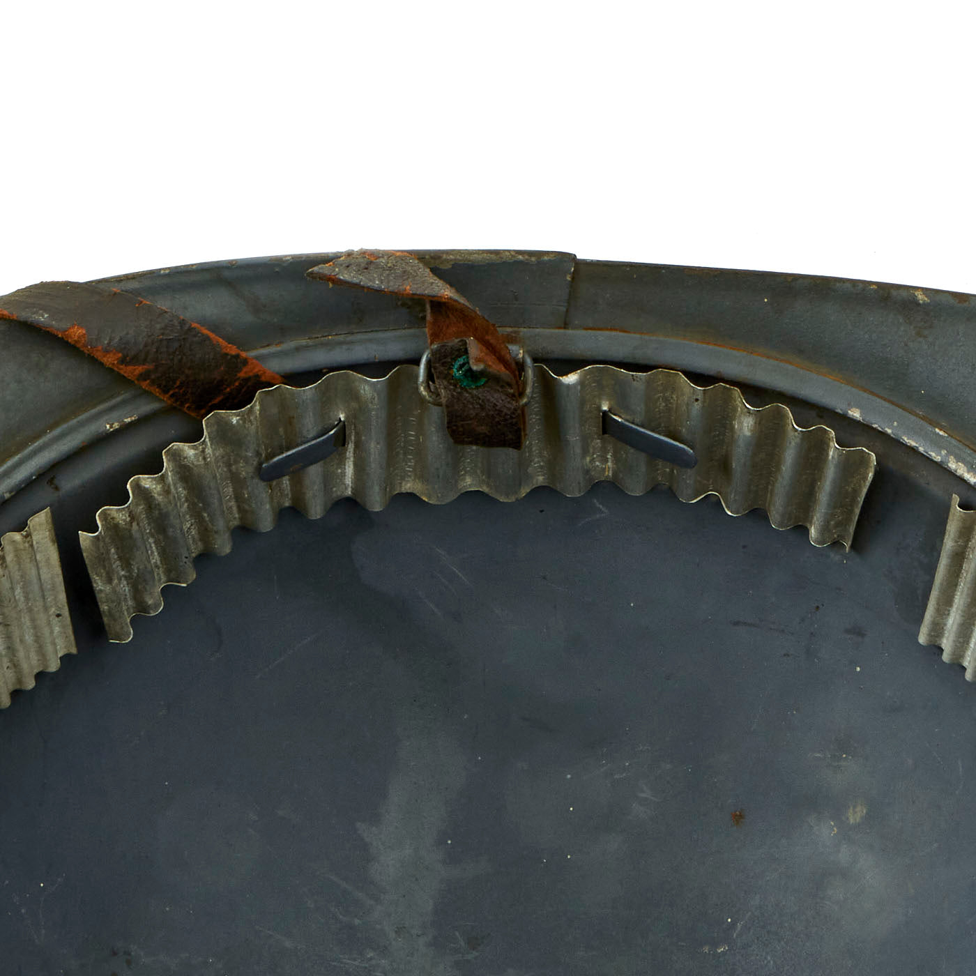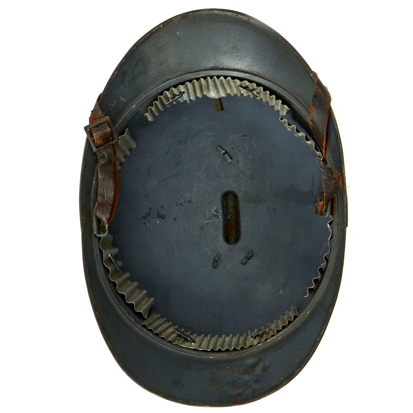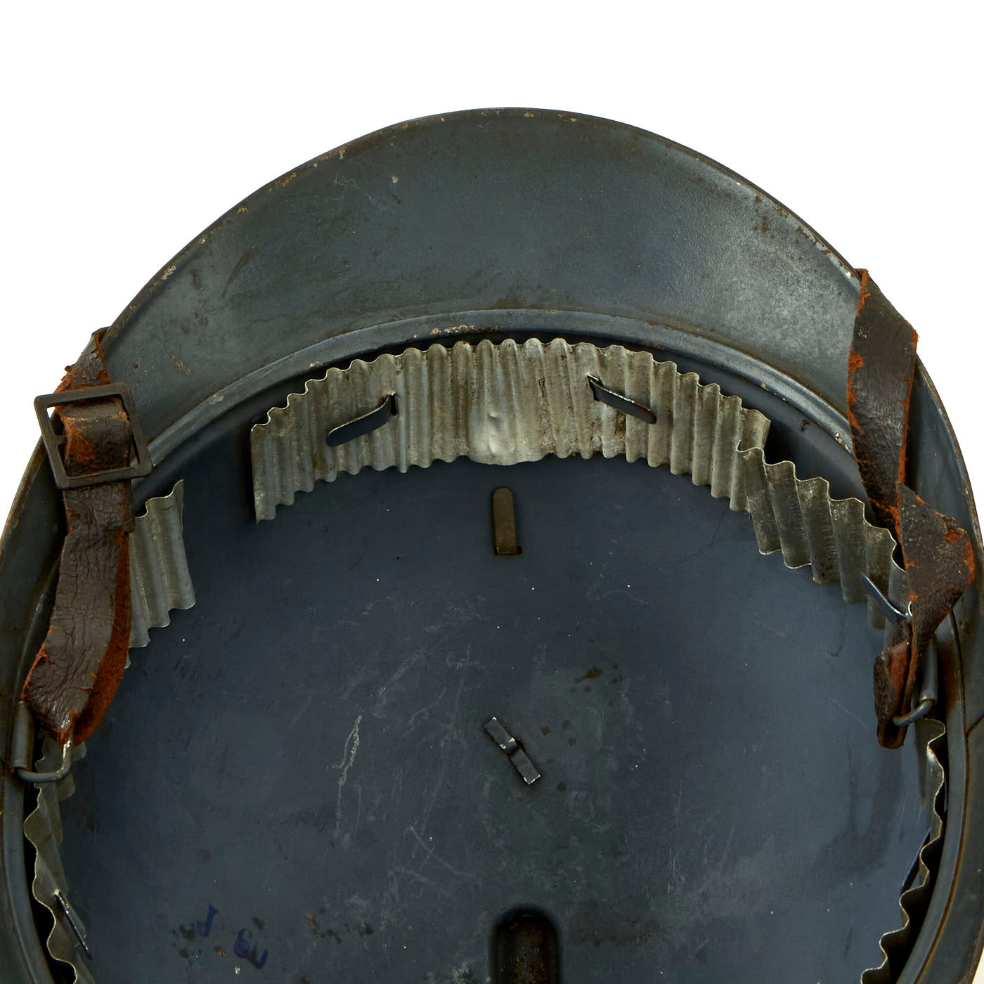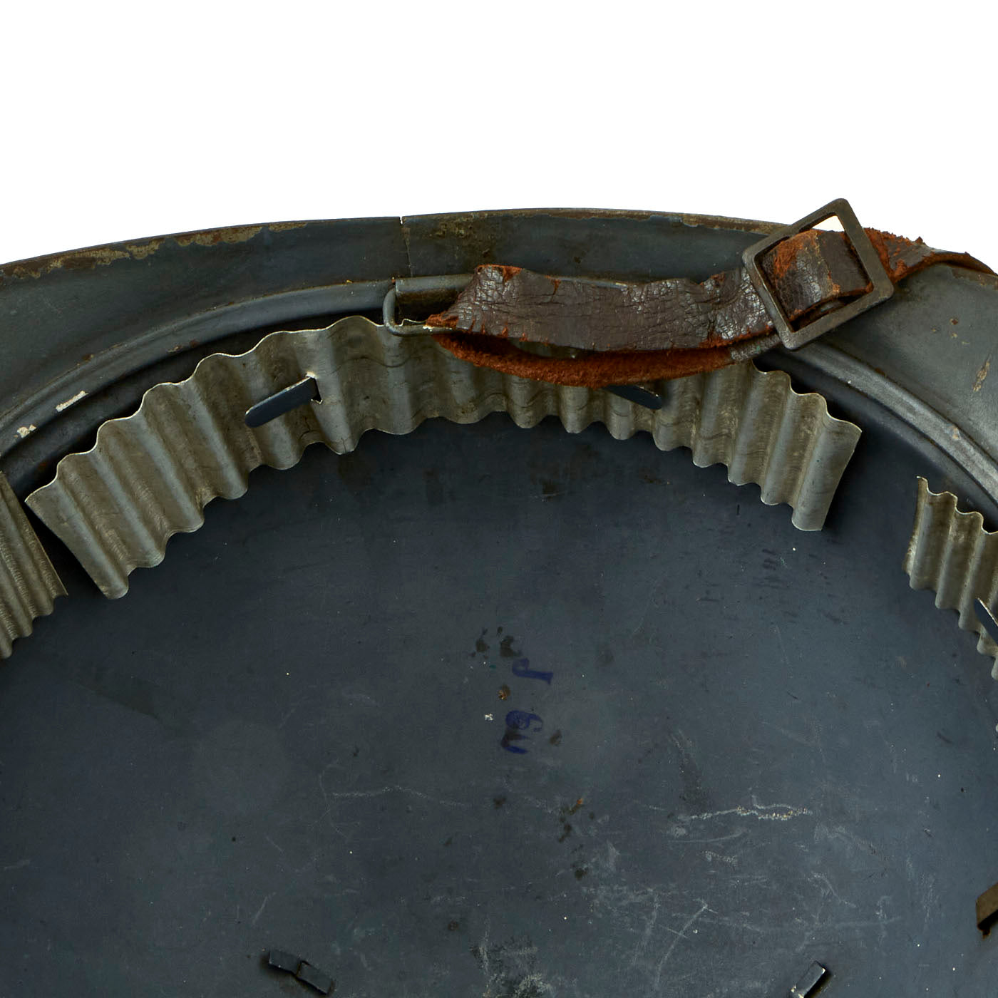 The Size is approximately US 7 ½ (shell is marked size 60cm), and it features its original leather chinstrap. Although broken, the chinstrap displays nicely! Shell is ink stamped “J 60” inside the crown. All of the original corrugated aluminum liner spacers are still present. Overall condition of the helmet is very good, shell shows some minor dings, paint ships and areas of minor surface rust.