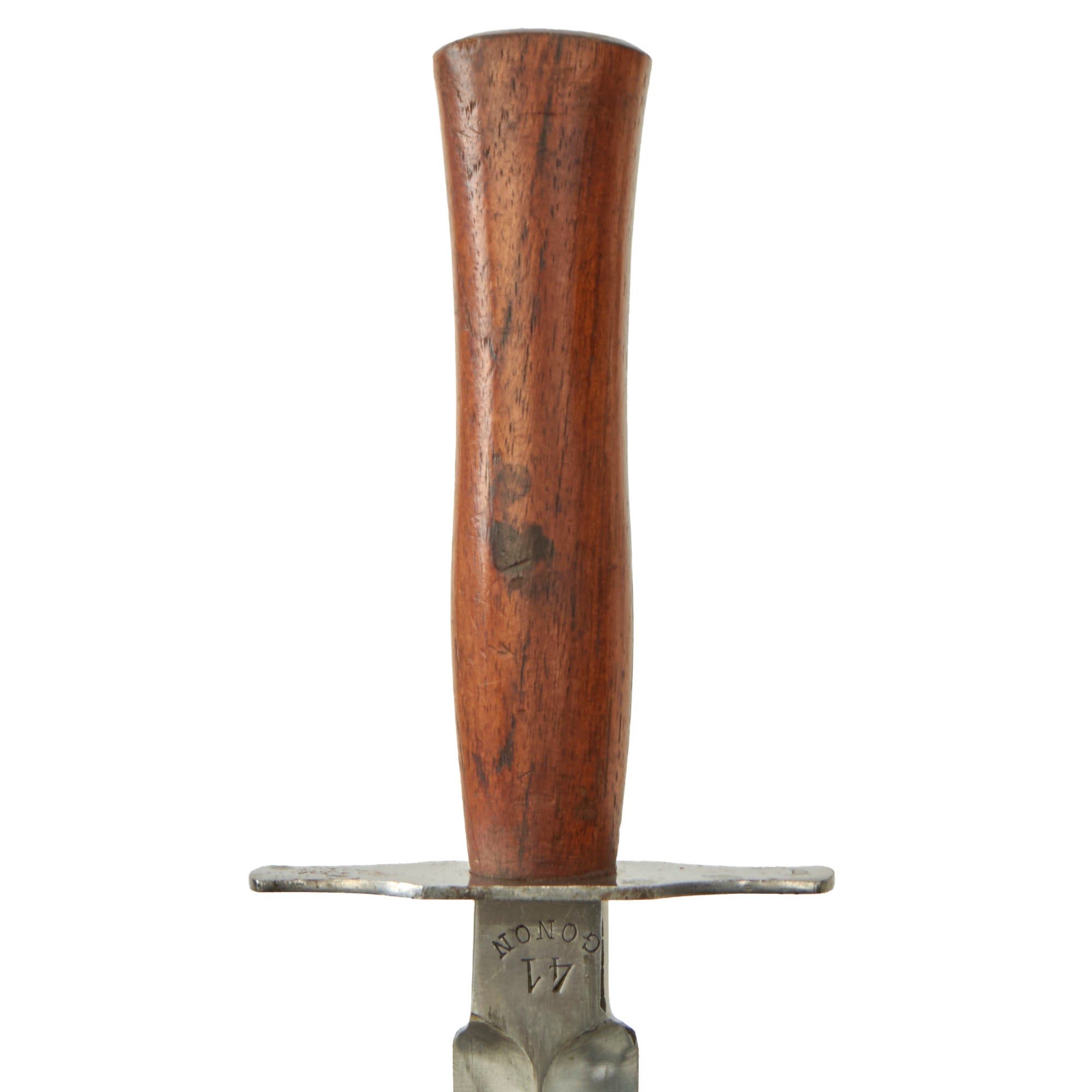 Original Item: Only One Available. This is a very nice example of the French WWI M1916 type 2 Fighting Knife, pattern 41 made by GONON, as marked on the blade ricasso. It comes complete with its original black painted steel scabbard. These are often called Le Vengeur de 1870 (The Avenger of 1870), in reference to the lost war against the Prussian Army in 1870. After the defeat of France in 1940 the Germans captured large quantities M1916's and these were then used in Norway. The M1916 knife was also tested in Sweden during the immediate post war years. This knife is in great shape overall.