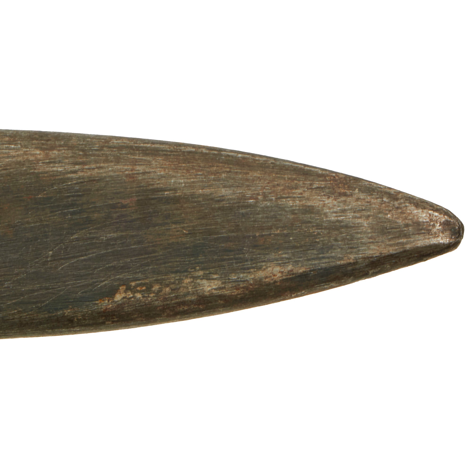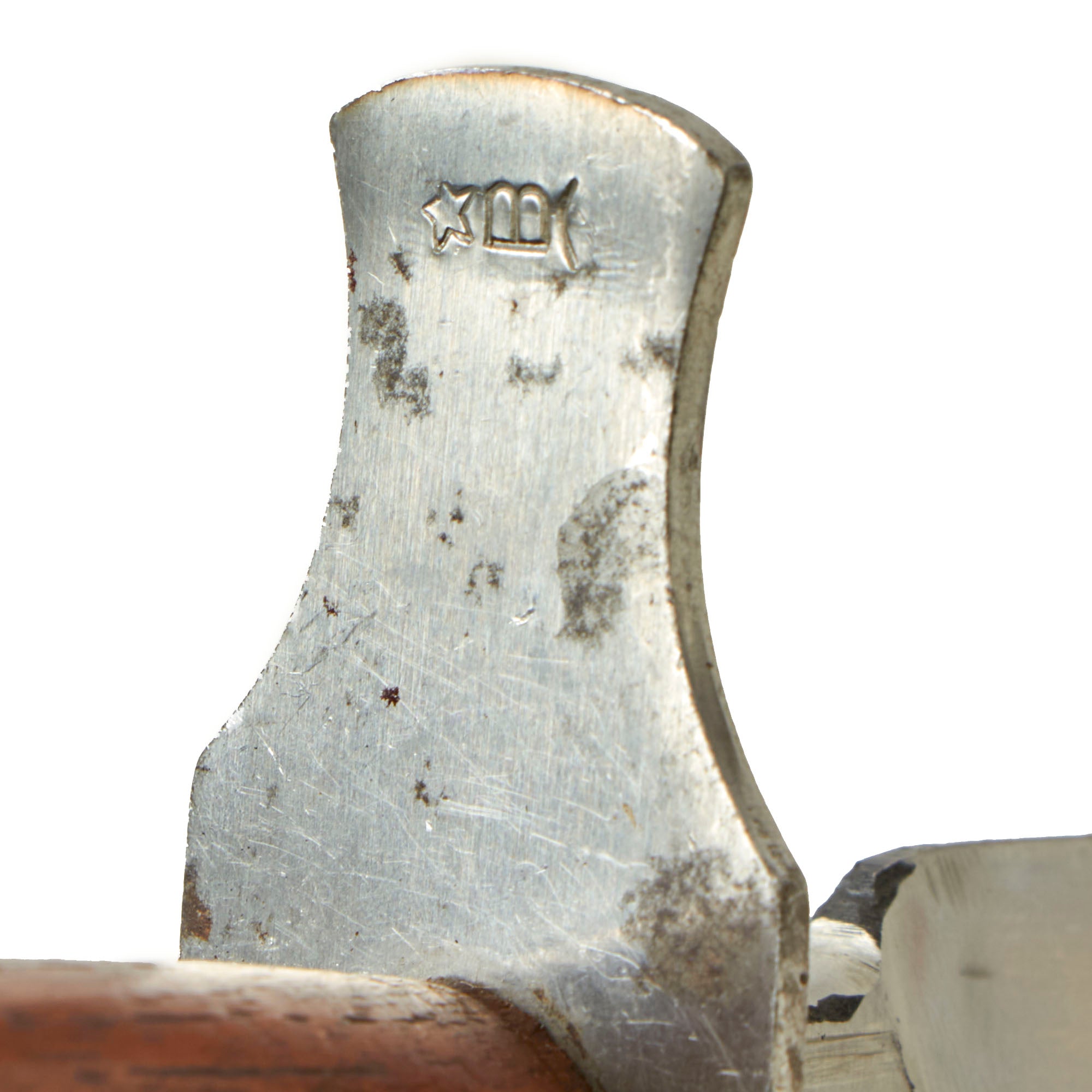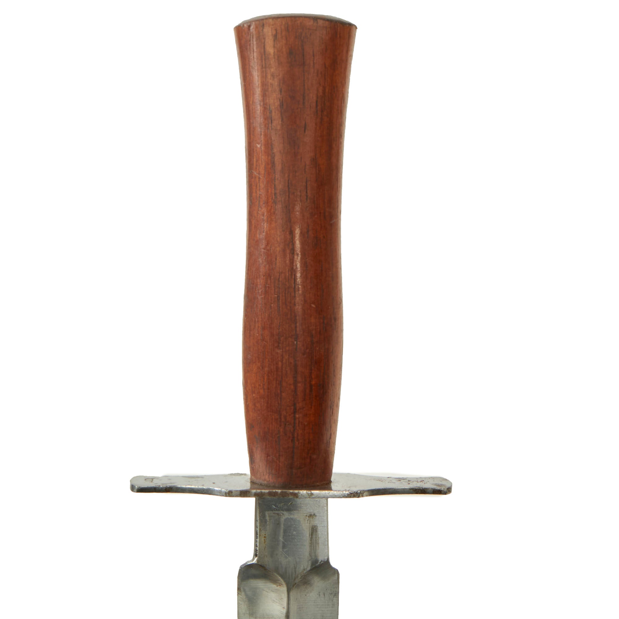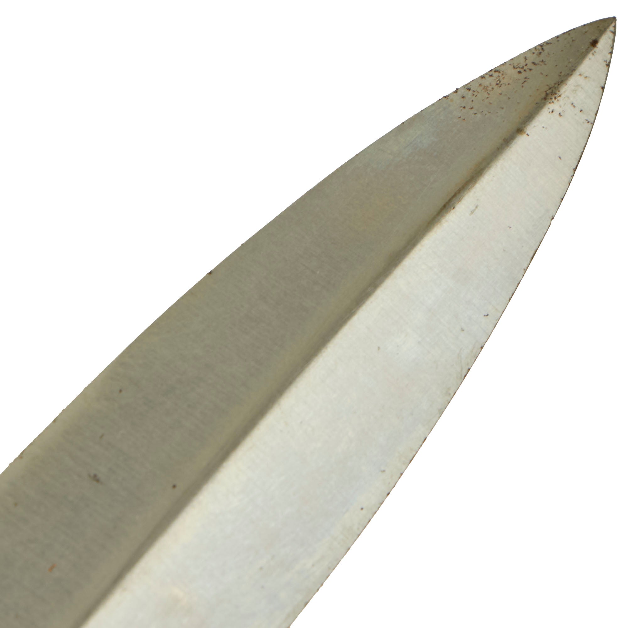 The blade design on these knives is quite similar to that of the U.S. Mark 1 Trench knife, with a 6 1/2 inch long double-edged spear point shape, out of the overall length of 11 inches. This example still bears nearly all of the original factory final grind cross grain, with some light staining from age. The blade also has been sharpened post-factory, but not to a large extent. The blade marking is extremely clear.