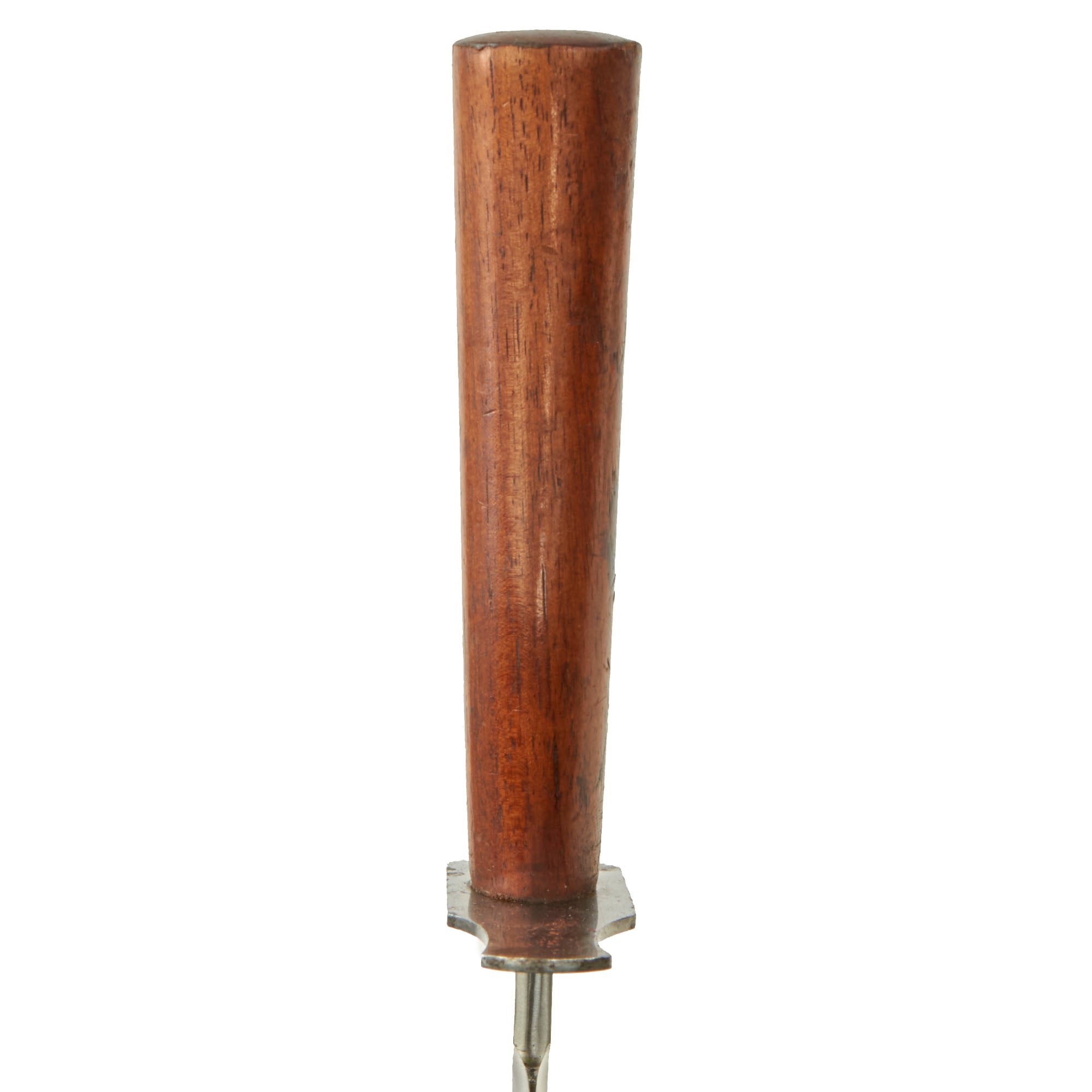 The flat steel crossguard remains nice and straight, though it does have staining and light oxidation on the unfinished steel. The nicely toned walnut grip has a great color and grain with no cracks, chips, or major dents. The handle is solid with no play on the tang.