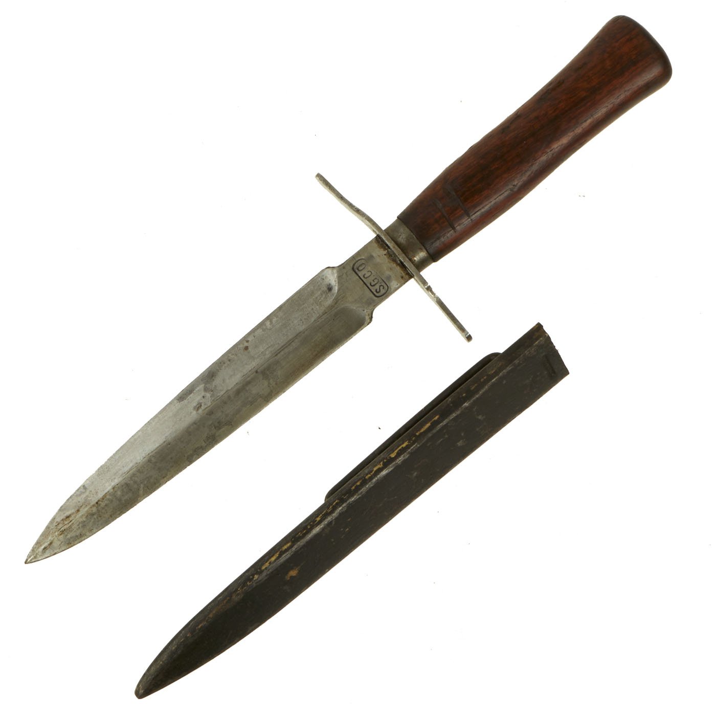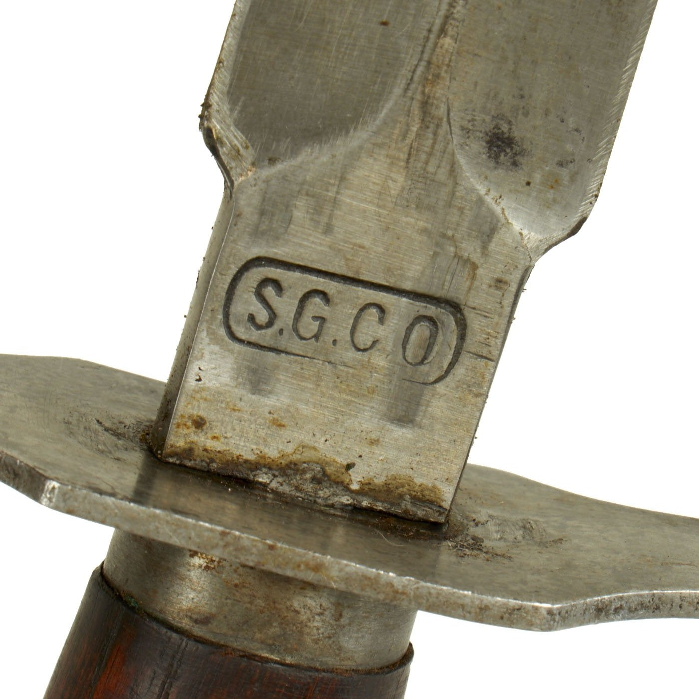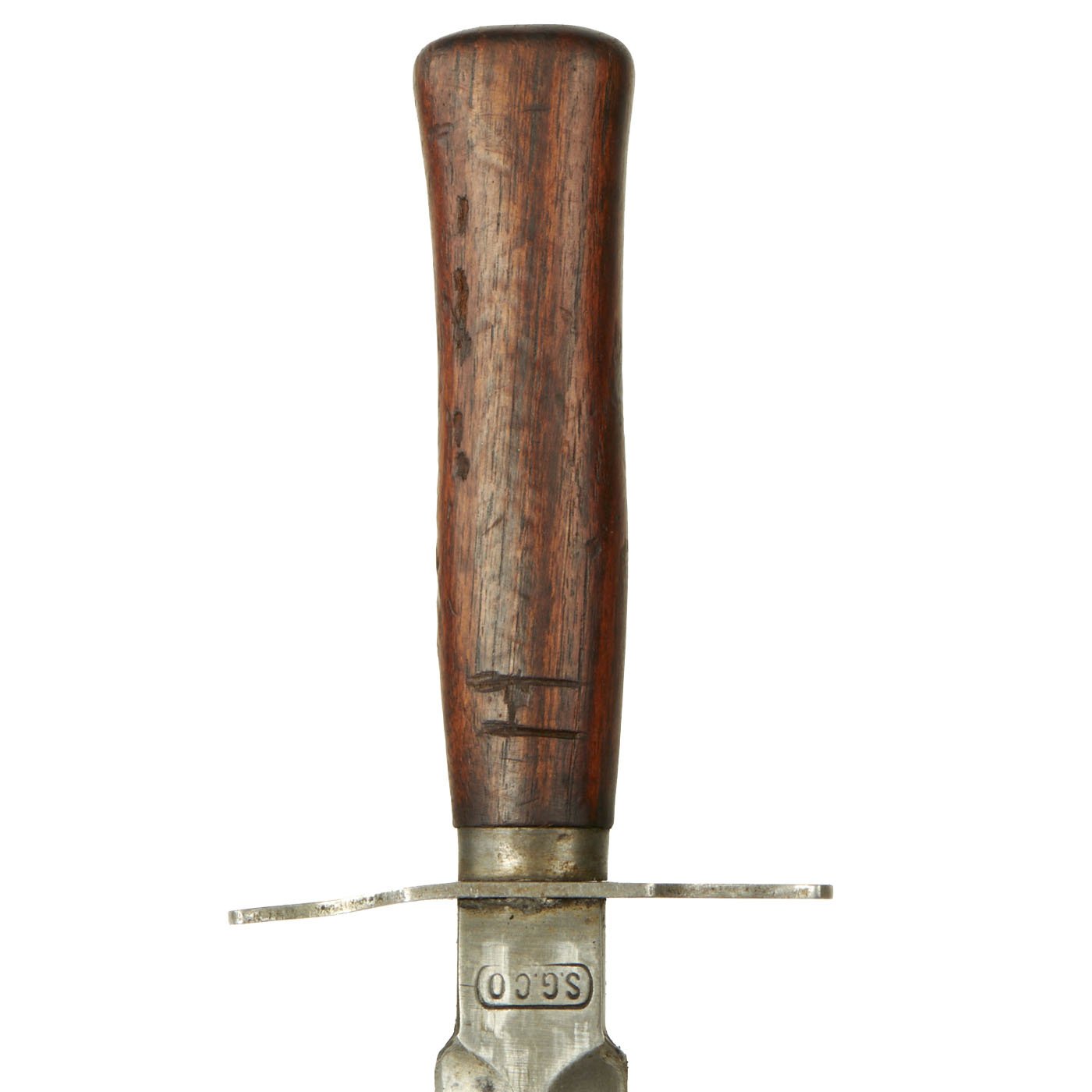Original Item: Only One Available. This is a very nice example of the French WWI M1916 type 2 Fighting Knife, pattern 41 made by S.G.C.O., as marked on the blade ricasso. It comes complete with its original blued steel scabbard.