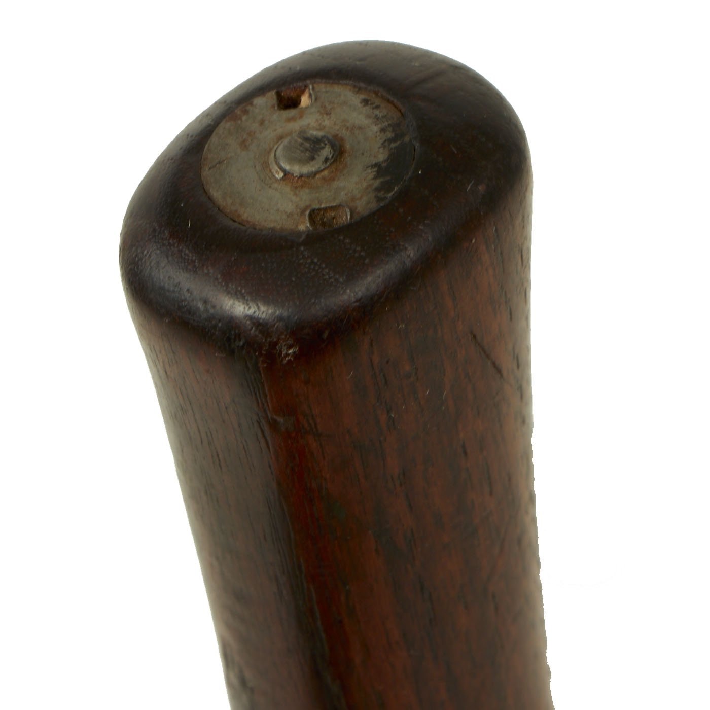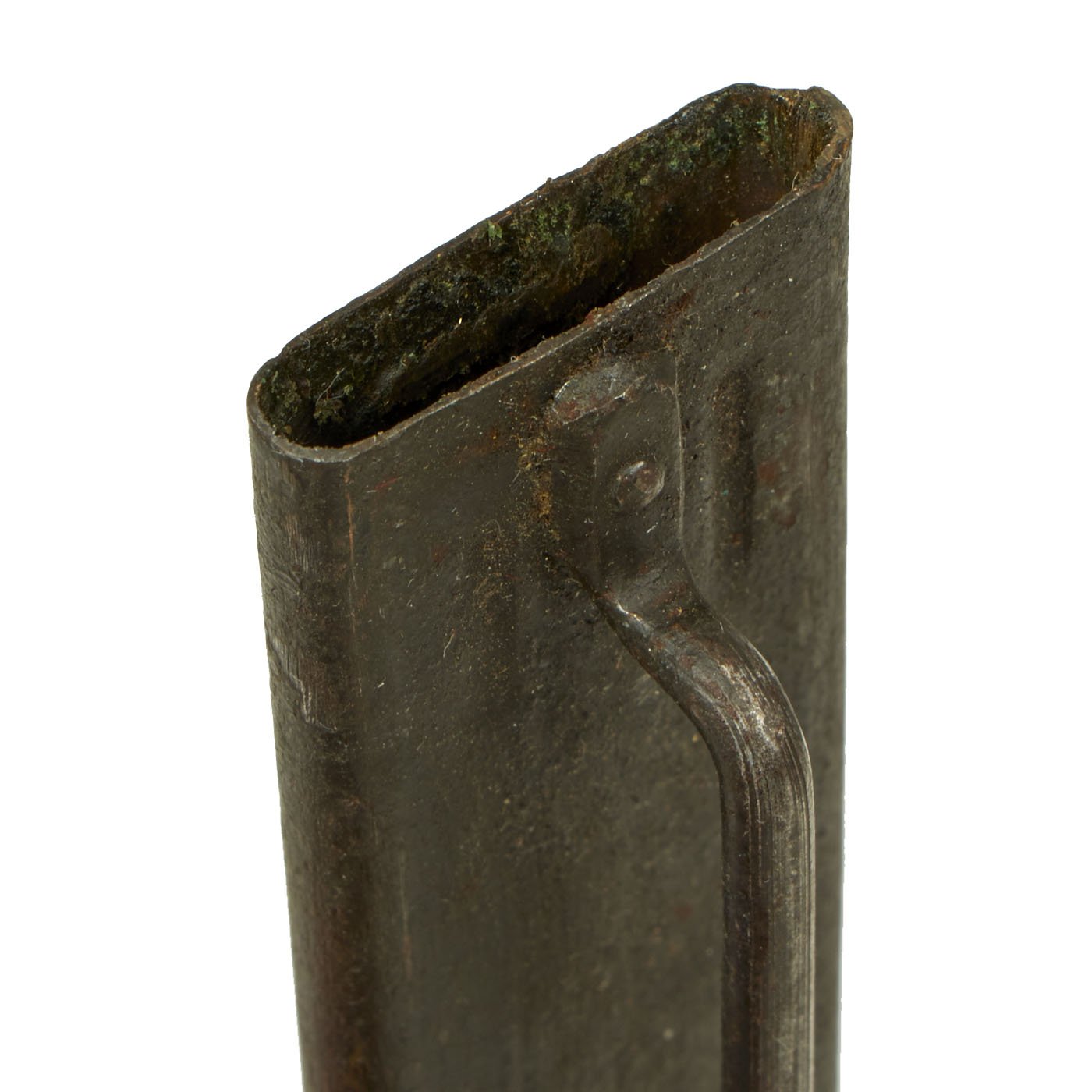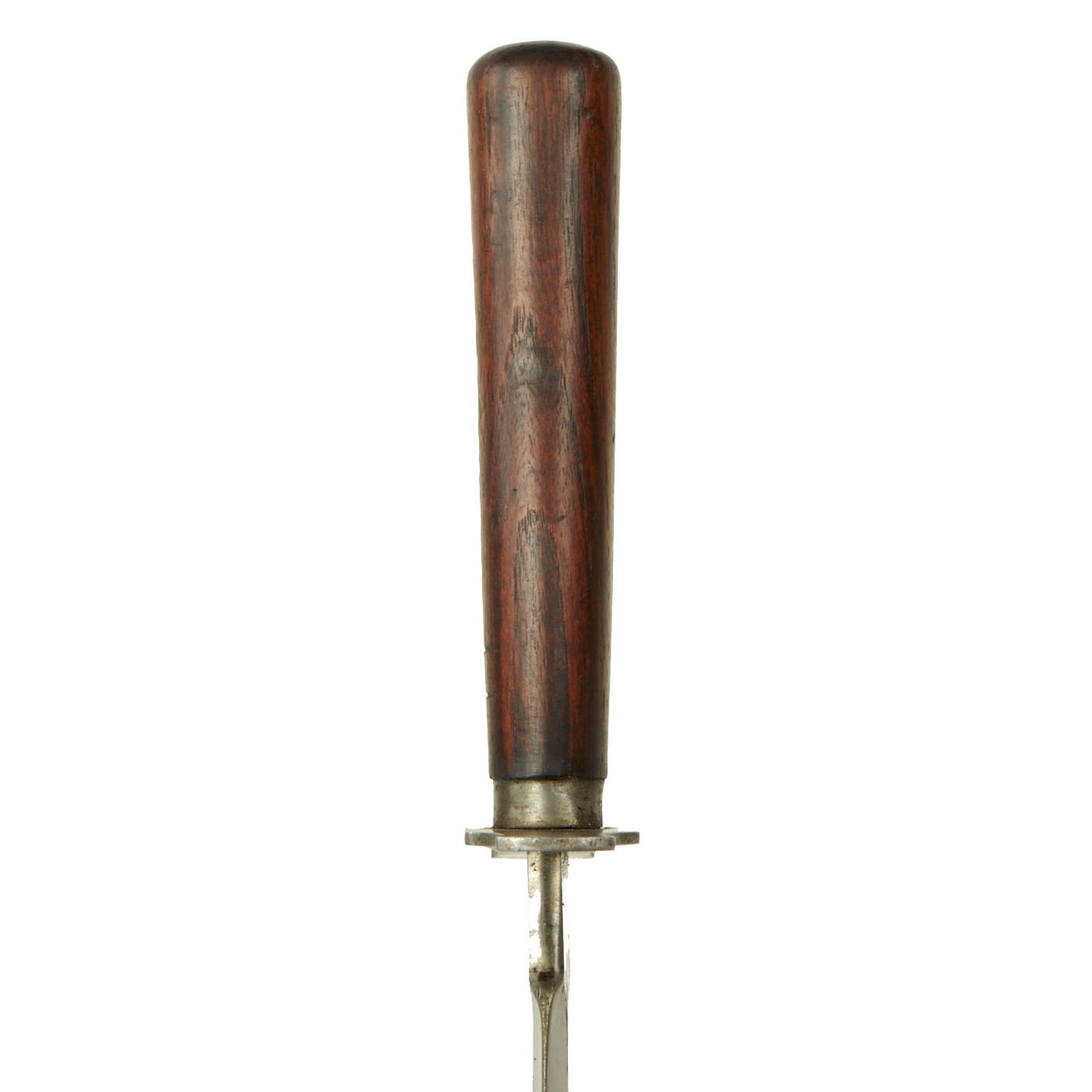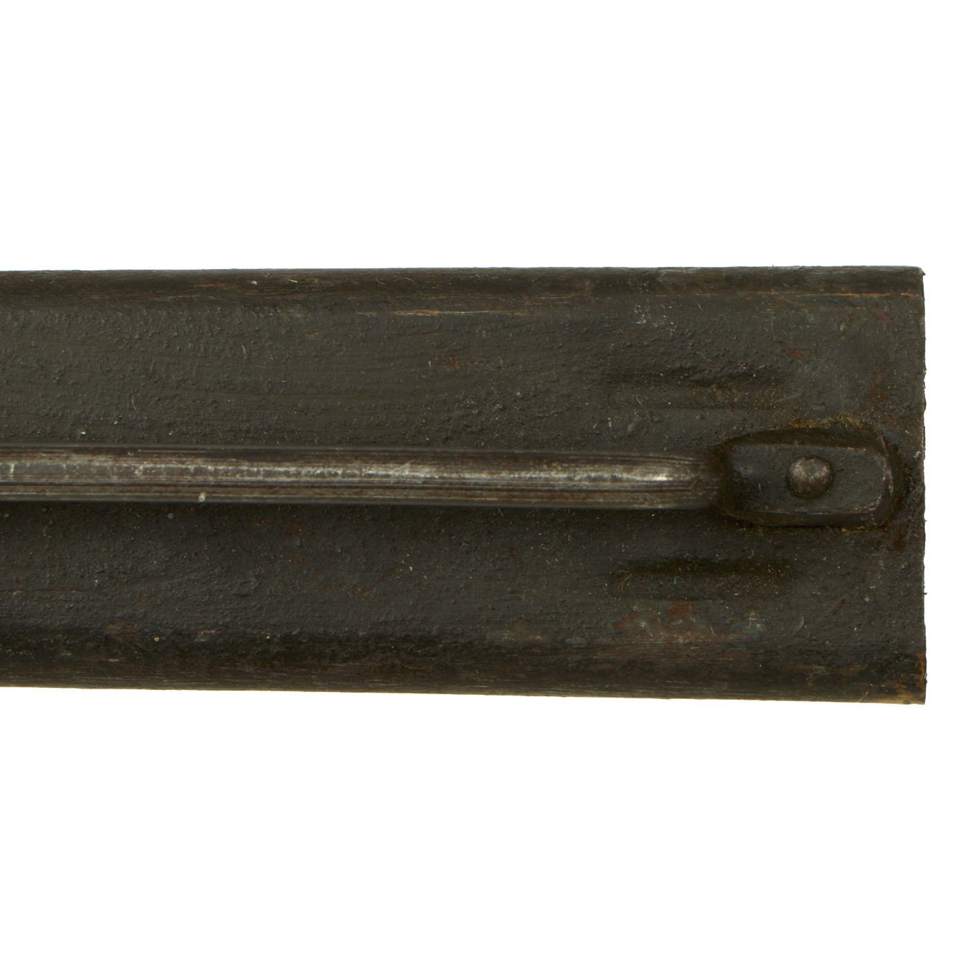 The flat steel crossguard remains nice and straight, though it does have staining and light oxidation on the unfinished steel. It is also loose on the tang at present. The nicely toned walnut grip has a great color and grain with cracks, chips, or major dents, just the letter H carved into the side. The handle is on solidly, with no play on the blade tang. The blued steel scabbard is in very nice condition, with no major damage we can see. It was however painted with black paint, probably once the original finish had worn away.