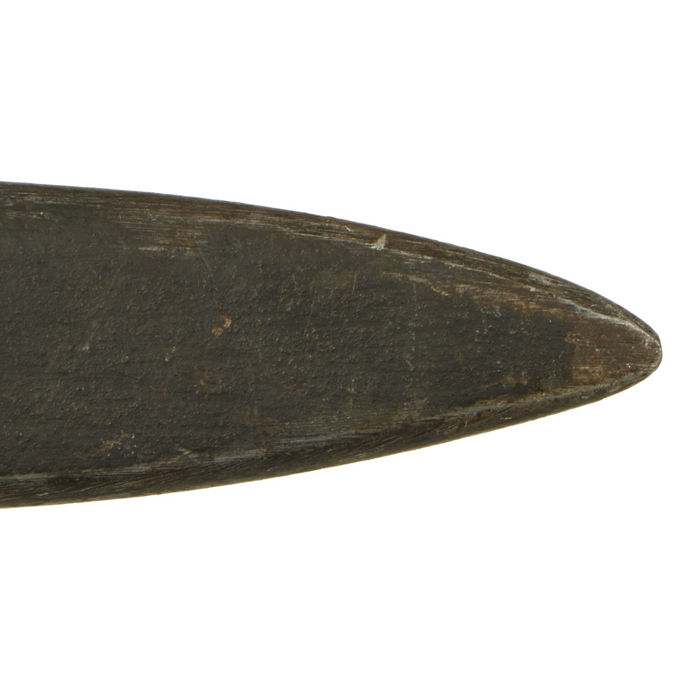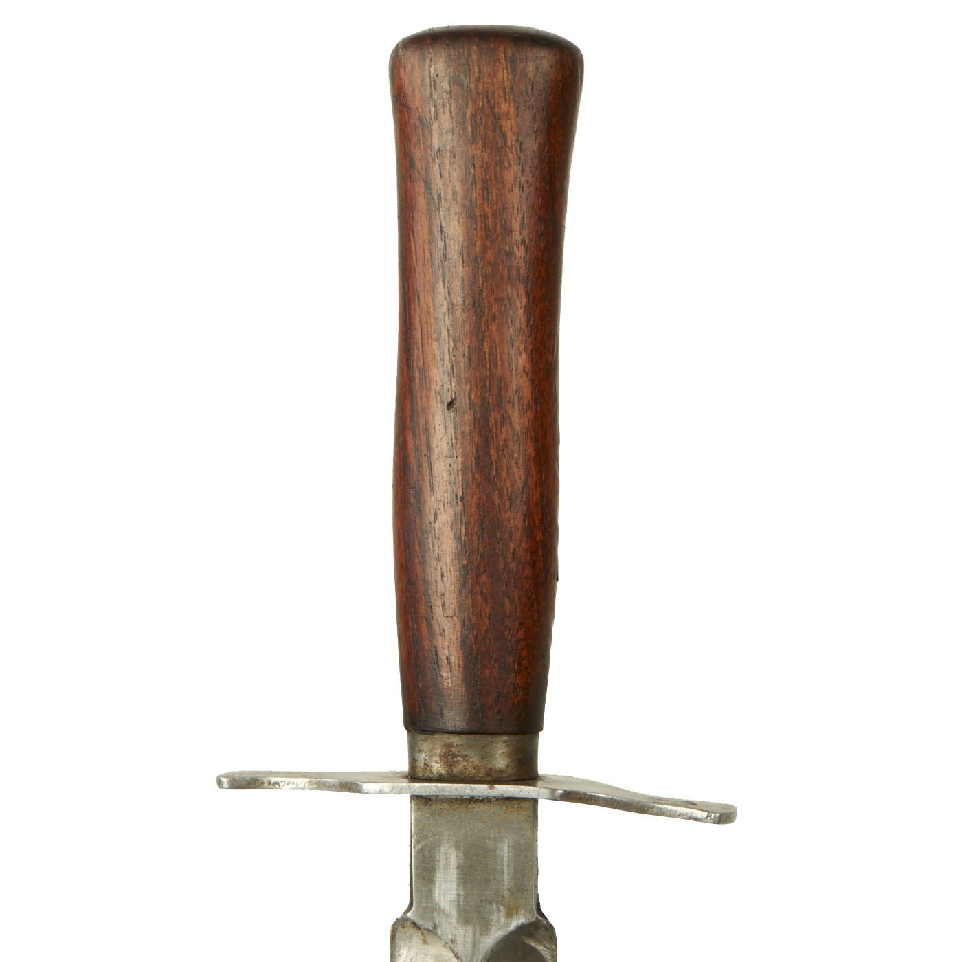 The blade design on these knives is quite similar to that of the U.S. Mark 1 Trench knife, with a 6 1/2 inch long double-edged spear point shape, out of the overall length of 11 inches. This example still bears much of the original factory final grind cross grain, with some light staining from age. The blade also has been sharpened post-factory, but not to a large extent.