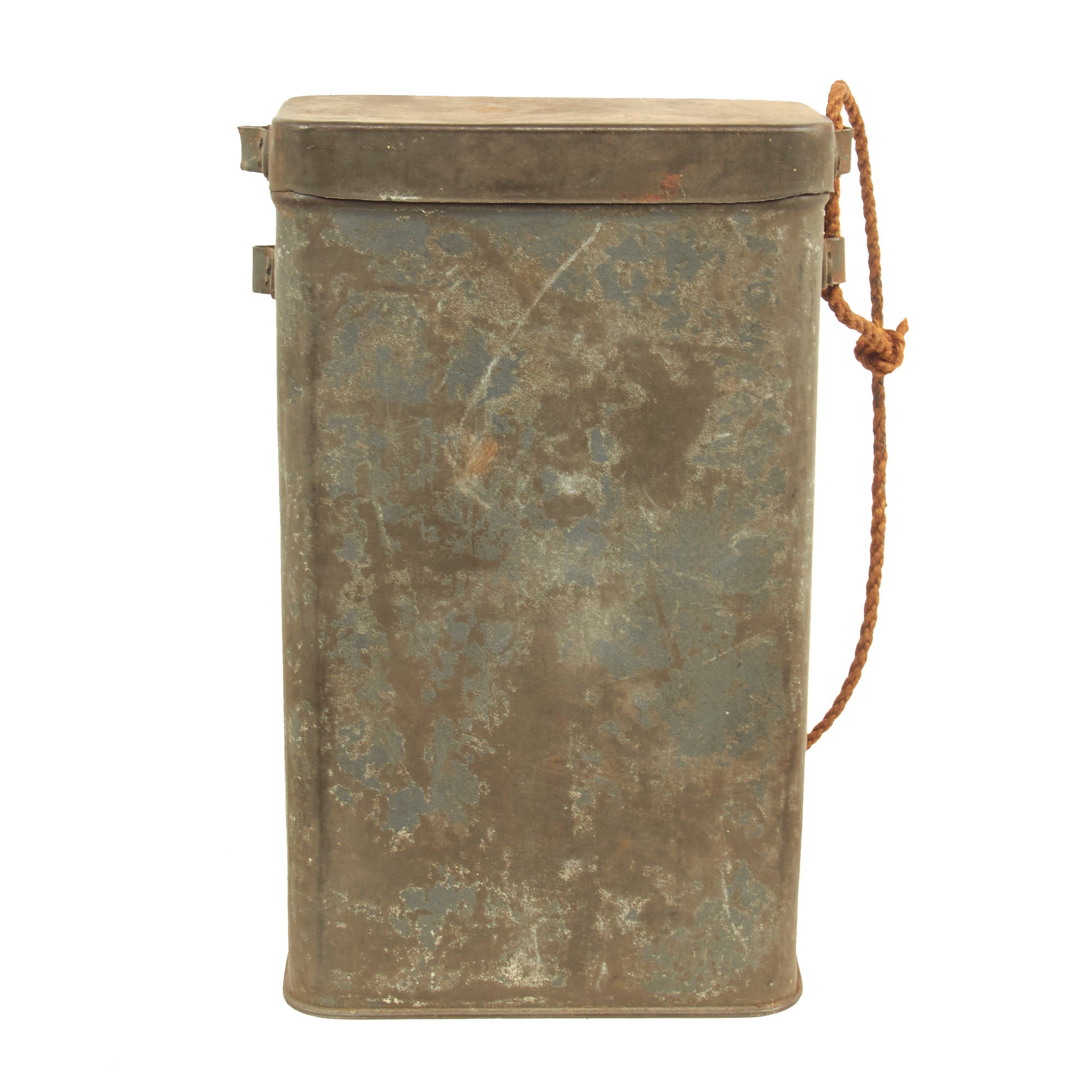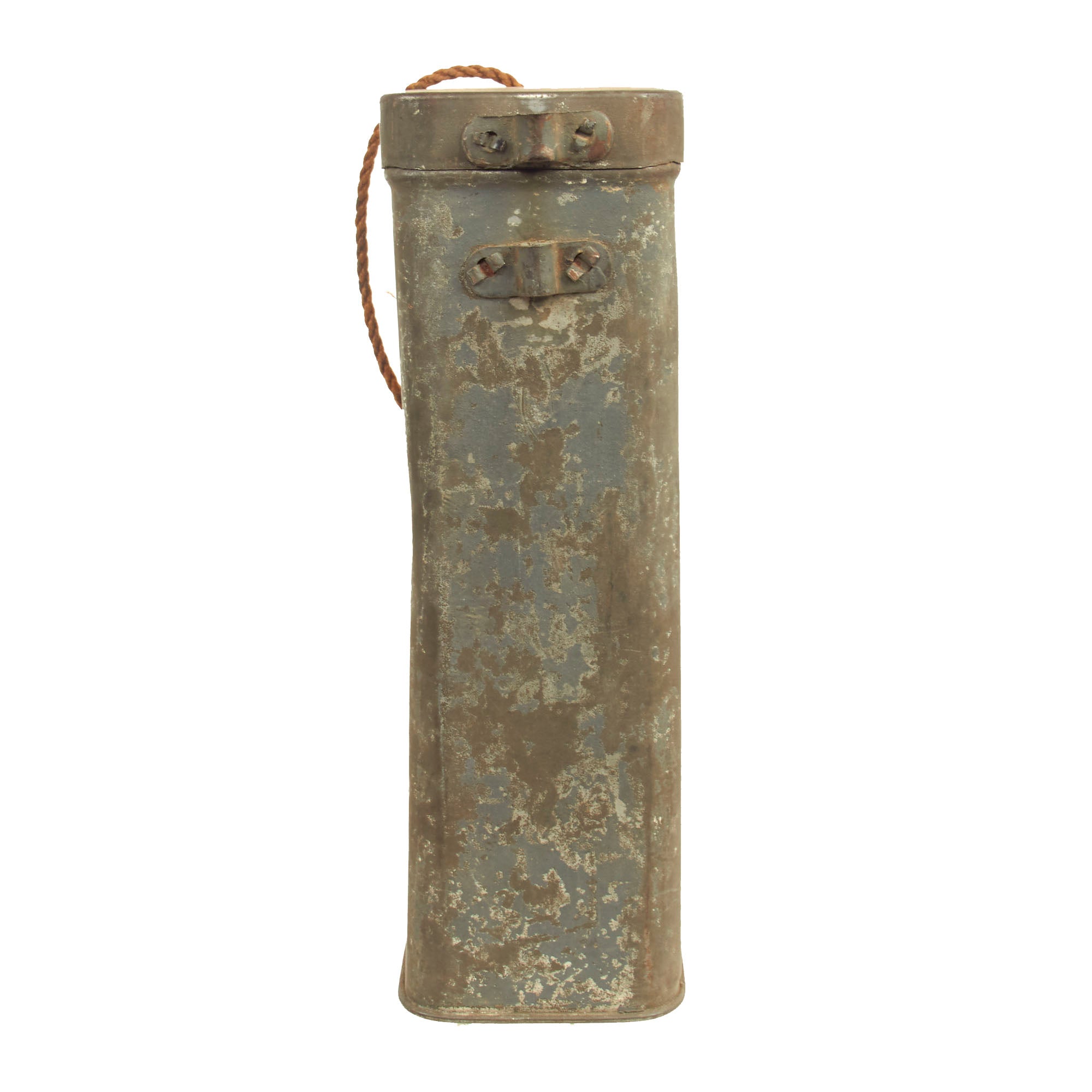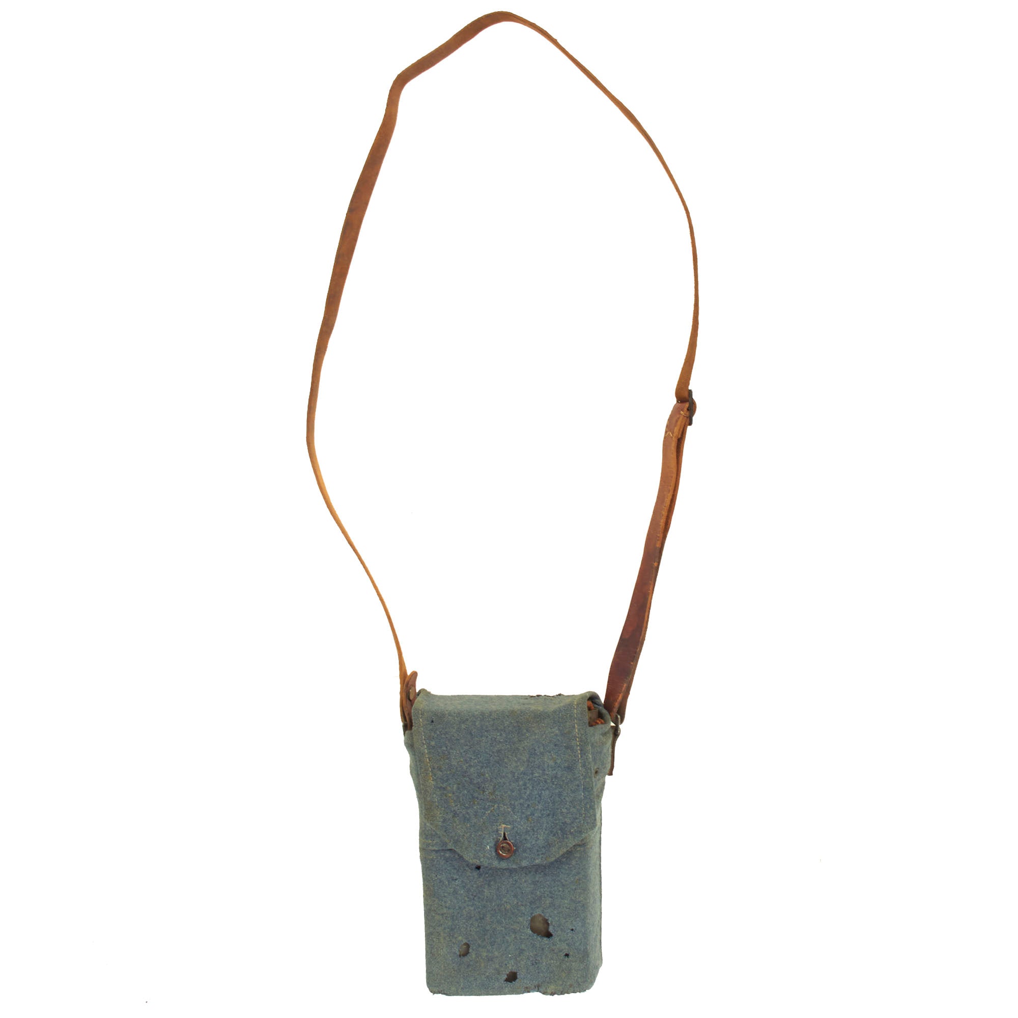 Original Item: Only One Available. Now this is a rather rare French item from the Great War. This is a storage tin for the M2 Gas Mask with an Officers’ Horizon blue carry bag with intact leather carry strap. The M2 gas mask was a French-made gas mask used by French, British and American forces from April 1916 to August 1918 during World War I. The M2 was fabricated in large quantities, with about 29,300,000 being made during the war. It was intended to protect the wearer from at least five hours' exposure to phosgene gas, a common chemical weapon of the time.