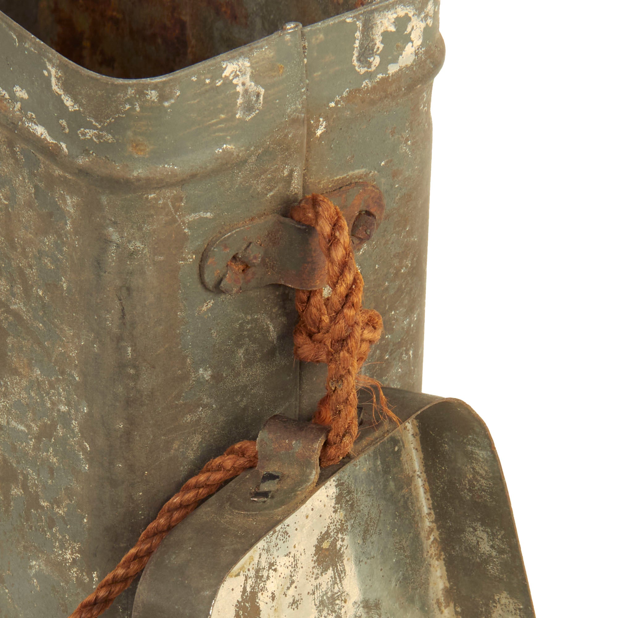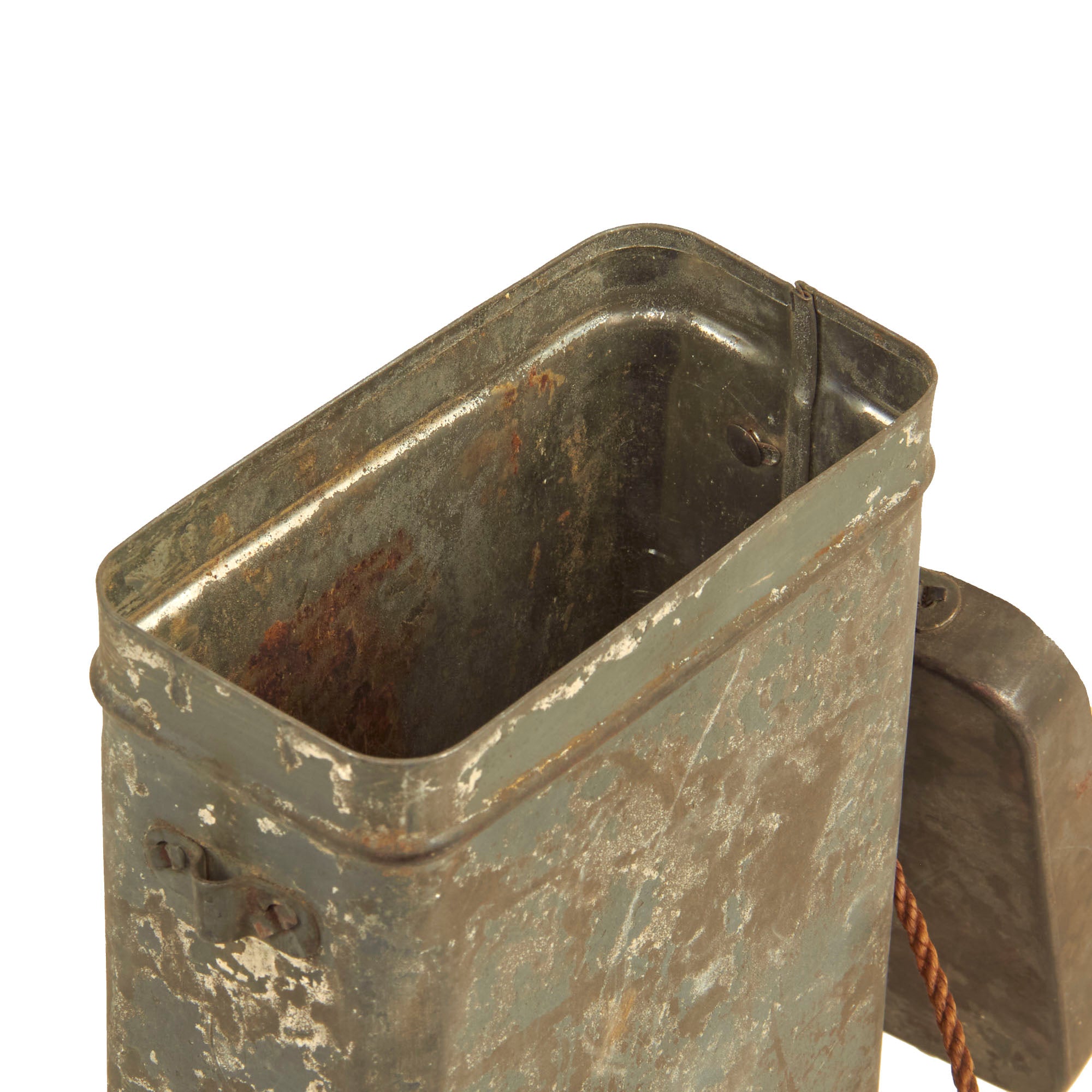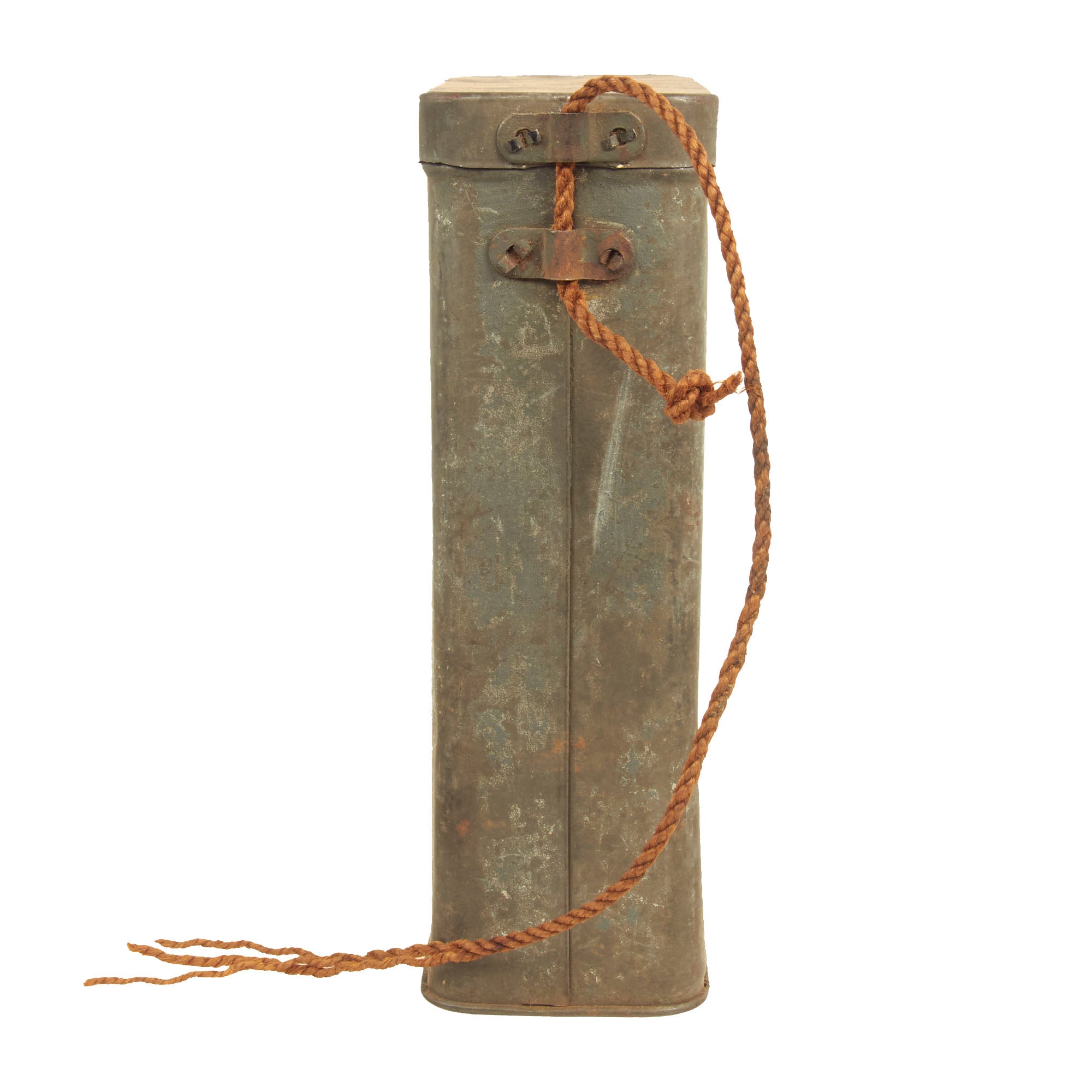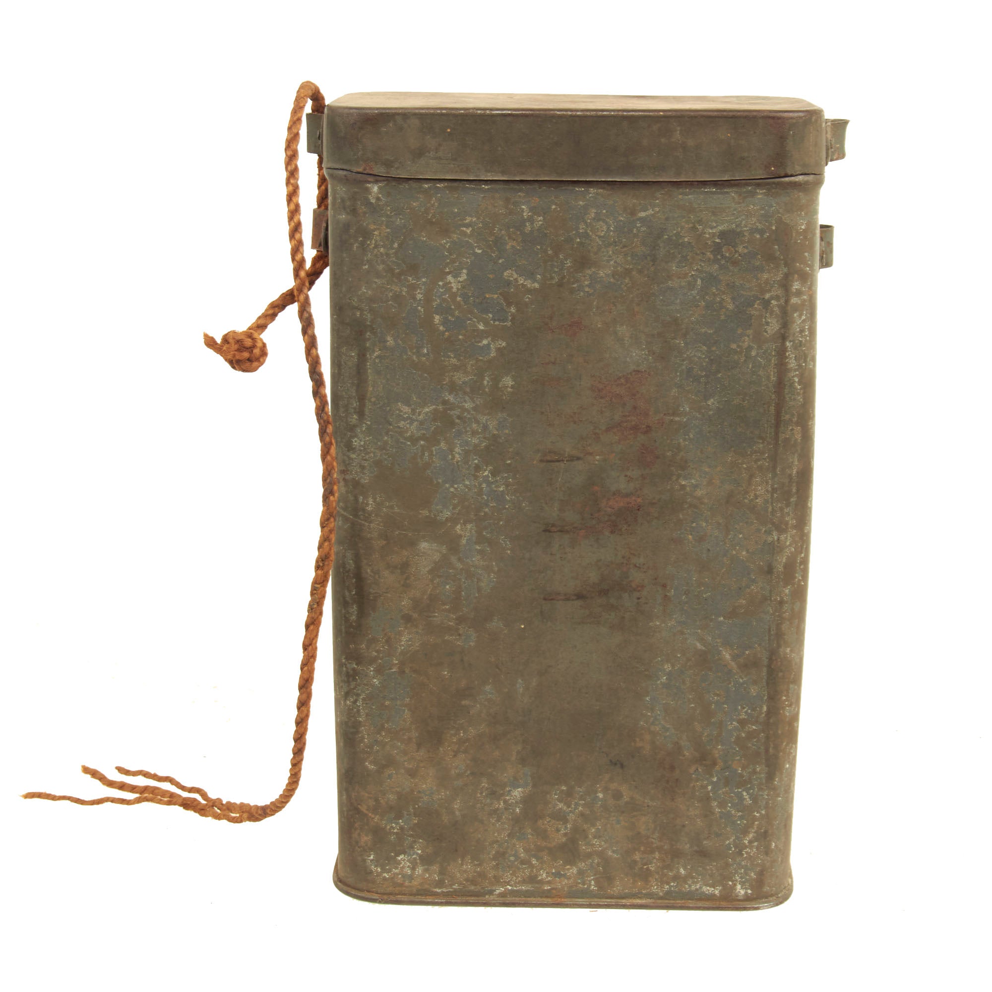 Original Item: Only One Available. Now this is a rather rare French item from the Great War. This is a storage tin for the M2 Gas Mask with an Officers’ Horizon blue carry bag with intact leather carry strap. The M2 gas mask was a French-made gas mask used by French, British and American forces from April 1916 to August 1918 during World War I. The M2 was fabricated in large quantities, with about 29,300,000 being made during the war. It was intended to protect the wearer from at least five hours' exposure to phosgene gas, a common chemical weapon of the time.