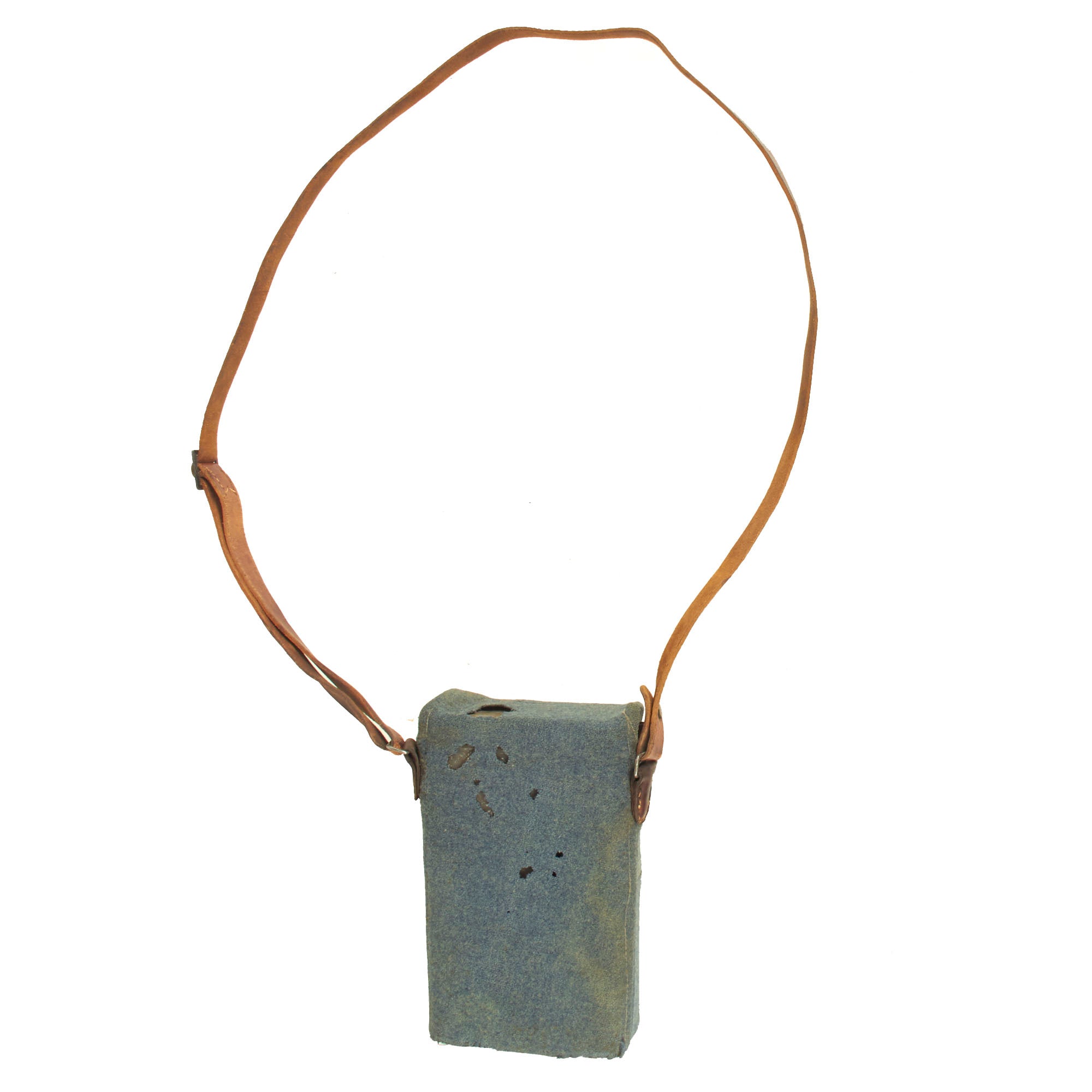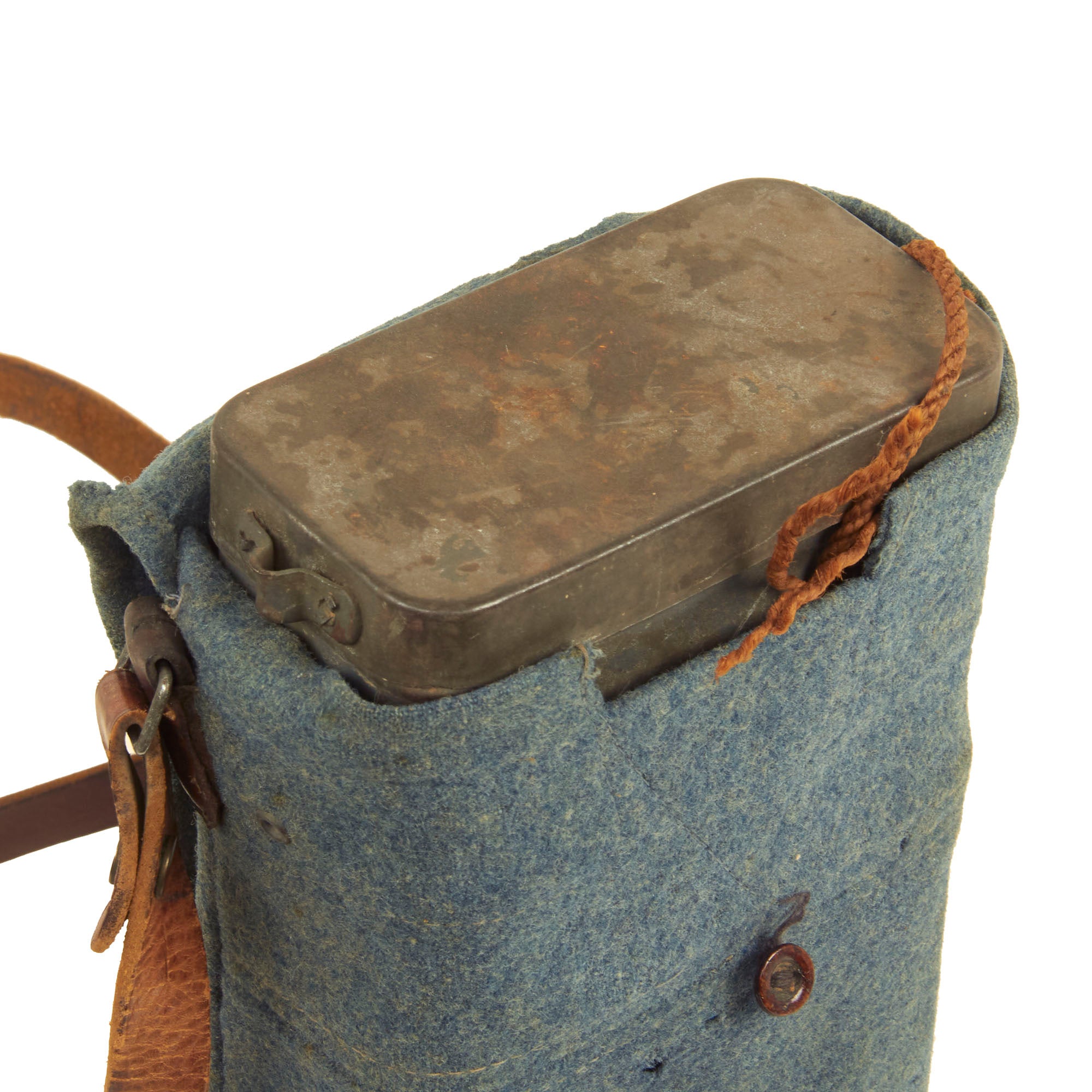 The tin is in great condition with a solid shape and appears to be complete. The wool horizon blue carry case is also in good condition but does show age and wear. There are scattered moth nips present as well as tearing and holes, but is still rather solid. The leather carry strap is surprisingly solid, soft and presented without any extensive damage.