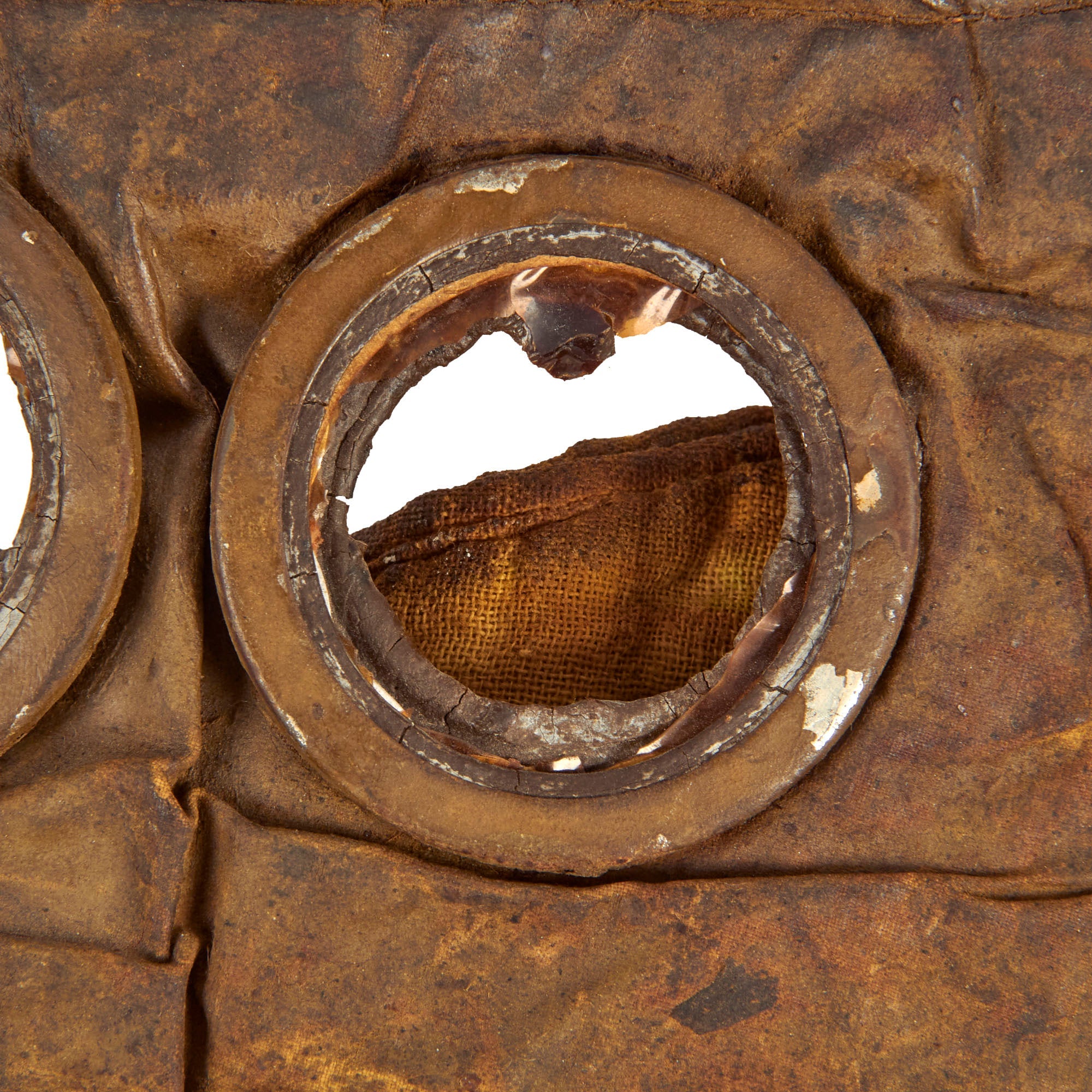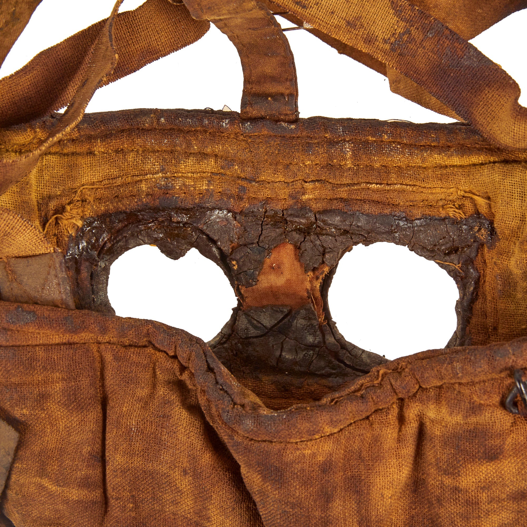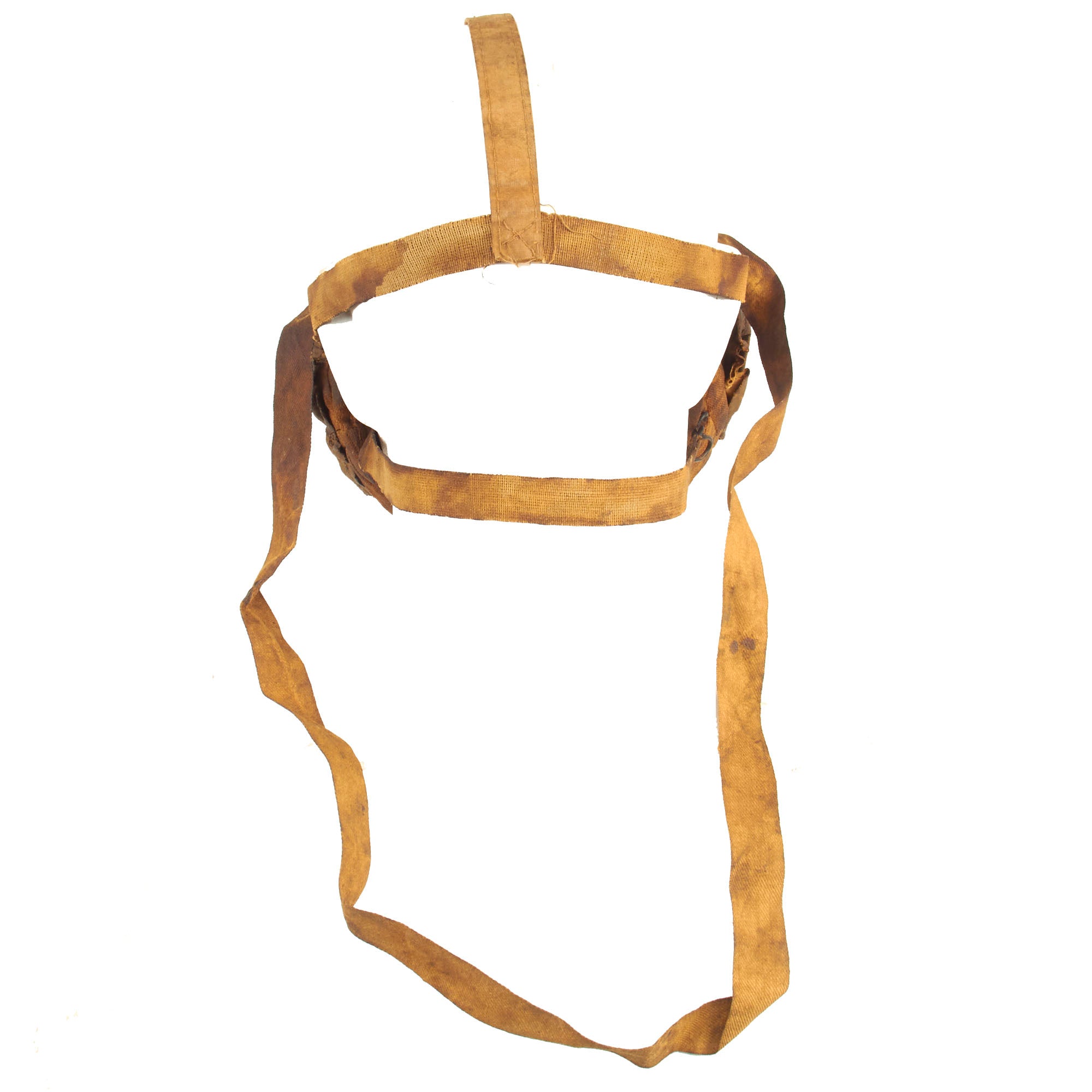 The condition of the mask reflects one that had long service. Unfortunately there are no lenses in the mask, however besides that the mask does appear to be complete otherwise. The canvas is quite stiff and delicate but does not feel overly brittle as most we encounter. The mask is still able to be properly stowed away in the carry bag and the bag itself still retains the button and shoulder strap.