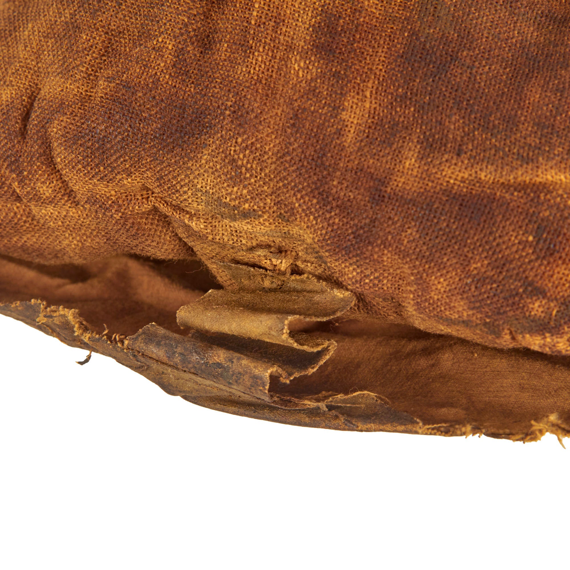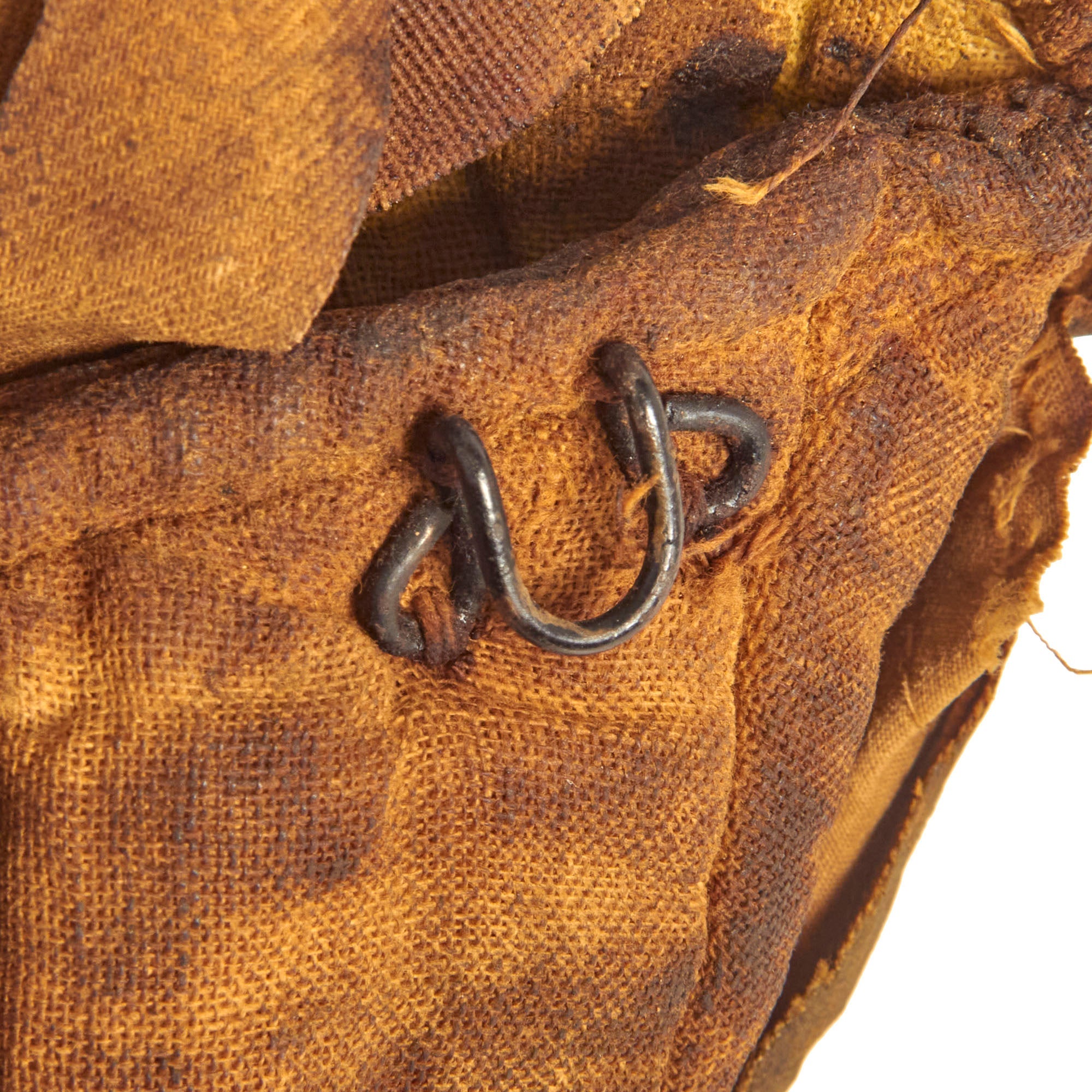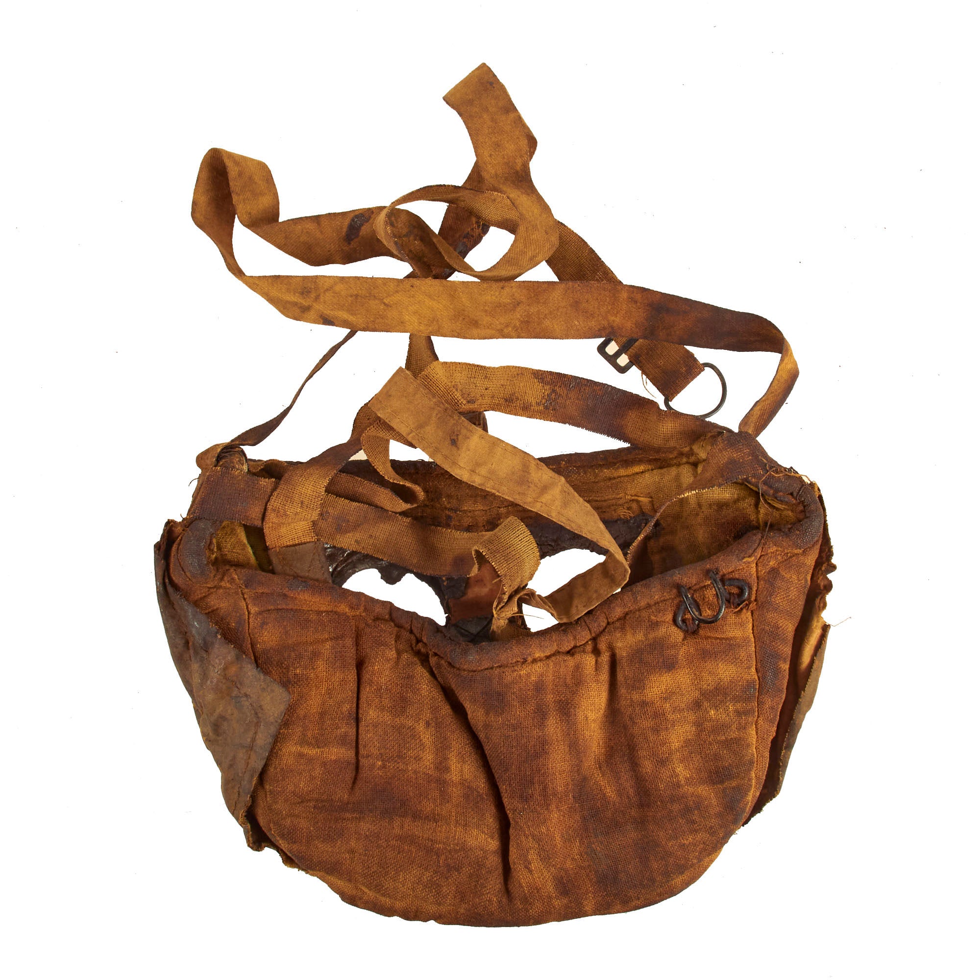 The condition of the mask reflects one that had long service. Unfortunately there are no lenses in the mask, however besides that the mask does appear to be complete otherwise. The canvas is quite stiff and delicate but does not feel overly brittle as most we encounter. The mask is still able to be properly stowed away in the carry bag and the bag itself still retains the button and shoulder strap.