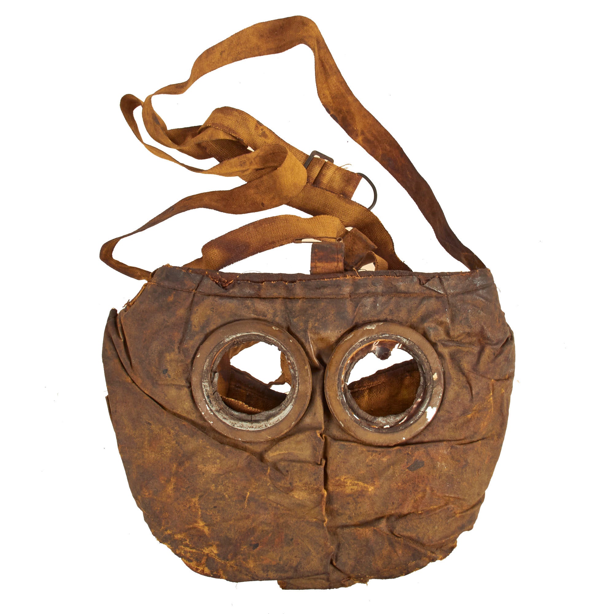 Original Item: Only One Available. This is a lovely example of an item that we have only been able to offer a few times before, a WWI French M2 gas mask with the correct carry bag. The mask does show signs of extensive use and wear but still displays quite nicely. The M2 gas mask was a French-made gas mask used by French, British and American forces from April 1916 to August 1918 during World War I. The M2 was fabricated in large quantities, with about 29,300,000 being made during the war. It was intended to protect the wearer from at least five hours' exposure to phosgene gas, a common chemical weapon of the time.