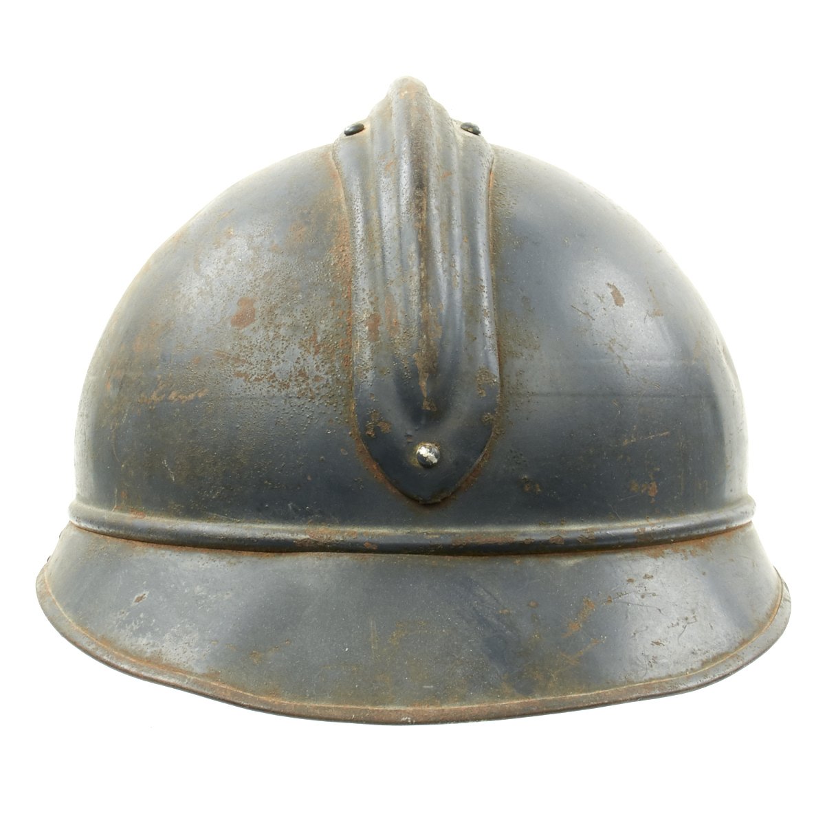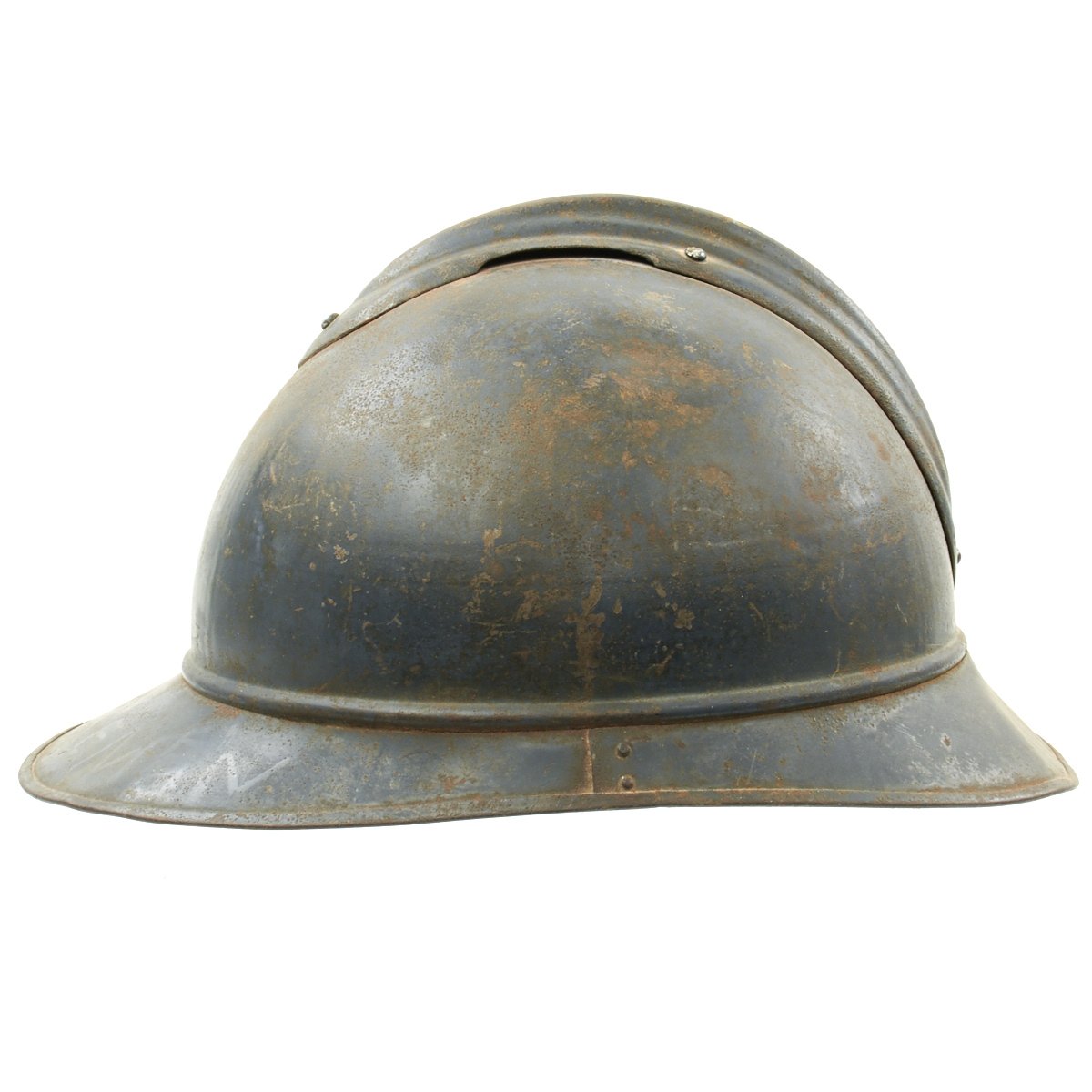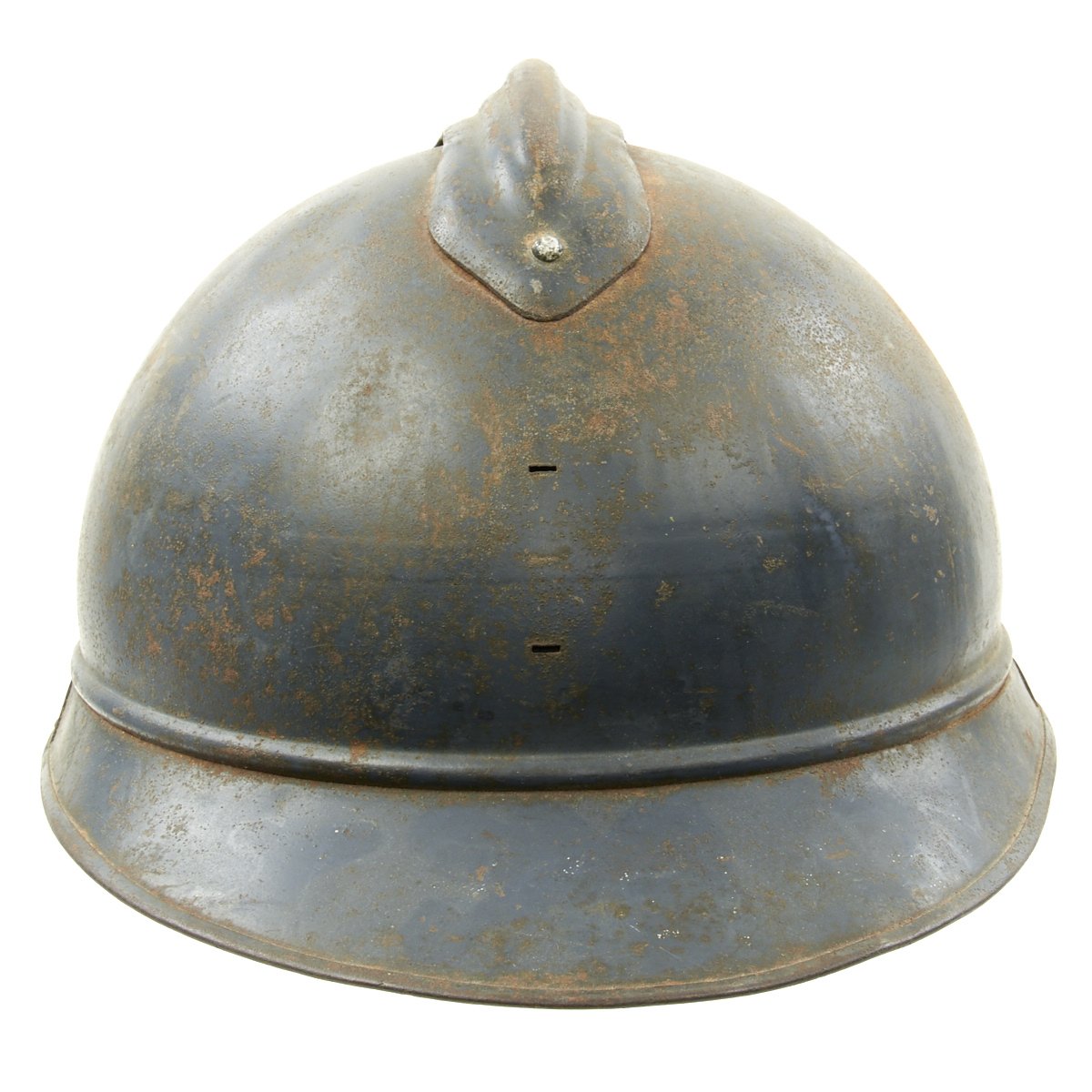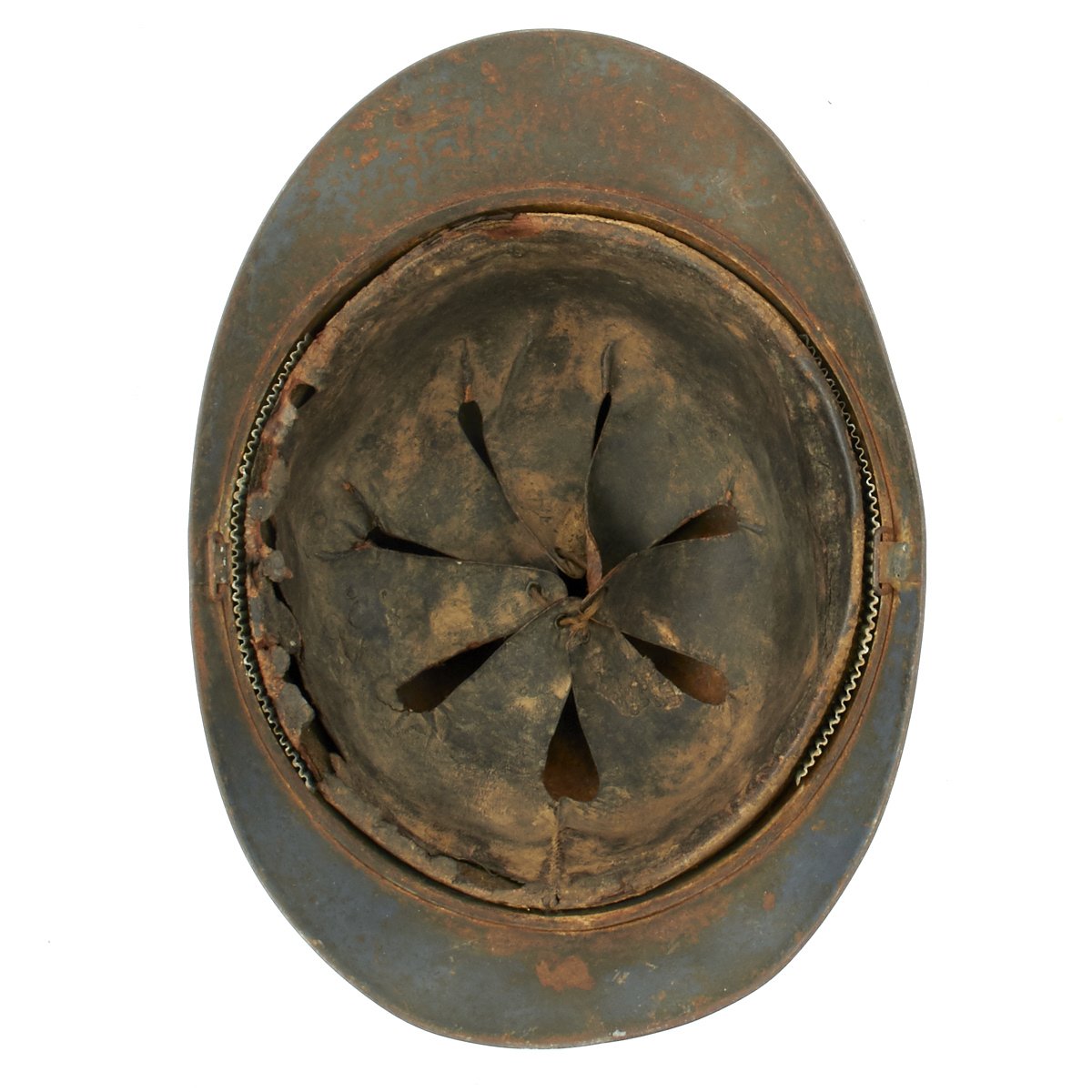 Original Item: Only One Available. This is a nice example of a genuine World War I M1915 French Army "Adrian" steel helmet. The helmet retains the original "dark horizon blue" paint, however the front insignia was removed some time ago. The liner size is approximately US 7 3/8 (59cm). Features a complete original leather liner in good condition, though it is somewhat dirty. The chin strap is unfortunately completely missing. Overall condition of the helmet is nice, though it does show its age. The shell shows some minor dings, scratches and paint chips consistent with age, as well as some degree of surface rust. If you were looking for a nicely priced Adrian Helmet to fill out your WWI collection, this is a great chance!