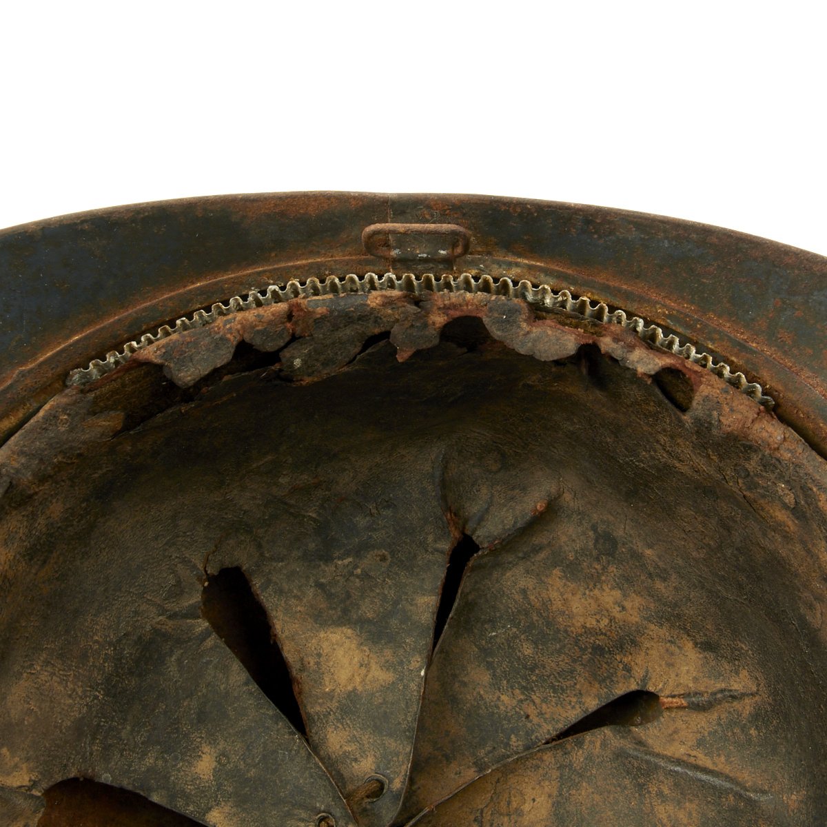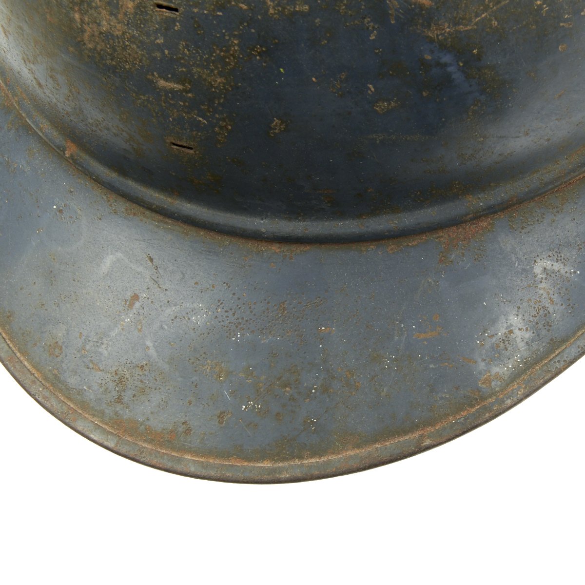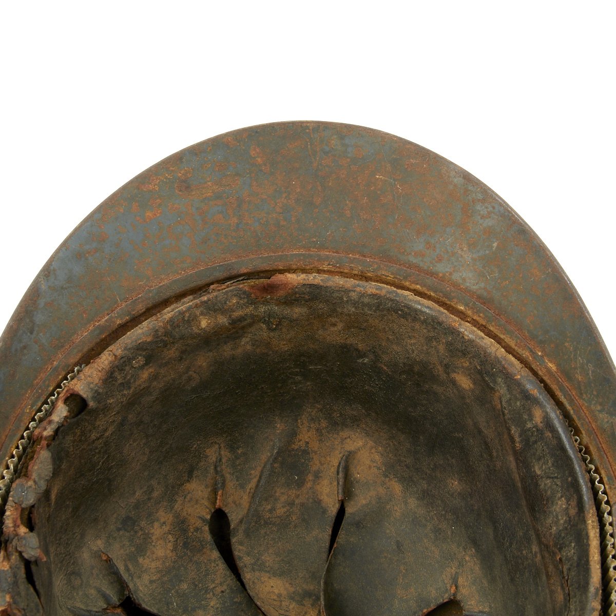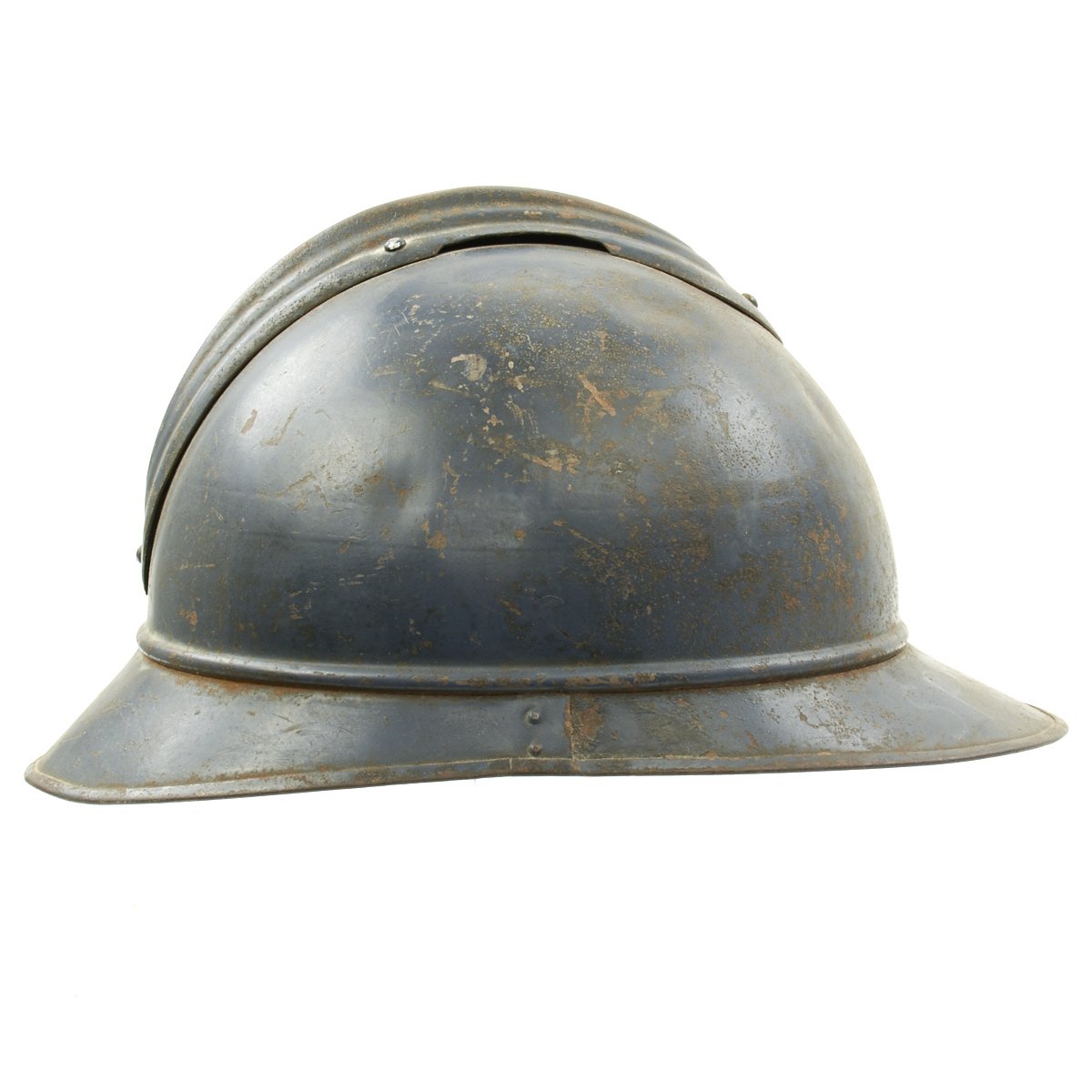 Original Item: Only One Available. This is a nice example of a genuine World War I M1915 French Army "Adrian" steel helmet. The helmet retains the original "dark horizon blue" paint, however the front insignia was removed some time ago. The liner size is approximately US 7 3/8 (59cm). Features a complete original leather liner in good condition, though it is somewhat dirty. The chin strap is unfortunately completely missing. Overall condition of the helmet is nice, though it does show its age. The shell shows some minor dings, scratches and paint chips consistent with age, as well as some degree of surface rust. If you were looking for a nicely priced Adrian Helmet to fill out your WWI collection, this is a great chance!