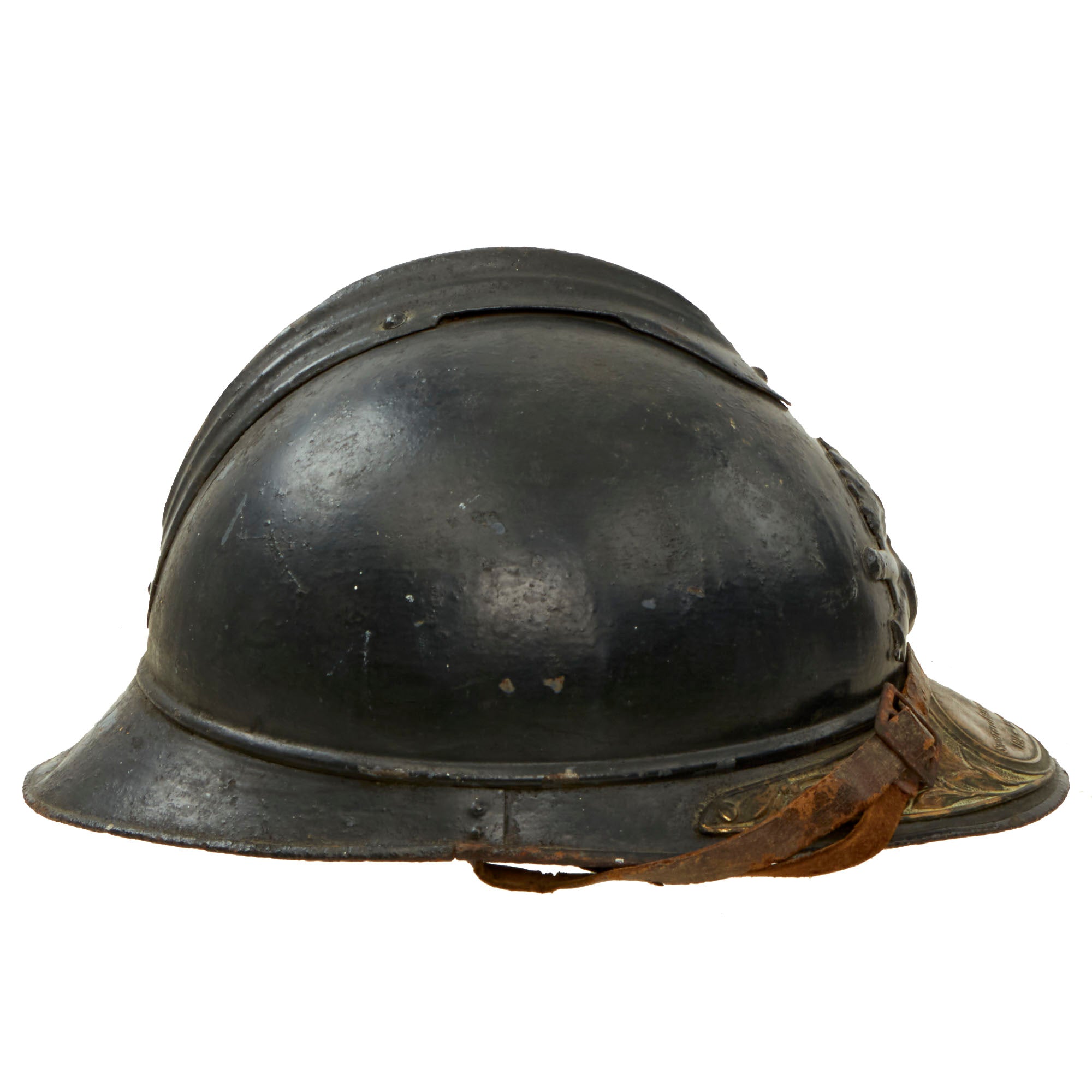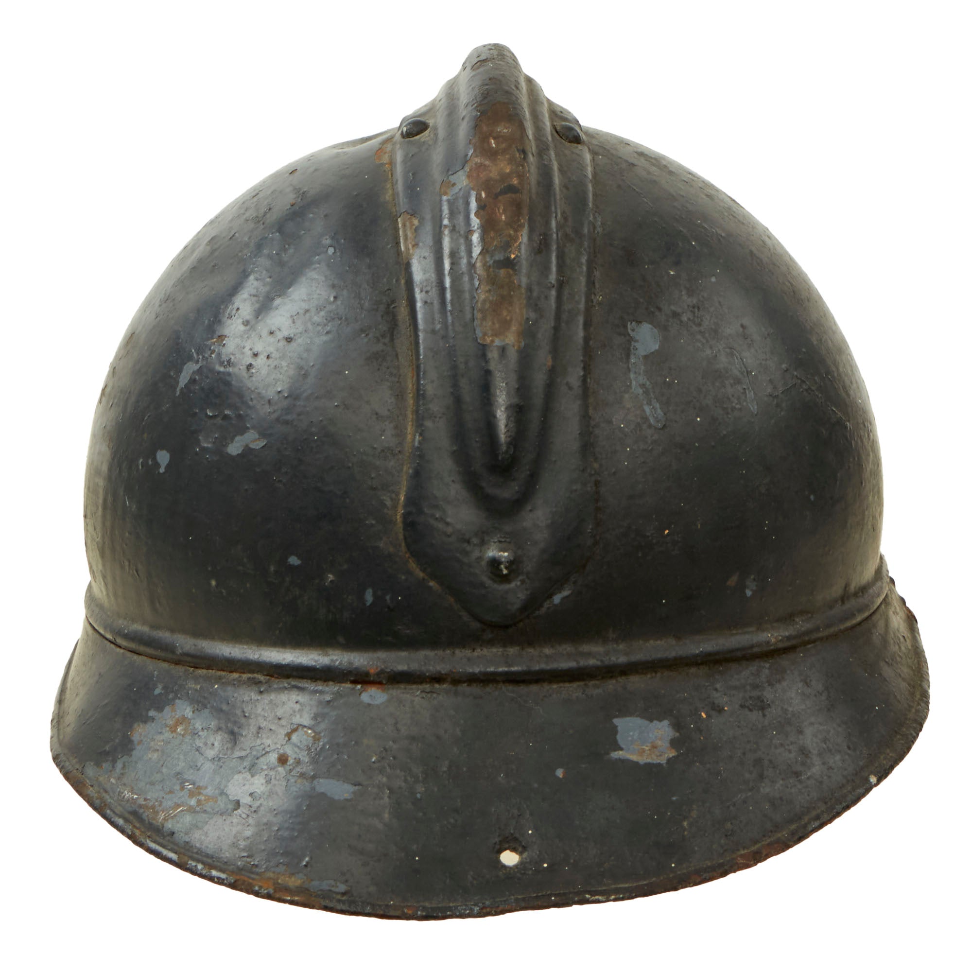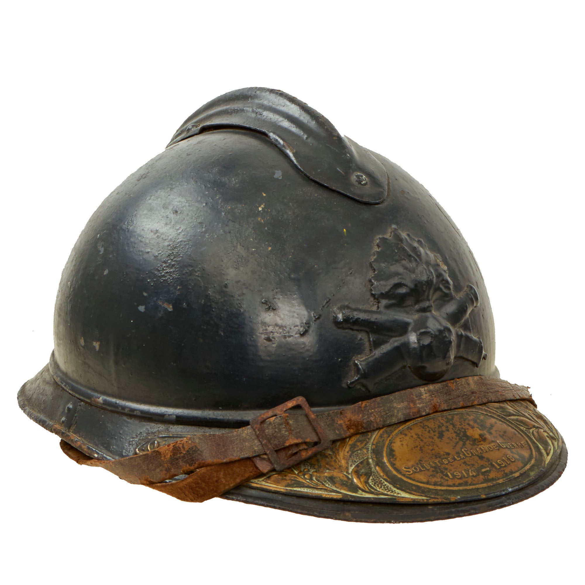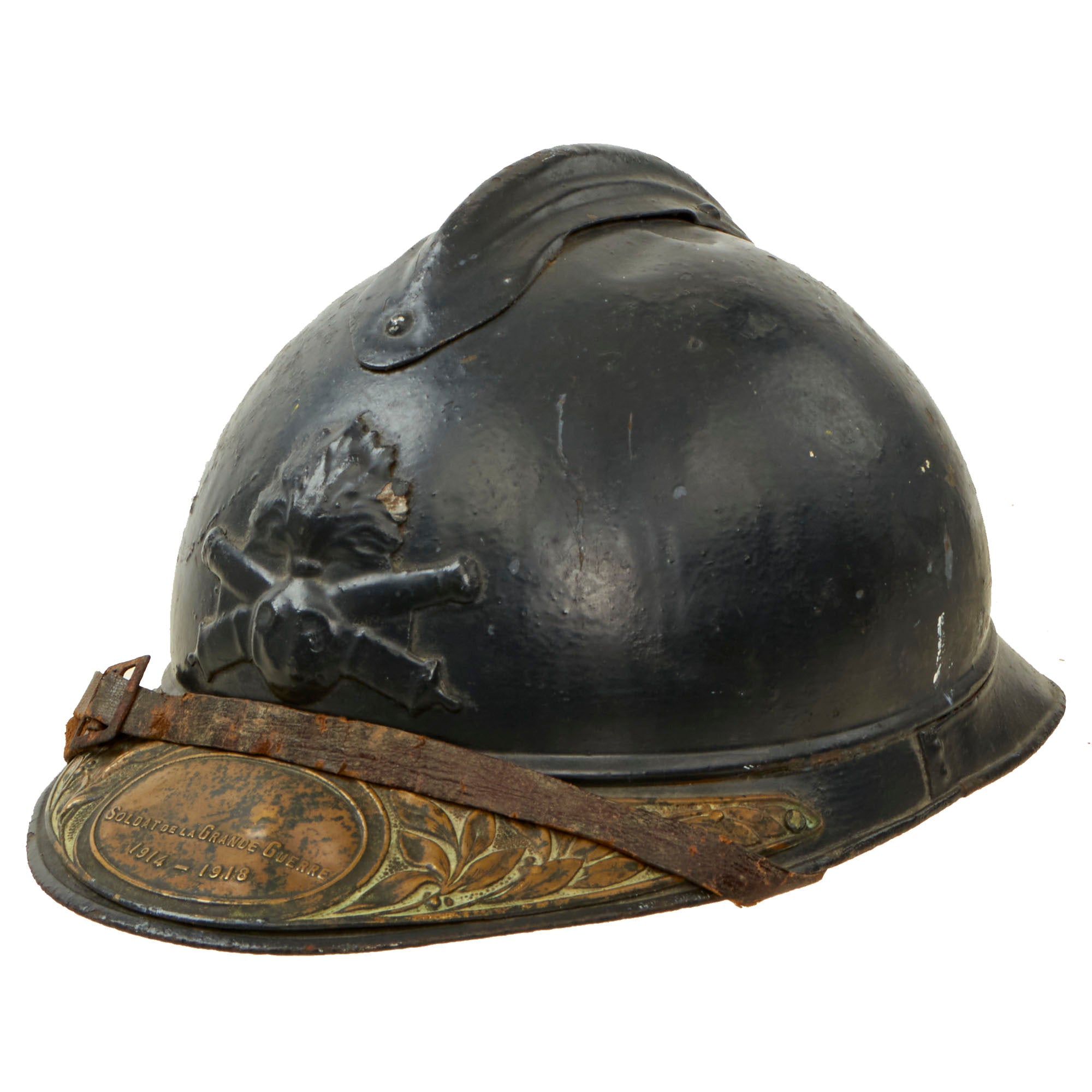 Original Item: Only One Available. This is a nice service used example of a genuine World War I M-1915 French Army "Adrian" steel helmet, which looks to have seen long service. The front of the helmet still has its original French "Flaming Bomb" Crossed Cannons badge. The badge has the standard R F on the "bomb", for République Française. This is the badge used on standard Artillery issue helmets. It still retains the correct dark "Horizon Blue" paint on the shell, and this appears to be its 2nd or 3rd layer of paint. There definitely is some wear to the paint, with chipping, heavy oxidation, and storage wear present. The helmet has a first pattern liner with a dark blue wool padding used from uniform scraps. 1st Pattern liners are very difficult to find. The front of the helmet has a Great War Veteran’s brass helmet plaque that reads: Soldat De La Grande Guerre 1914-1918 (Soldier Of The Great War 1914-1918).