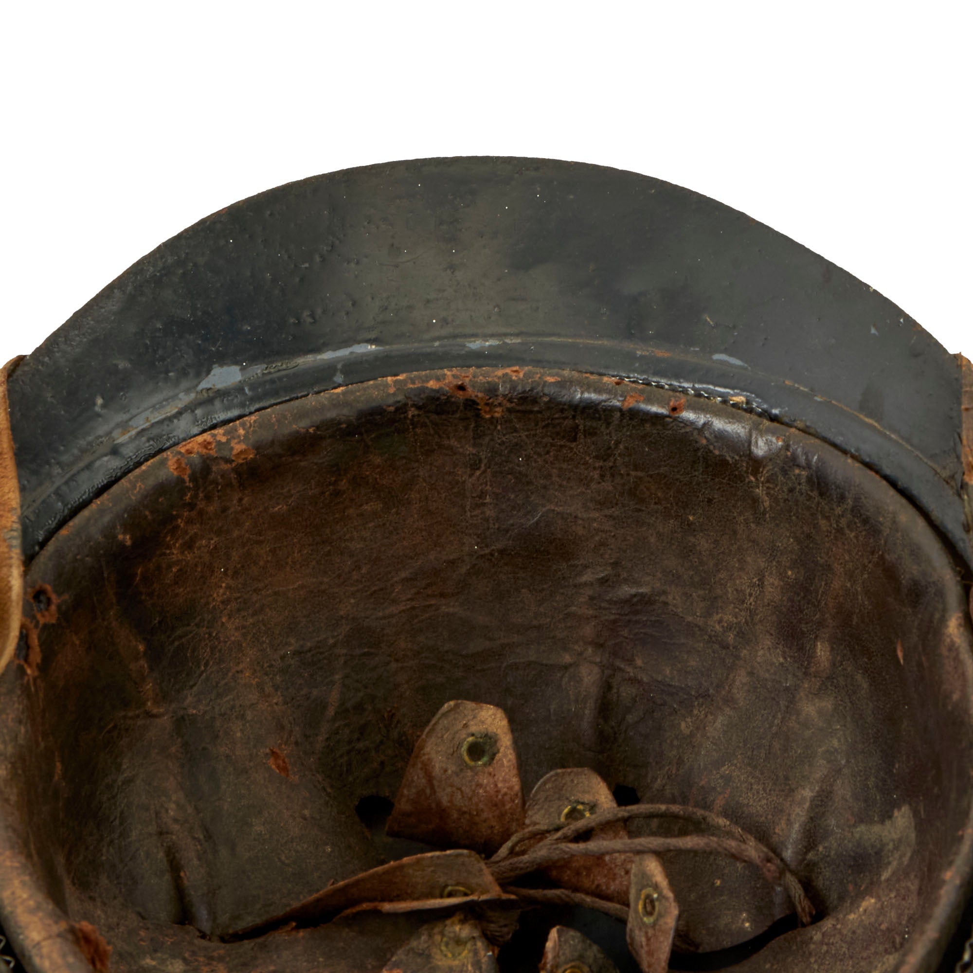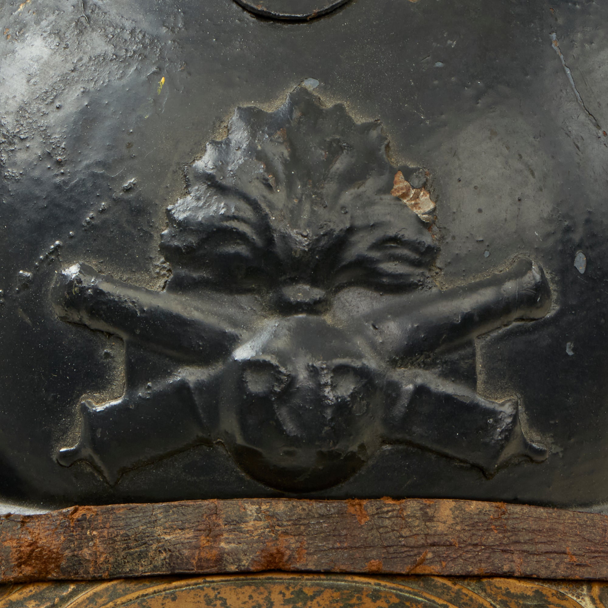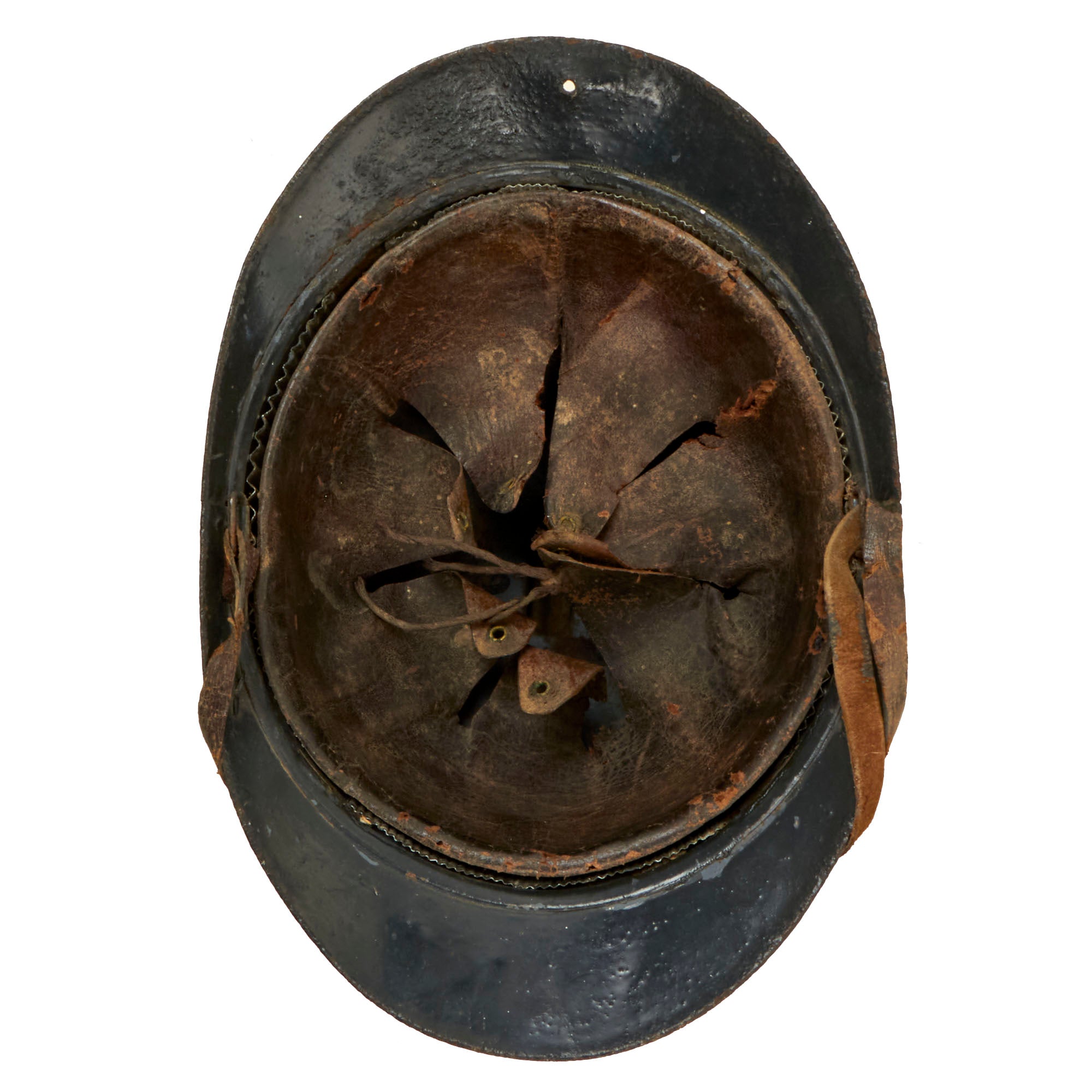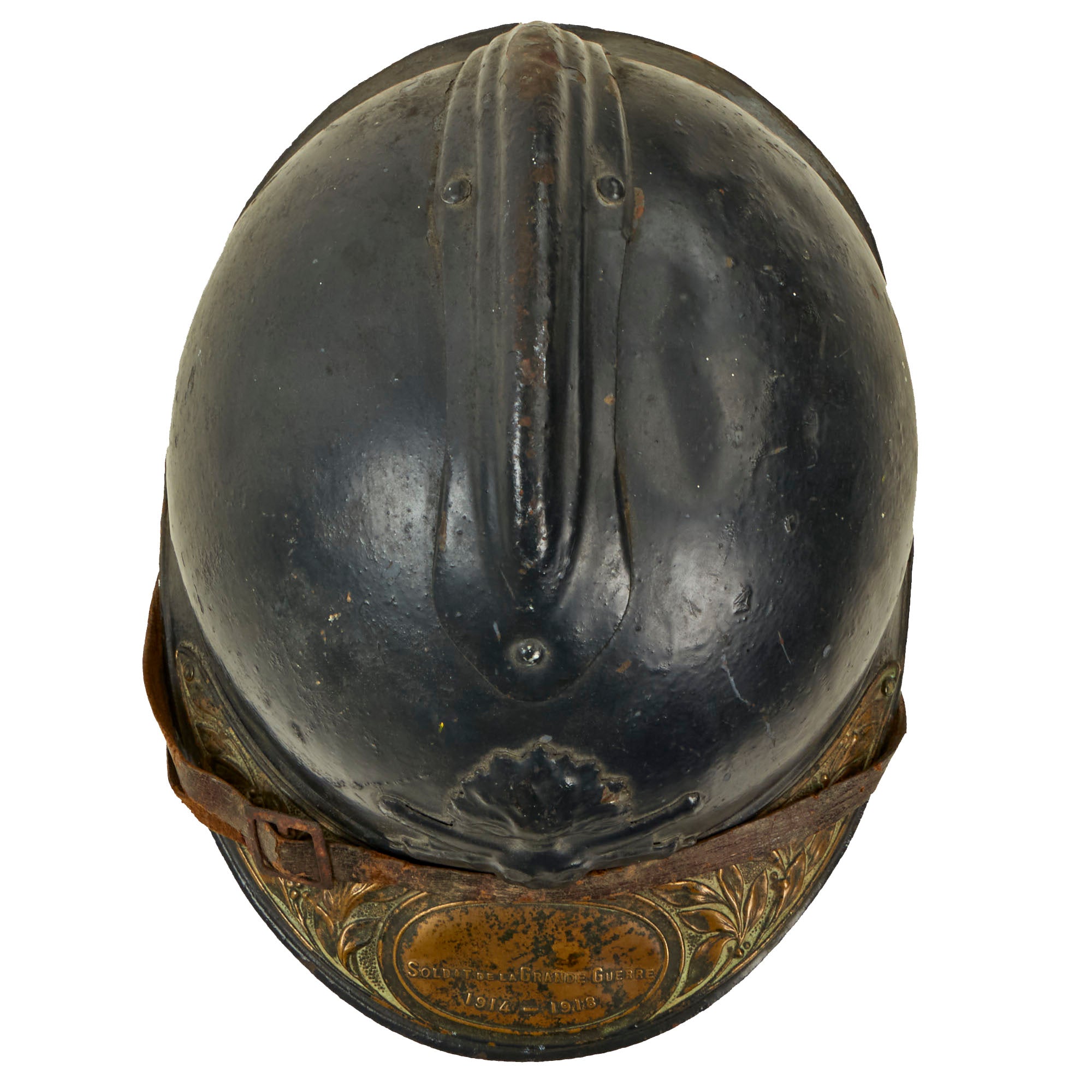 Original Item: Only One Available. This is a nice service used example of a genuine World War I M-1915 French Army "Adrian" steel helmet, which looks to have seen long service. The front of the helmet still has its original French "Flaming Bomb" Crossed Cannons badge. The badge has the standard R F on the "bomb", for République Française. This is the badge used on standard Artillery issue helmets. It still retains the correct dark "Horizon Blue" paint on the shell, and this appears to be its 2nd or 3rd layer of paint. There definitely is some wear to the paint, with chipping, heavy oxidation, and storage wear present. The helmet has a first pattern liner with a dark blue wool padding used from uniform scraps. 1st Pattern liners are very difficult to find. The front of the helmet has a Great War Veteran’s brass helmet plaque that reads: Soldat De La Grande Guerre 1914-1918 (Soldier Of The Great War 1914-1918).