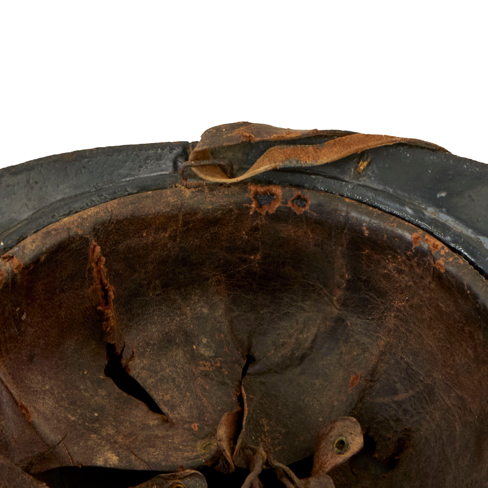 The 1st Pattern leather liner is present, showing moderate wear, with a lot of the finish present, slight tearing and minor cracking present around the lip of the liner. The liner itself is still secured properly inside, and all four corrugated aluminum spacers are still present. The chinstrap is present and fully intact, though the leather is definitely a bit dried out and stretched from being sat on the brim. The rear visor of the helmet has a hole in it, likely from being hung on the wall.