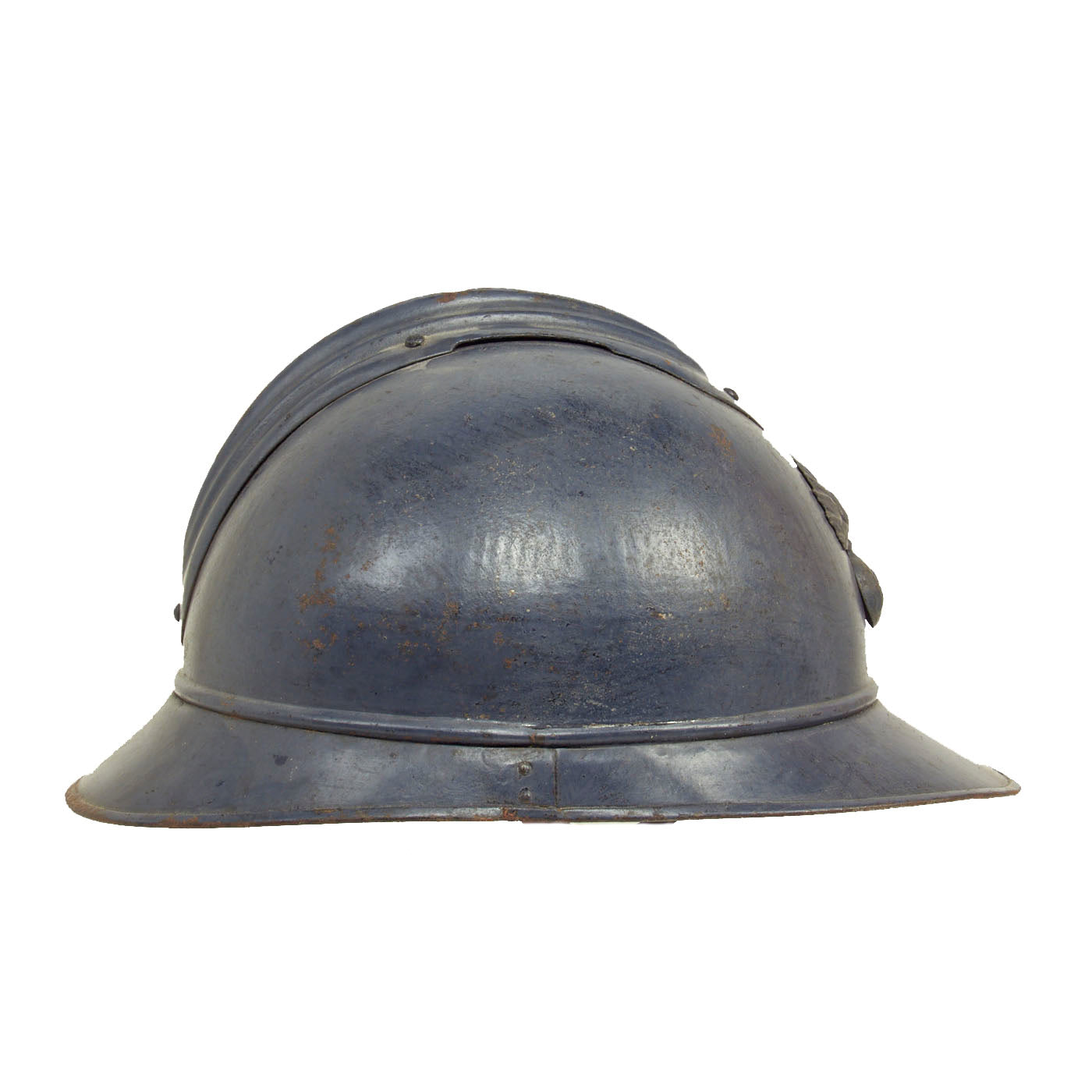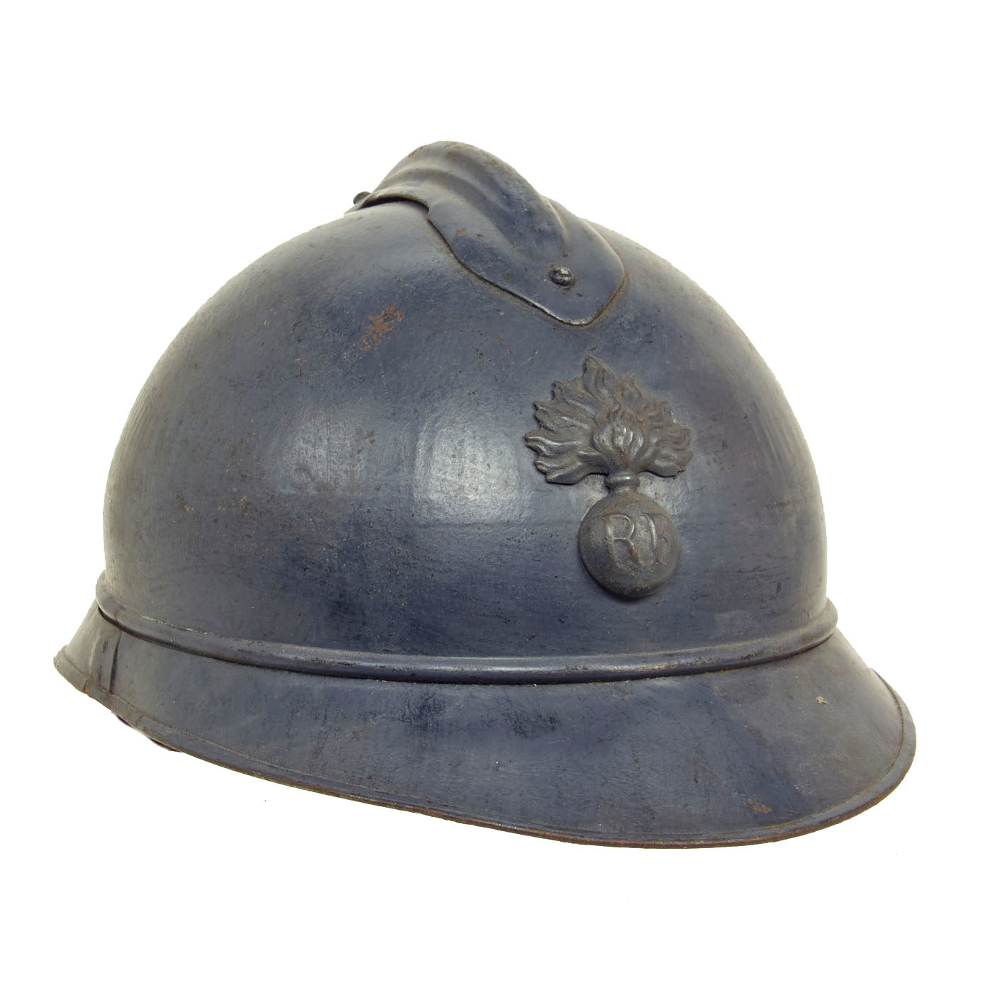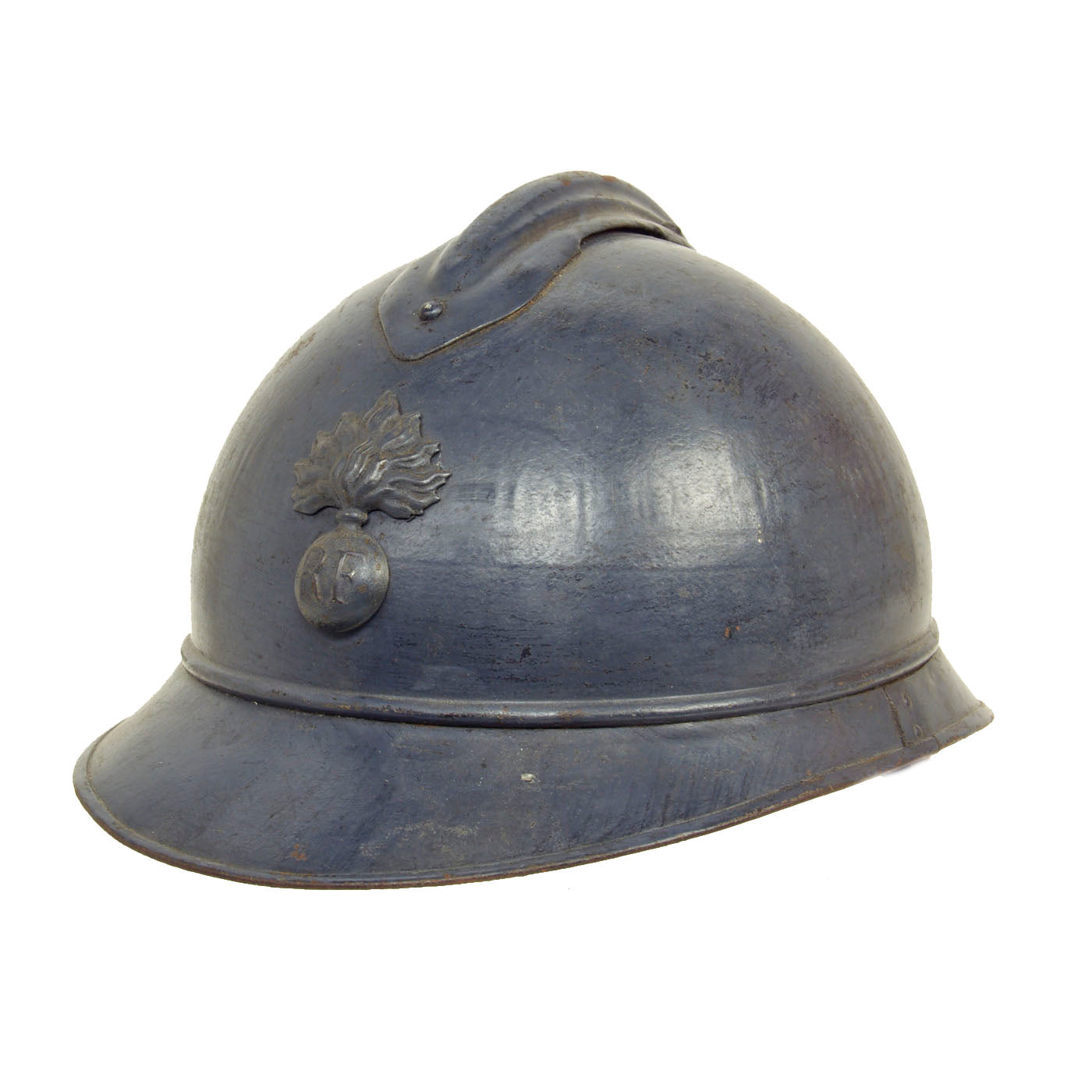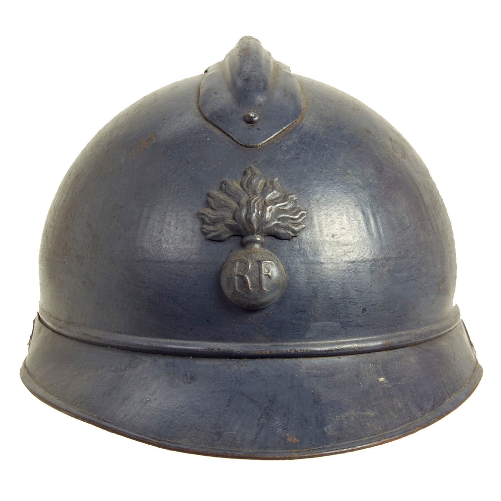 Original Item: Only One Available. This is a nice example of a genuine World War I M-1915 French Army "Adrian" steel helmet, which looks to have seen long service. The front of the helmet still has its original French "Flaming Bomb" badge. The badge has the standard R F on the "bomb", for Republique Francaise. This is the badge used on standard Infantry issue helmets. The helmet shows signs of being repainted several times, which was not uncommon to see a few coats of paint on a helmet in the French Army, especially a helmet as early as this one.