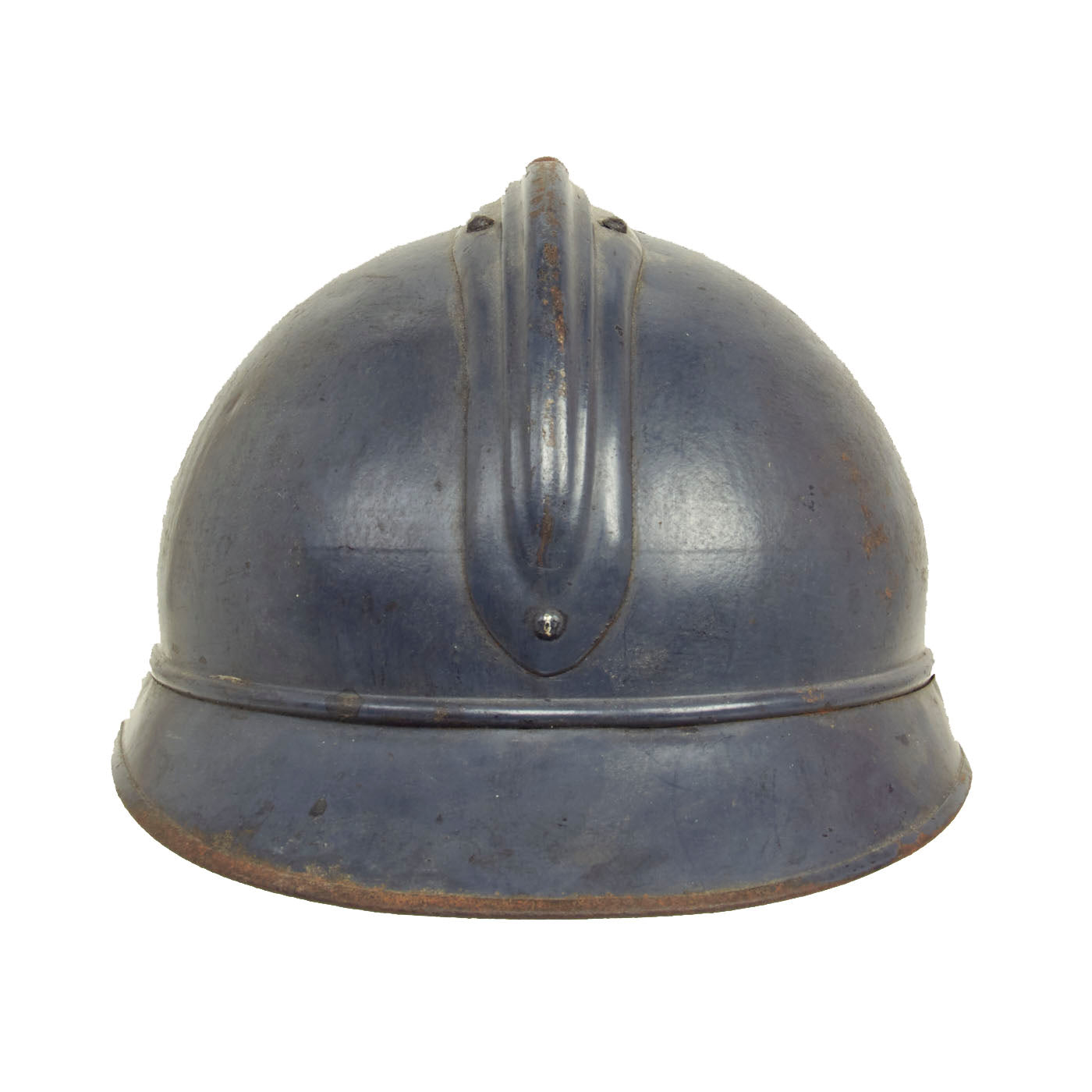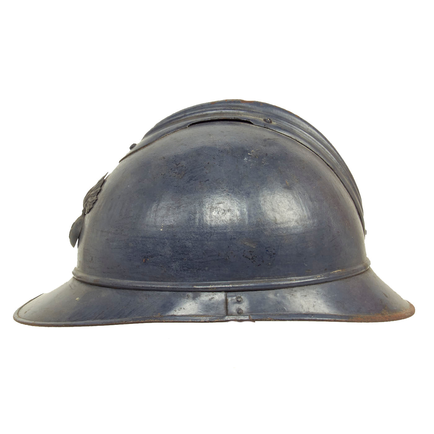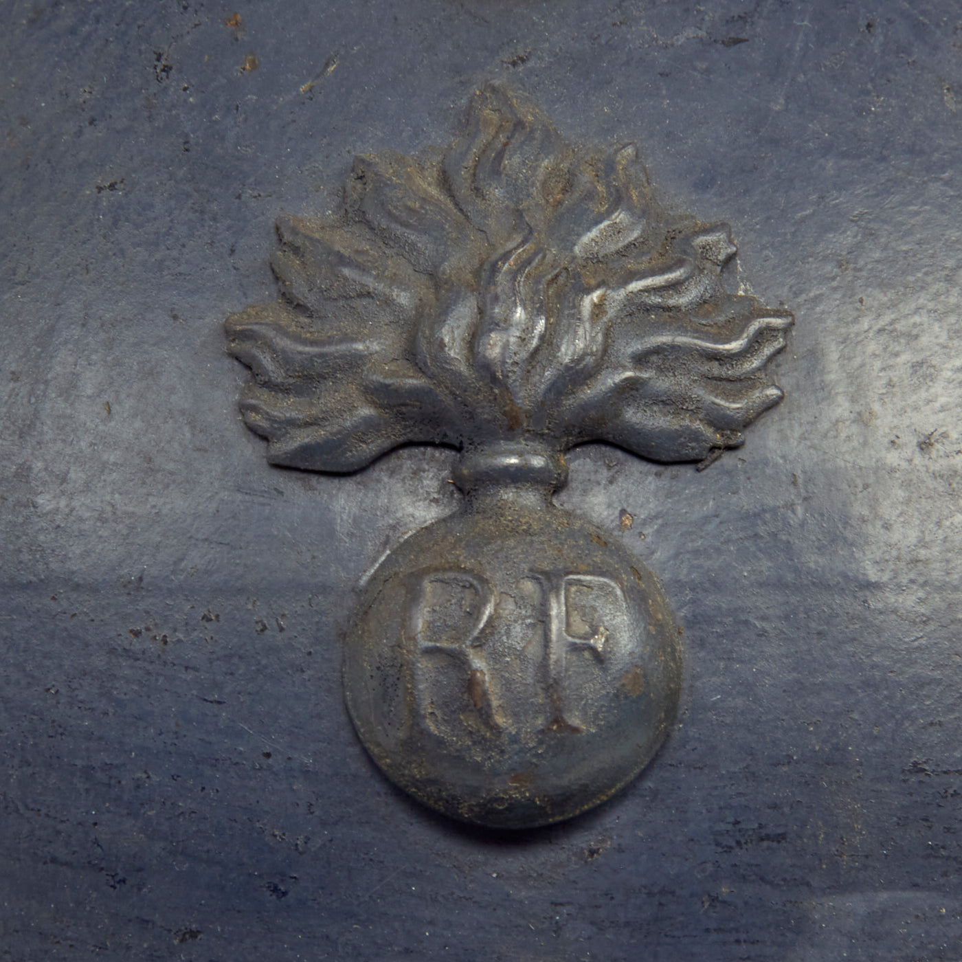 Original Item: Only One Available. This is a nice example of a genuine World War I M-1915 French Army "Adrian" steel helmet, which looks to have seen long service. The front of the helmet still has its original French "Flaming Bomb" badge. The badge has the standard R F on the "bomb", for Republique Francaise. This is the badge used on standard Infantry issue helmets. The helmet shows signs of being repainted several times, which was not uncommon to see a few coats of paint on a helmet in the French Army, especially a helmet as early as this one.