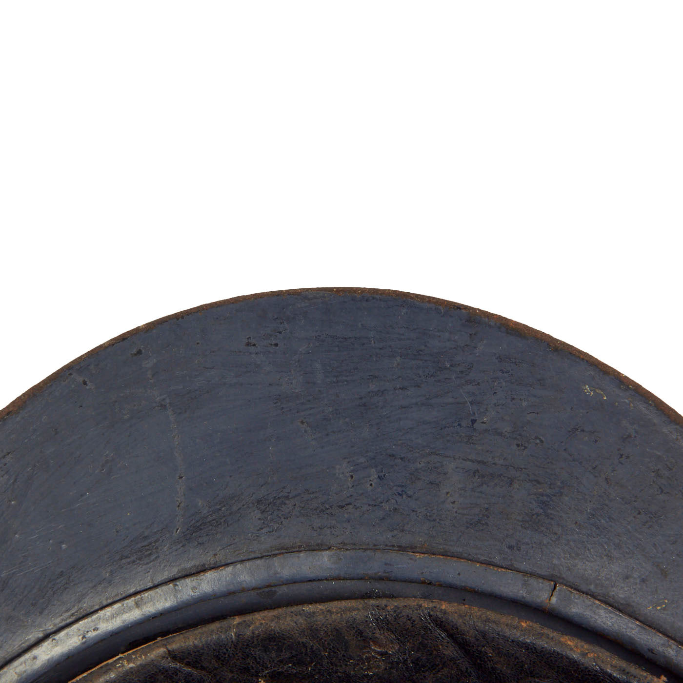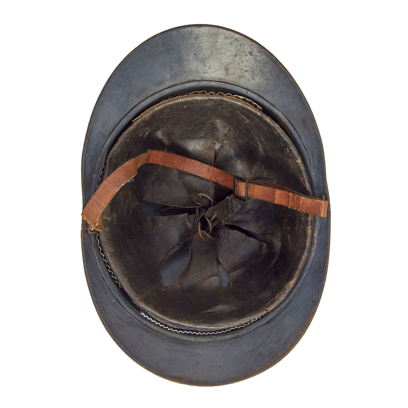 The early 1st Pattern leather liner is present, but is definitely worn, with a lot of the finish present and a few of the fingers have been repaired with additional leather pieces. The helmet does still have a chin strap, which is leather and does have cracking present throughout. Overall condition is good, but definitely worn.
