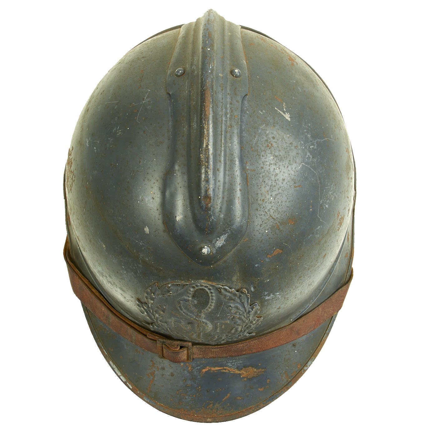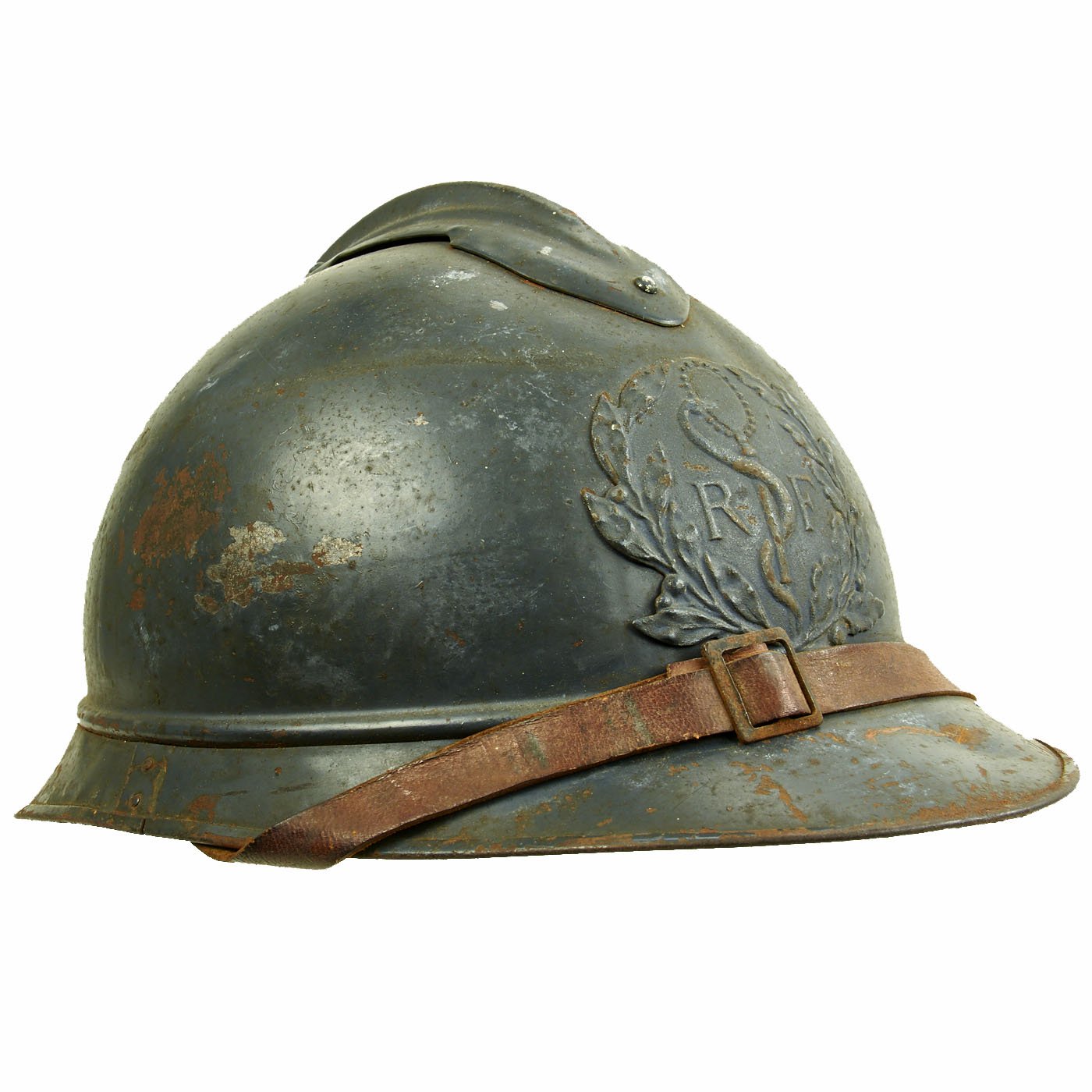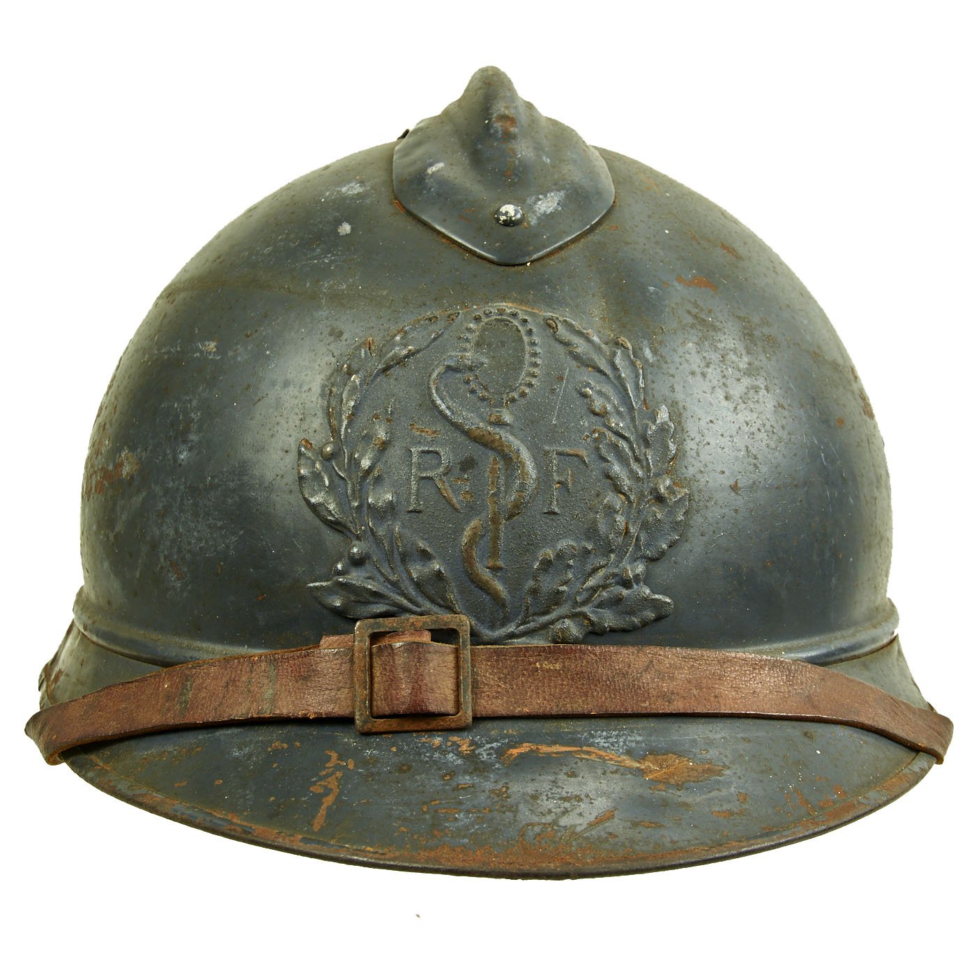 Original Item: Only One Available. This is a very good example of a genuine World War I M1915 French Army "Adrian" steel helmet, outfitted for medical personnel. The helmet retains the original "dark horizon blue" paint on the shell, with a few areas of wear and rust where the paint has chipped. The front of the helmet still has its original French Medical Personnel badge, which has a half Laurel / Half Oak wreath, with the medical "Rod of Asclepius" in the center. Around this is the standard R F on the "bomb", for Republique Francaise. This is the badge used for Field Medics, Combat Surgeons, and other medical personnel operating in the field.