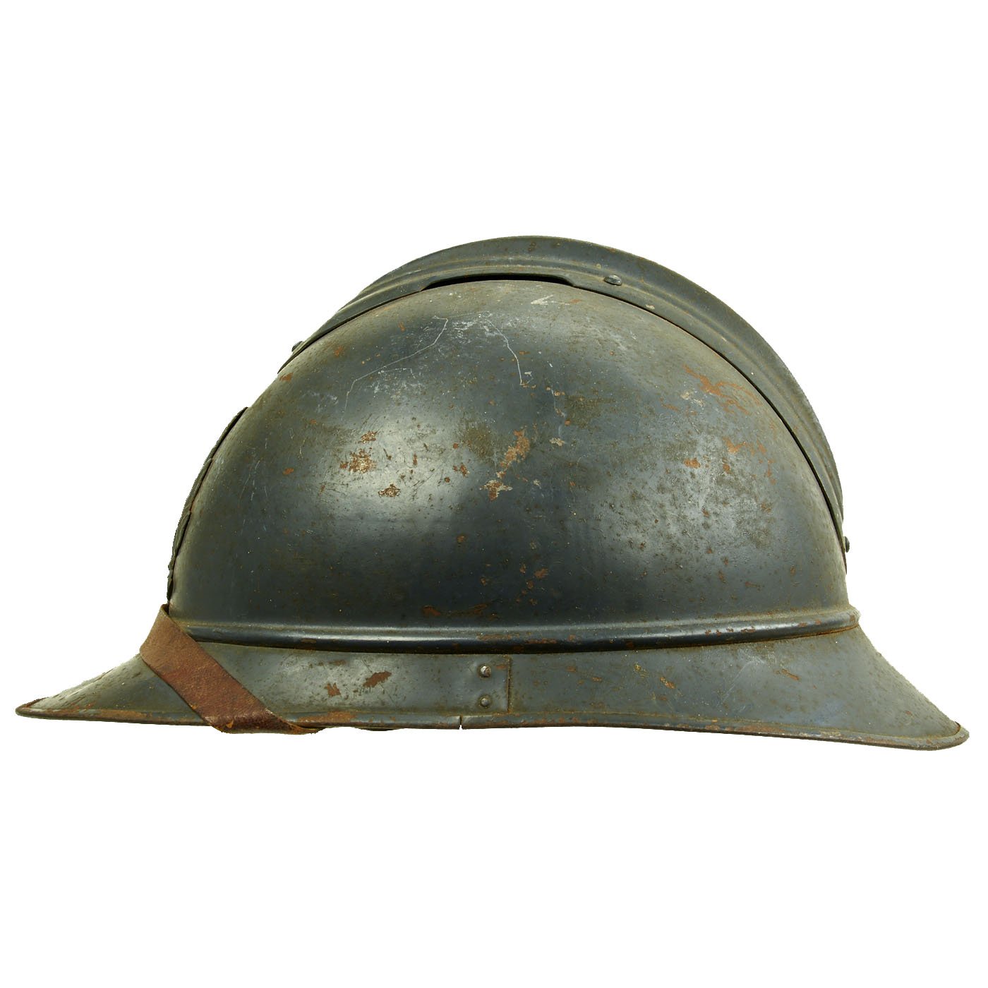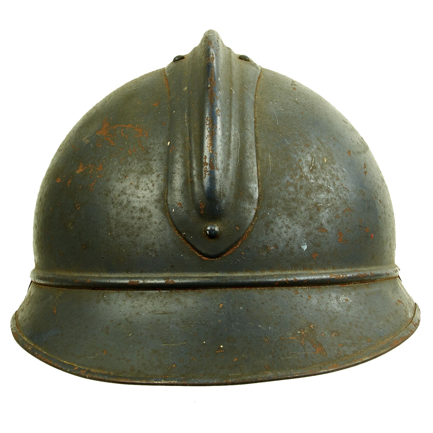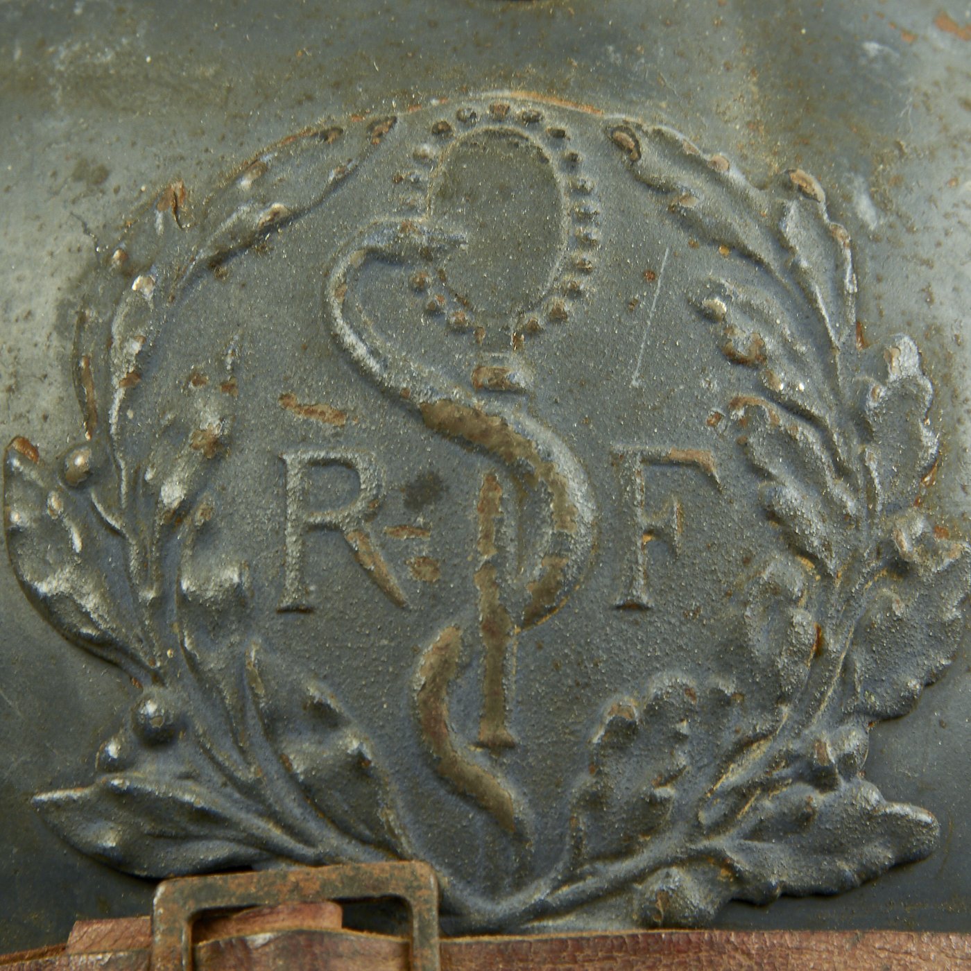 Original Item: Only One Available. This is a very good example of a genuine World War I M1915 French Army "Adrian" steel helmet, outfitted for medical personnel. The helmet retains the original "dark horizon blue" paint on the shell, with a few areas of wear and rust where the paint has chipped. The front of the helmet still has its original French Medical Personnel badge, which has a half Laurel / Half Oak wreath, with the medical "Rod of Asclepius" in the center. Around this is the standard R F on the "bomb", for Republique Francaise. This is the badge used for Field Medics, Combat Surgeons, and other medical personnel operating in the field.