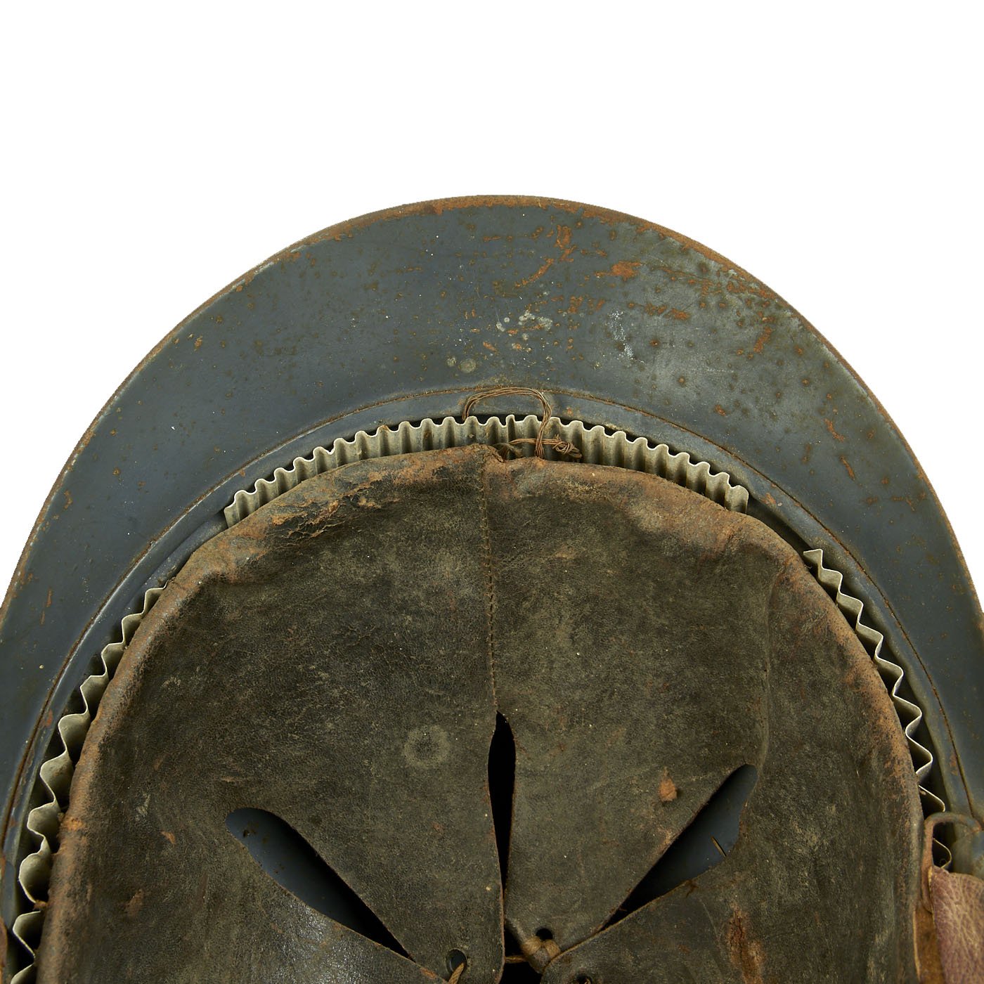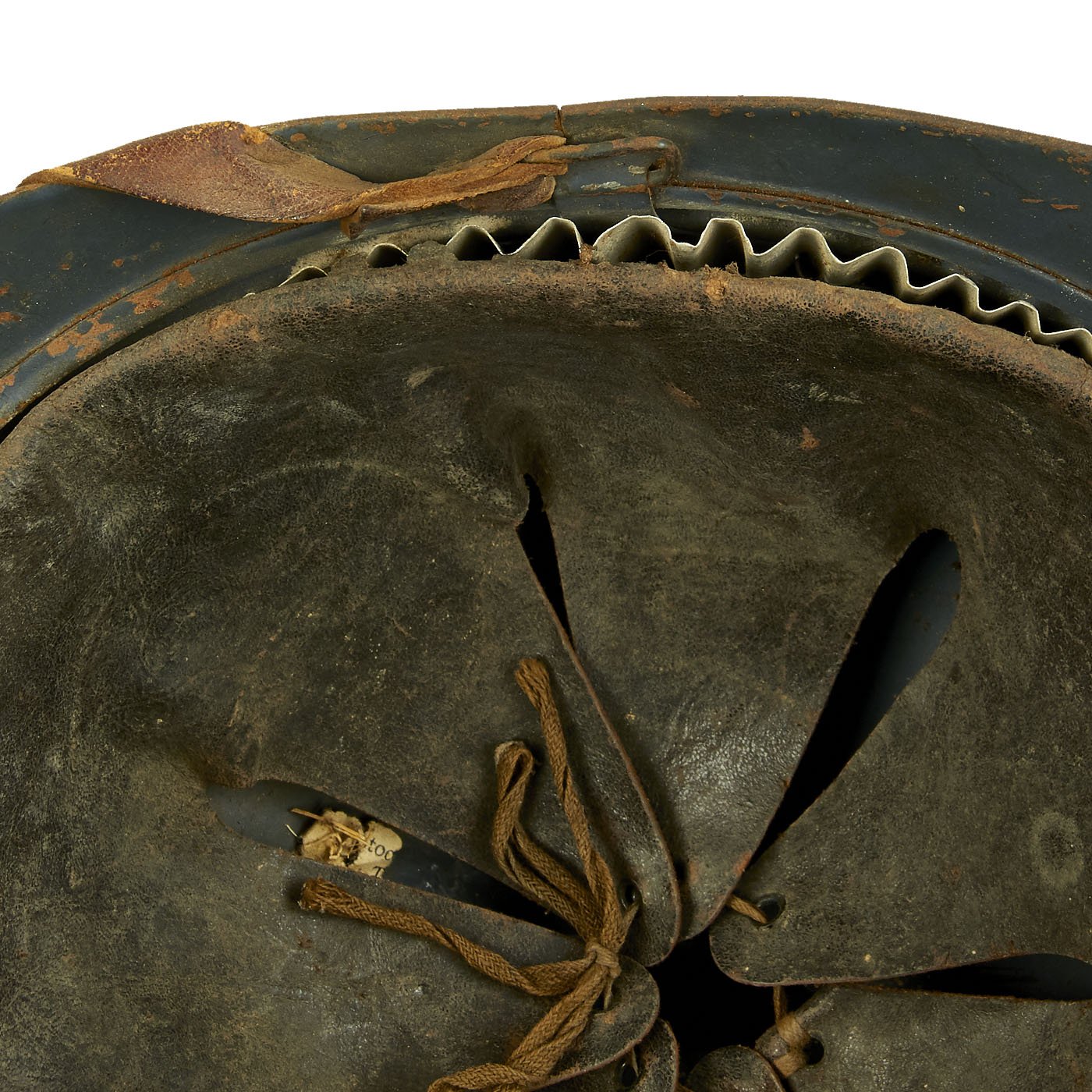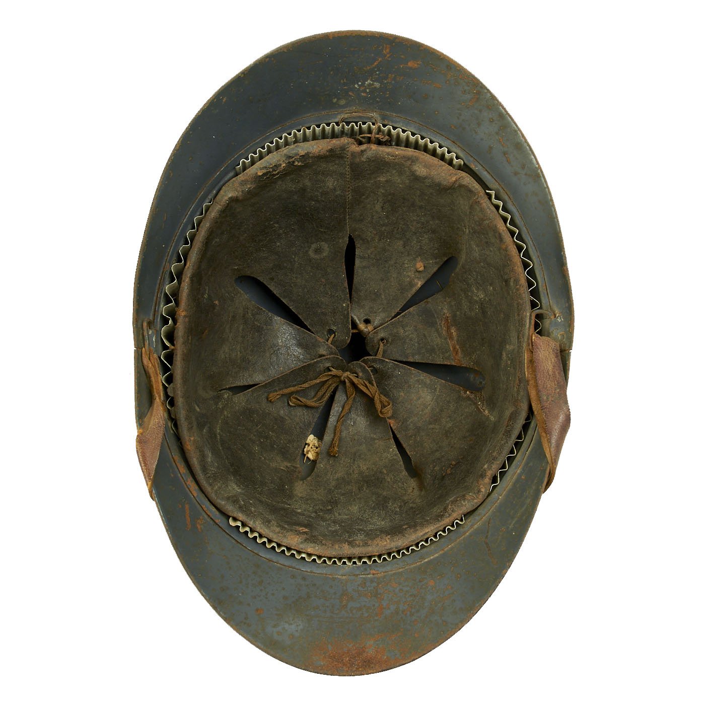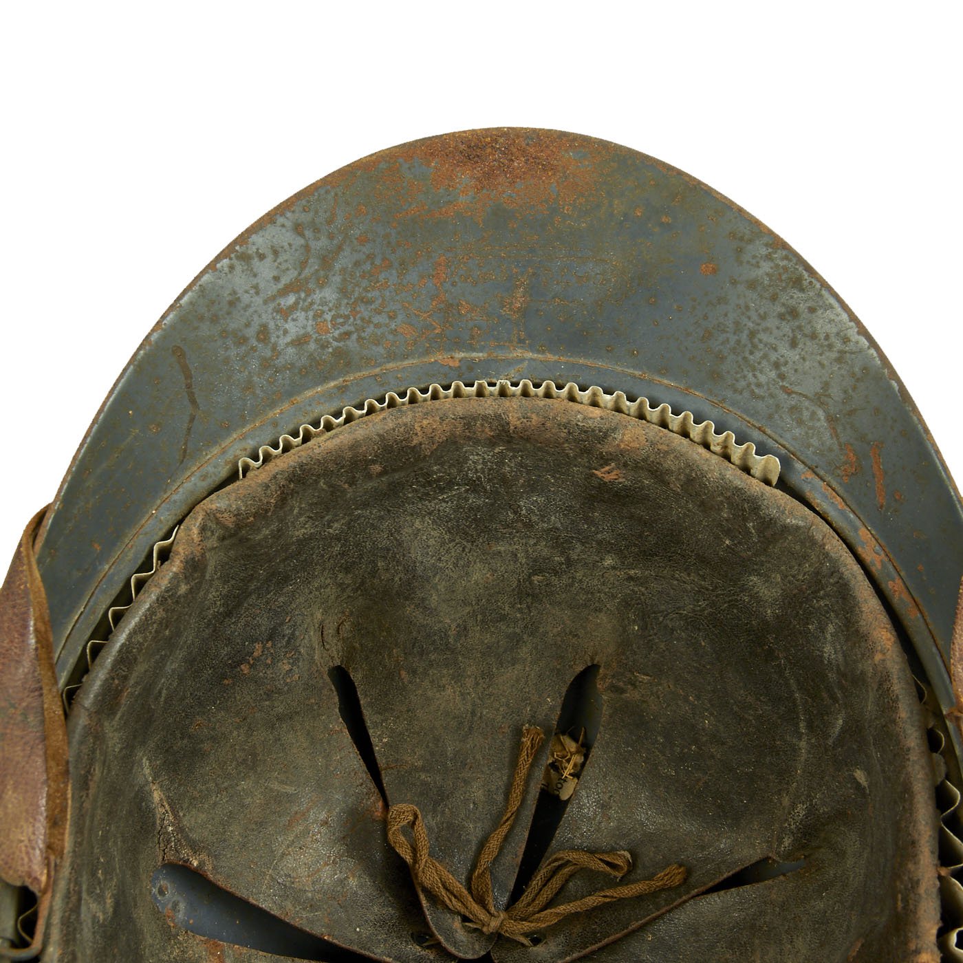 The liner size is around a 58-59cm (7 1/4 - 7 3/8), and is in very good condition, with supple leather and an intact corrugated steel surround. The top tie strap is intact, and the original brown leather chin strap is intact and in good shape.