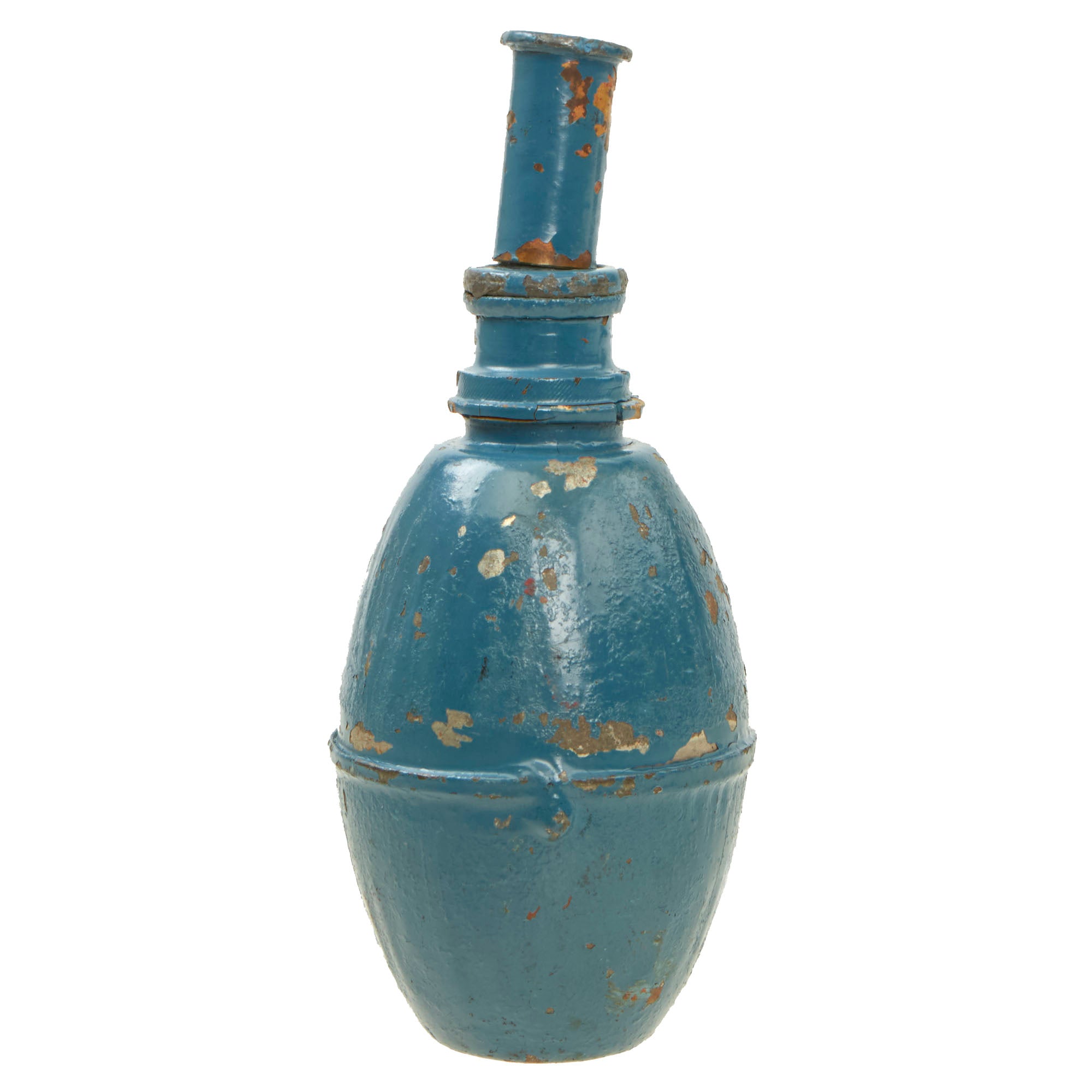 Original Item: Only One Available. This is totally inert BATF compliant genuine World War One French Grenade Suffocante modèle 1916 (Suffocating Grenade Model 1916) tear gas practice grenade. It is the correct blue color for practice and has a simulated fuse with cap.