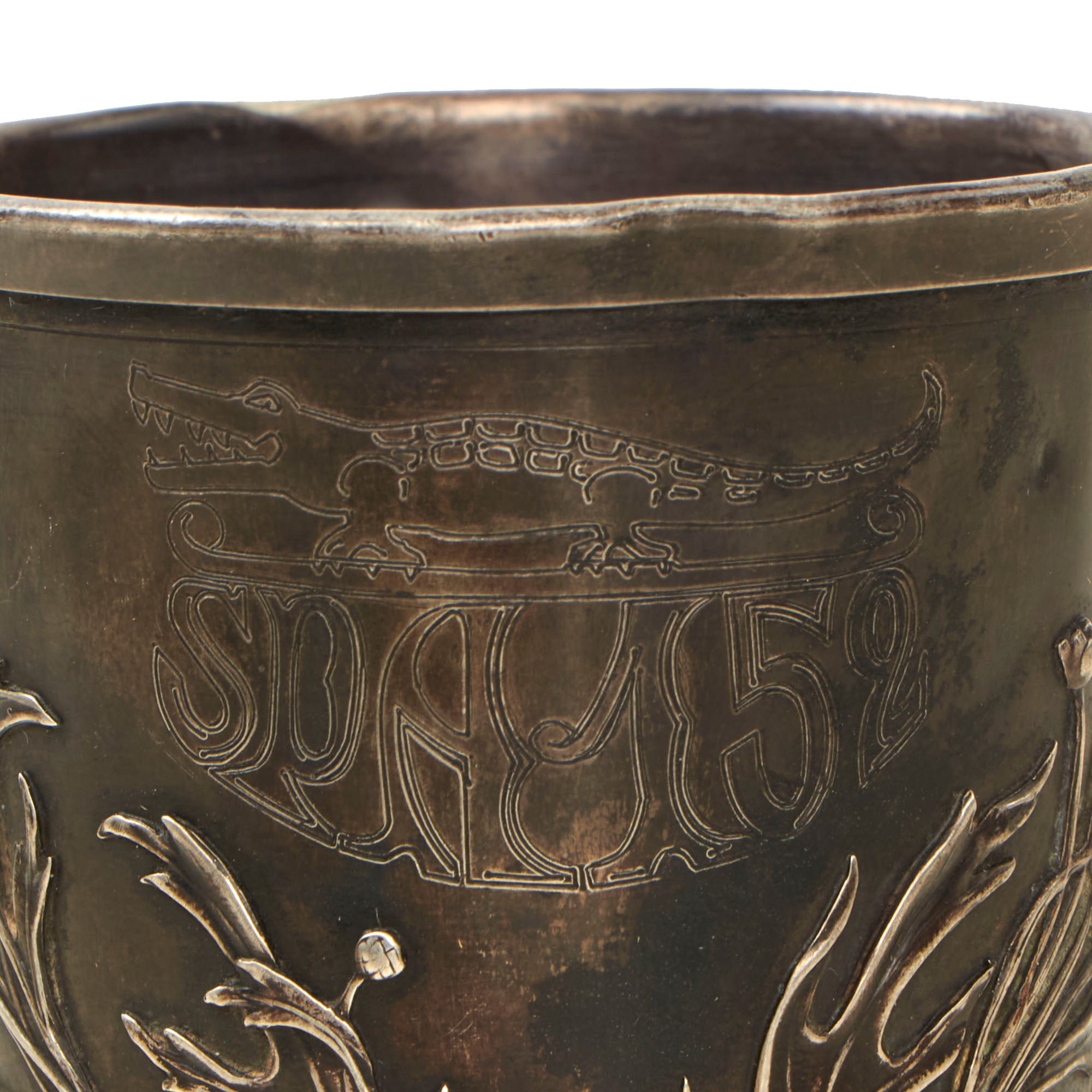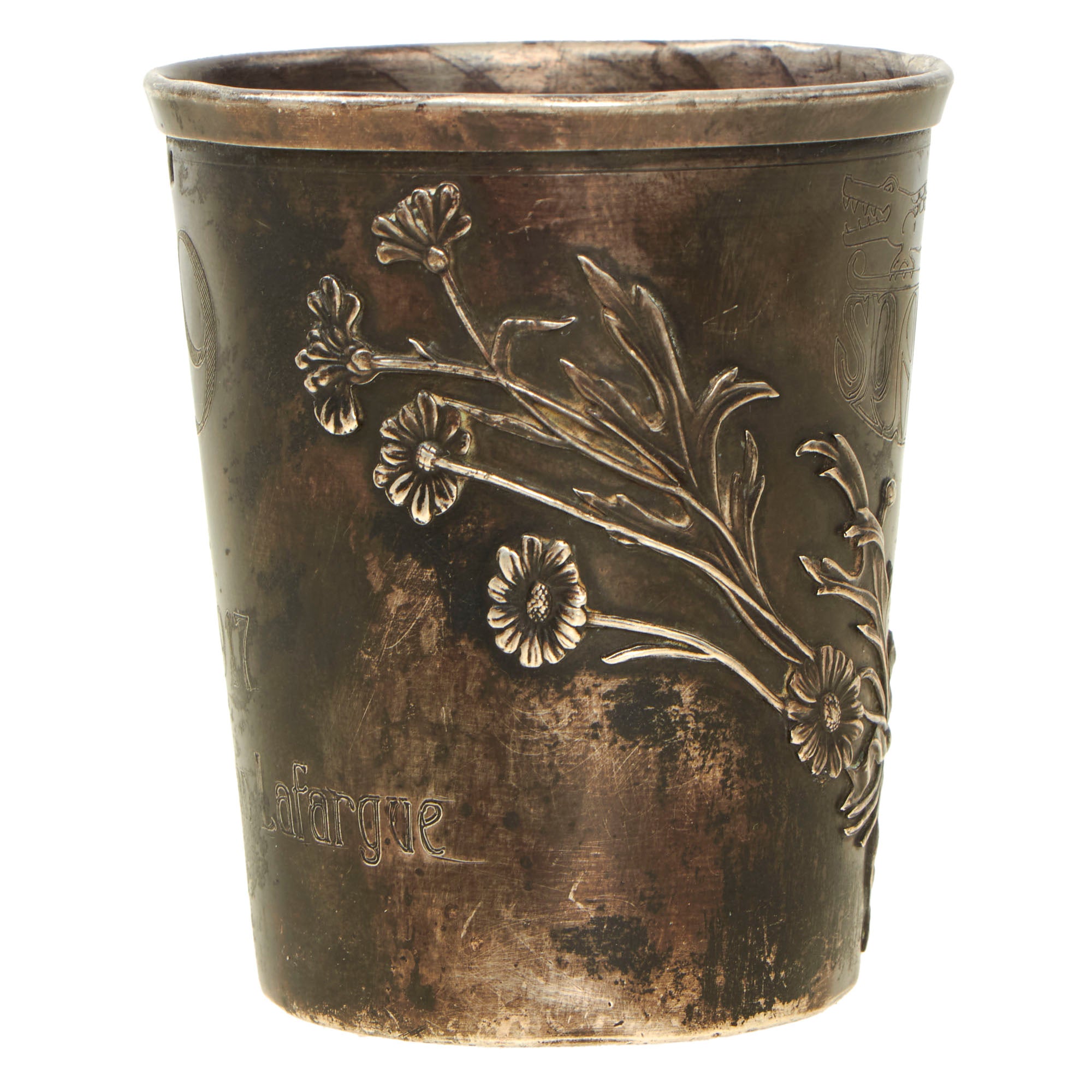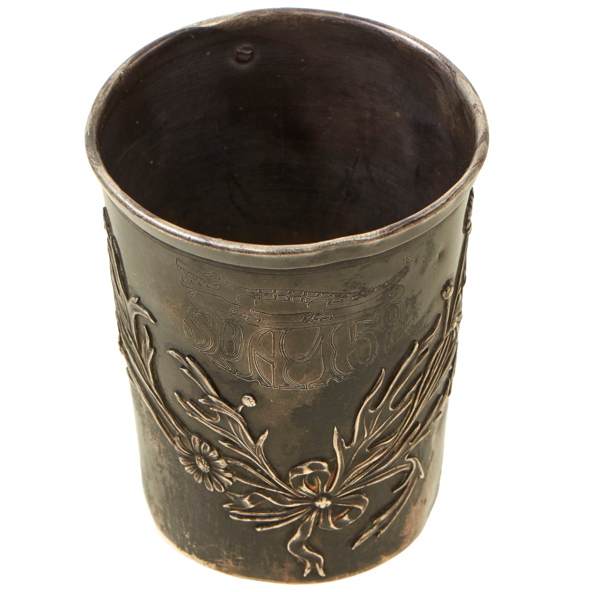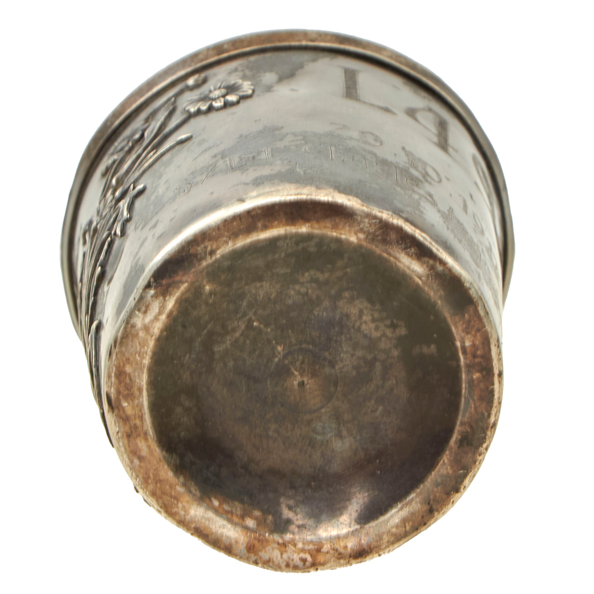 The cup itself is in fantastic condition though the silver surface is now covered in a dark patina, which we left in place. It measures approximately 3 ⅛” tall with a mouth width of 2 ⅝” and a base width of 2”.
