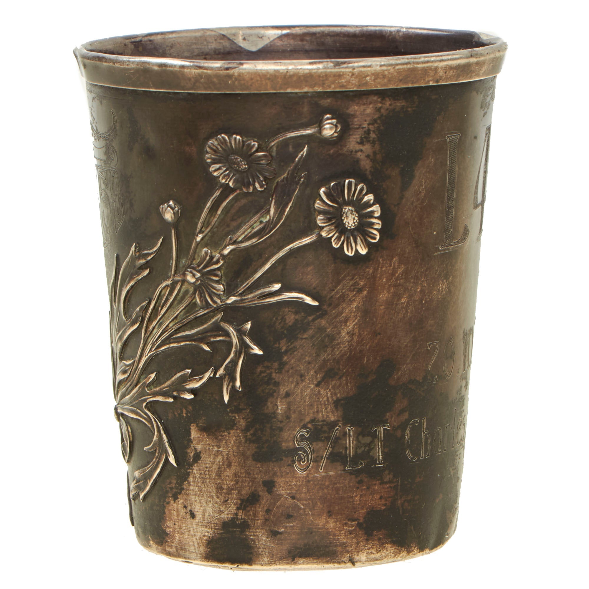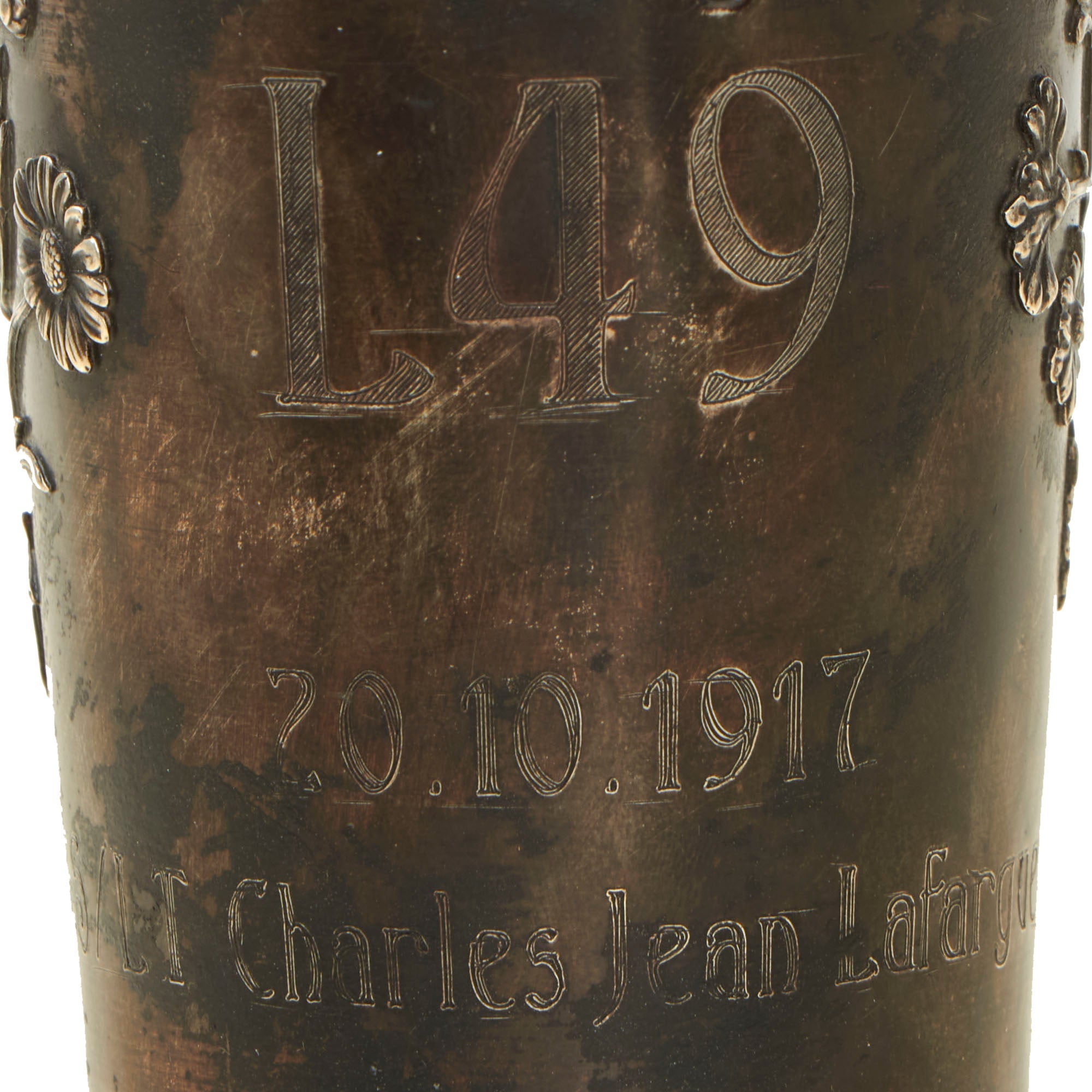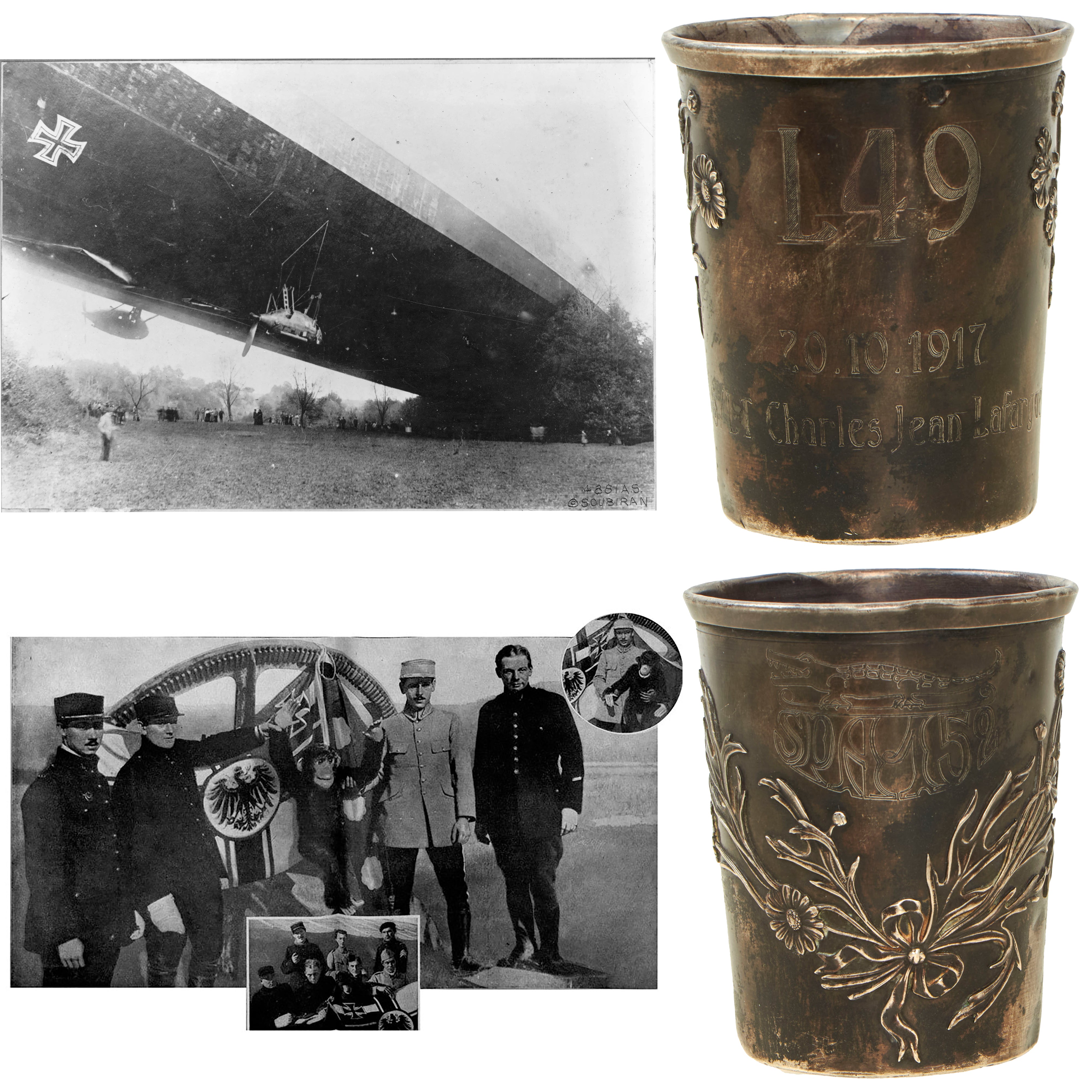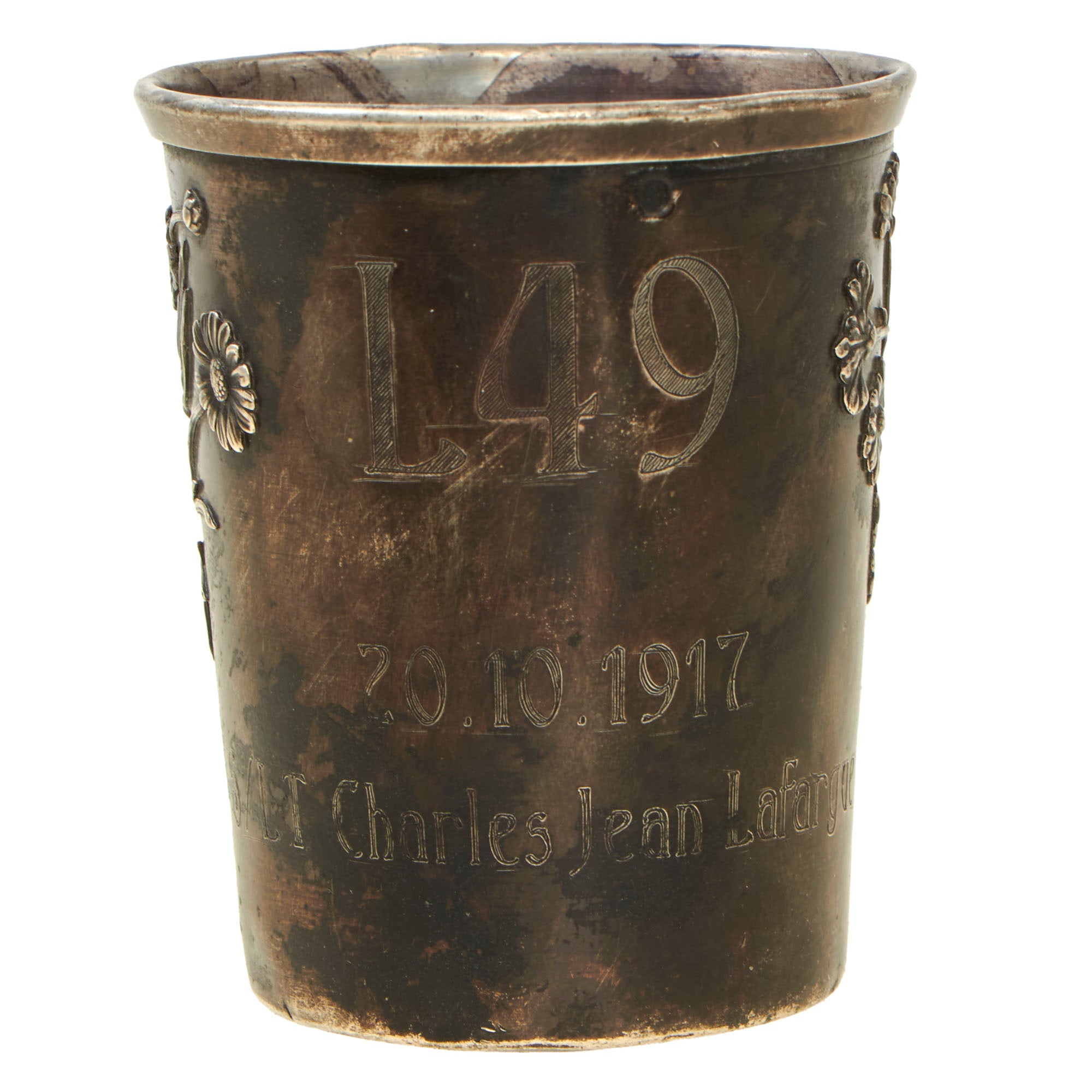 Original Item: One-Of-A-Kind. This is an incredible piece of WWI history! This small silver cup was decorated to be used as a commemorative item for Sgt (Sub/Lt.) Charles Jean LaFargue of Escadrille Spa.152 “Crocodile” Squadron. What sets this cup apart from the many other encountered, is the fact that it was for LaFargue’s involvement in shooting down the German Airship L49. While shooting down a floating city may not seem that big of a feat, the L49 was the first German Zeppelin to have been successfully captured intact!