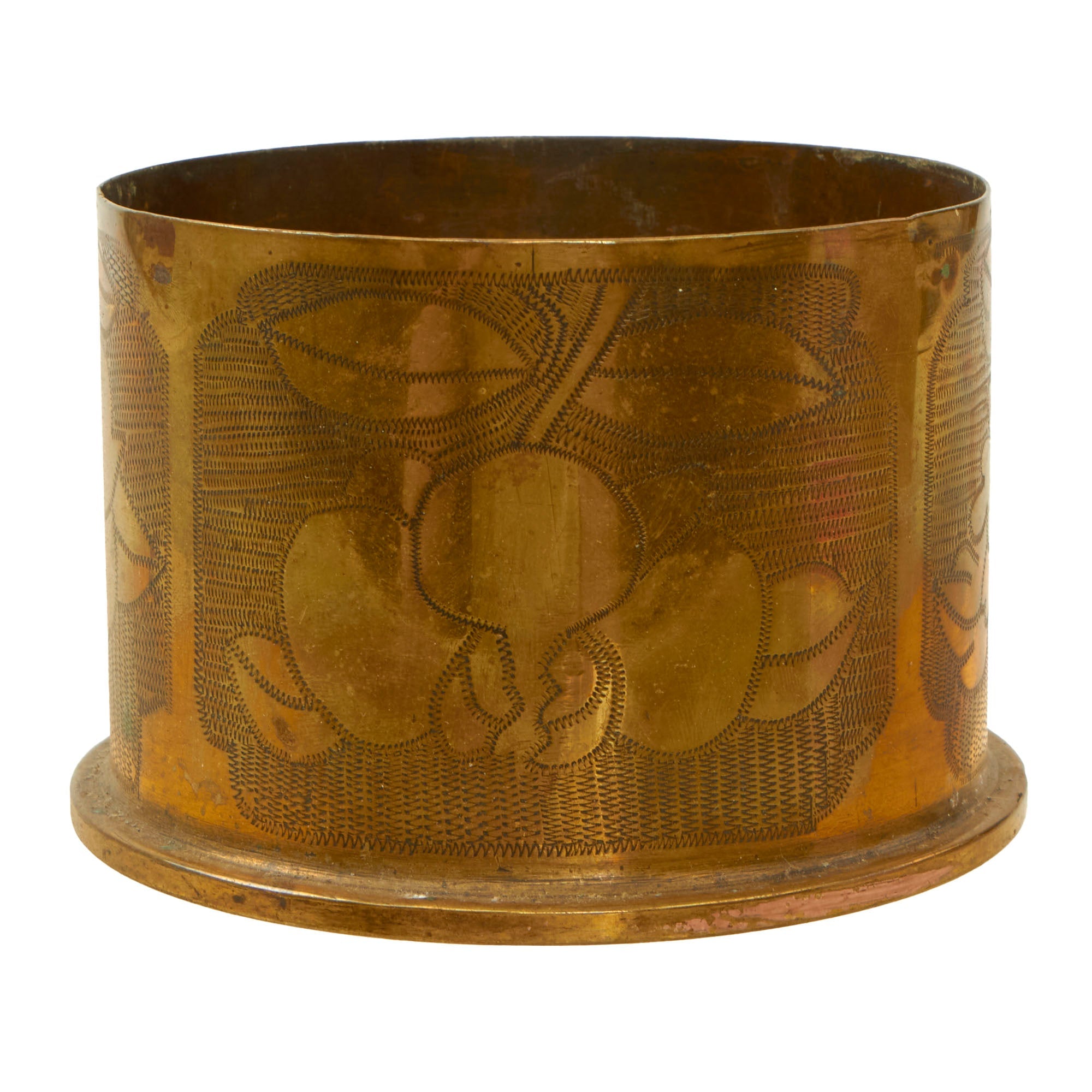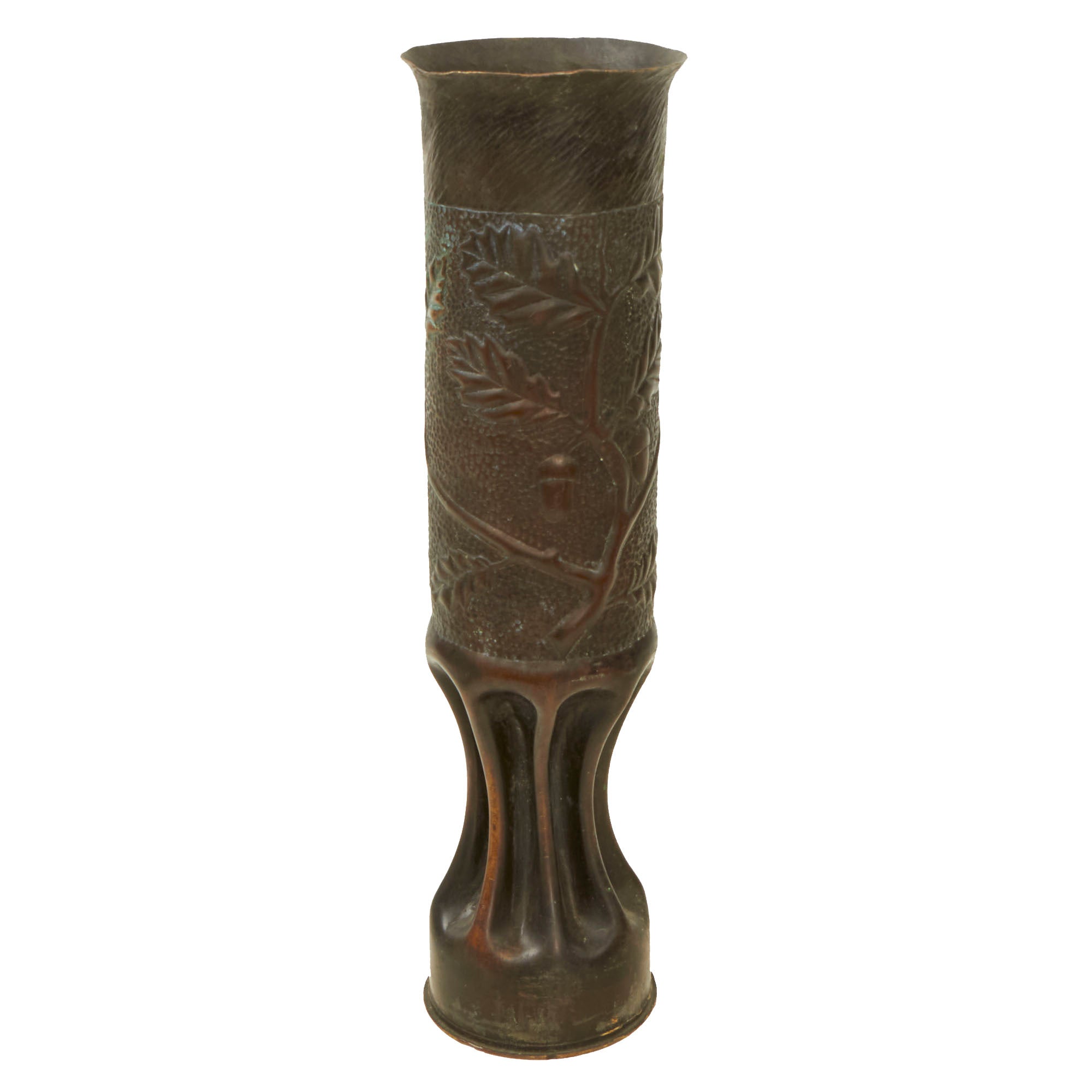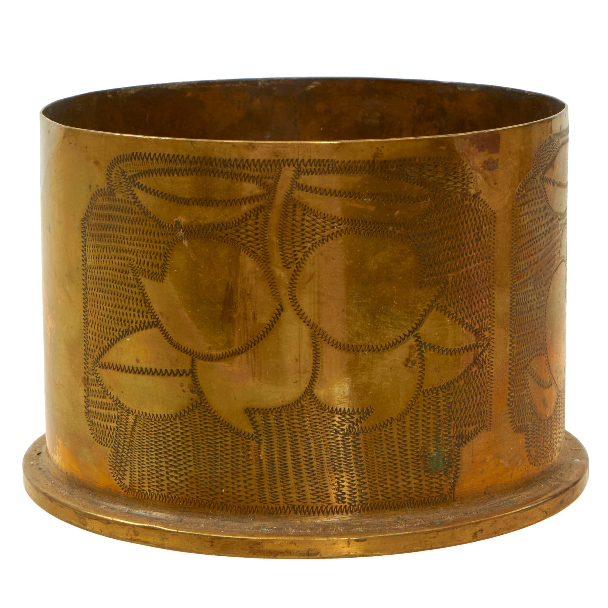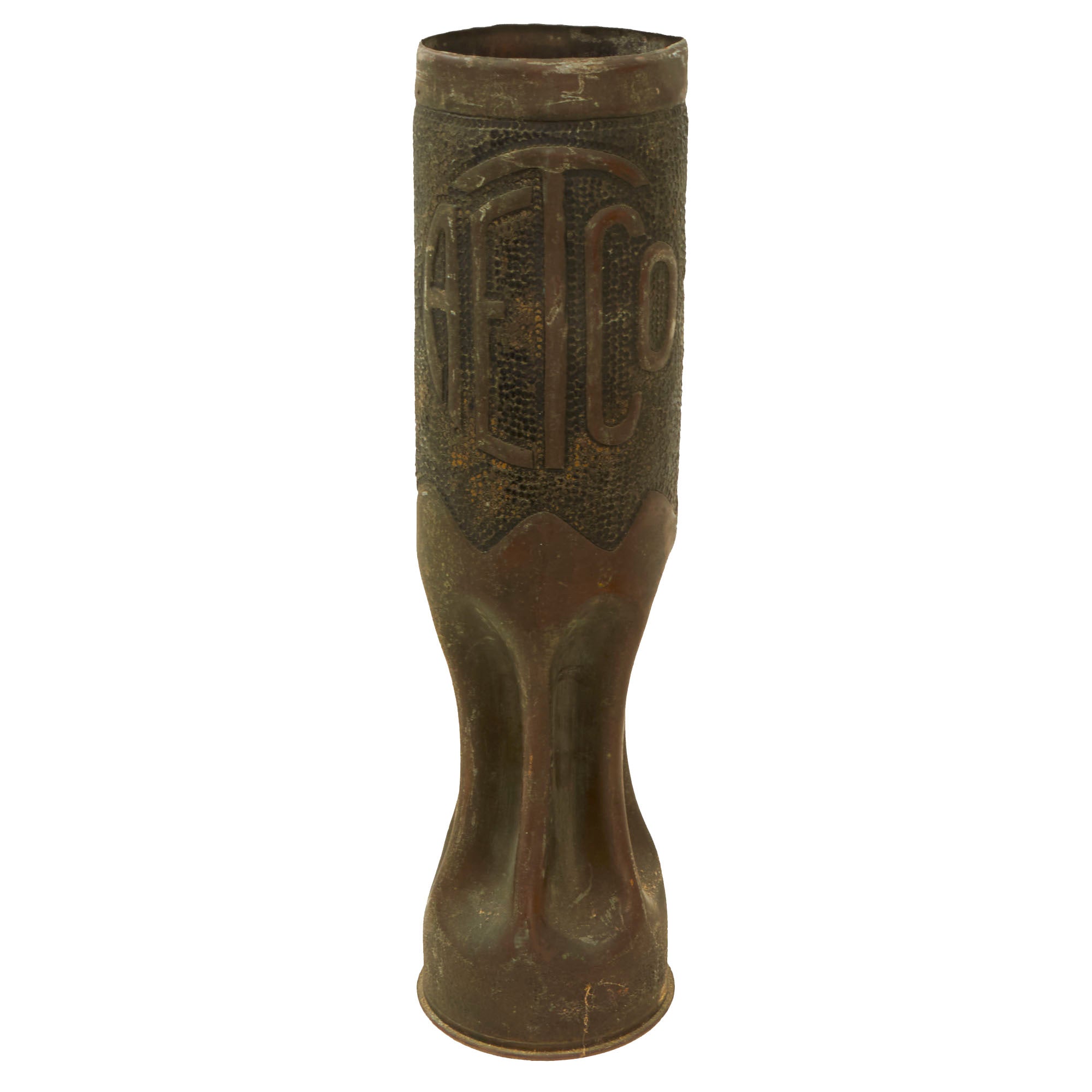 The two matching 75mm shells depict oak leaves and acorns with stylized and flared tops. They are both dated 1916 and are 13½” tall. The third 75mm shell is dated 1918, measures 12¼” tall and has a strange set of letters stylized as a circle, AETCO. We haven’t found any information about this, making for a good research project. The British howitzer shell is similarly engraved with greenery and is dated 1917. It is 5¼” in diameter and 3½” tall.