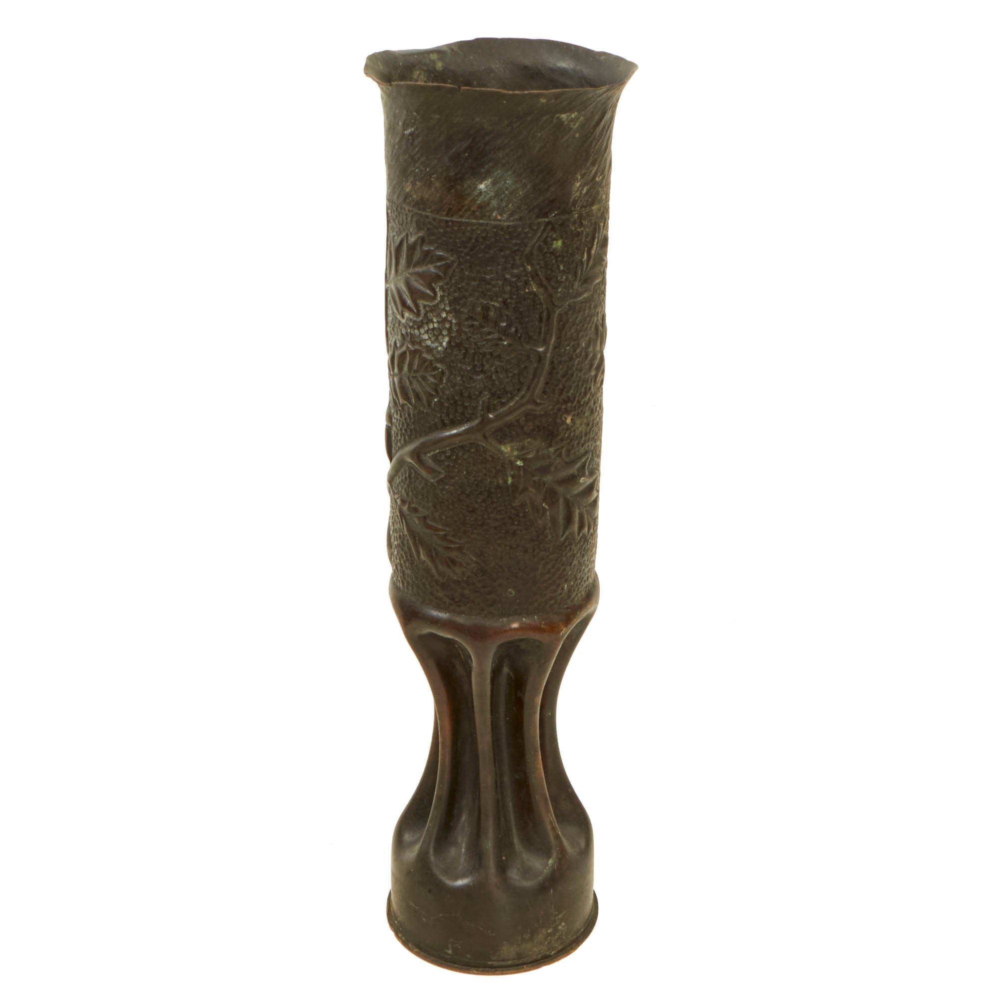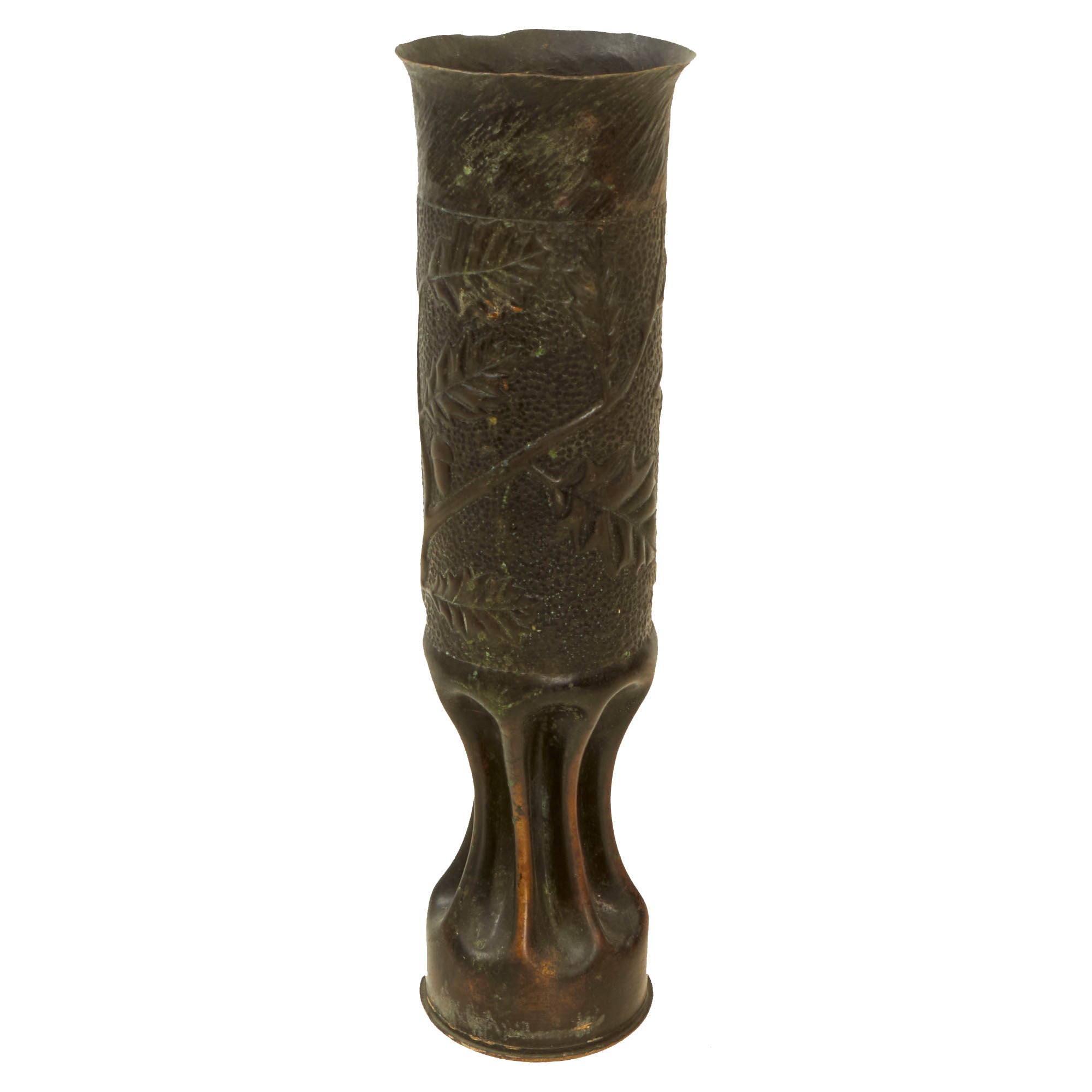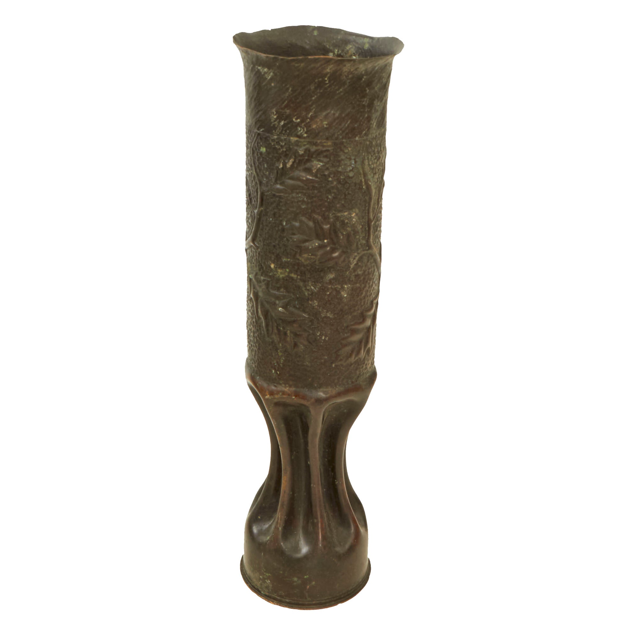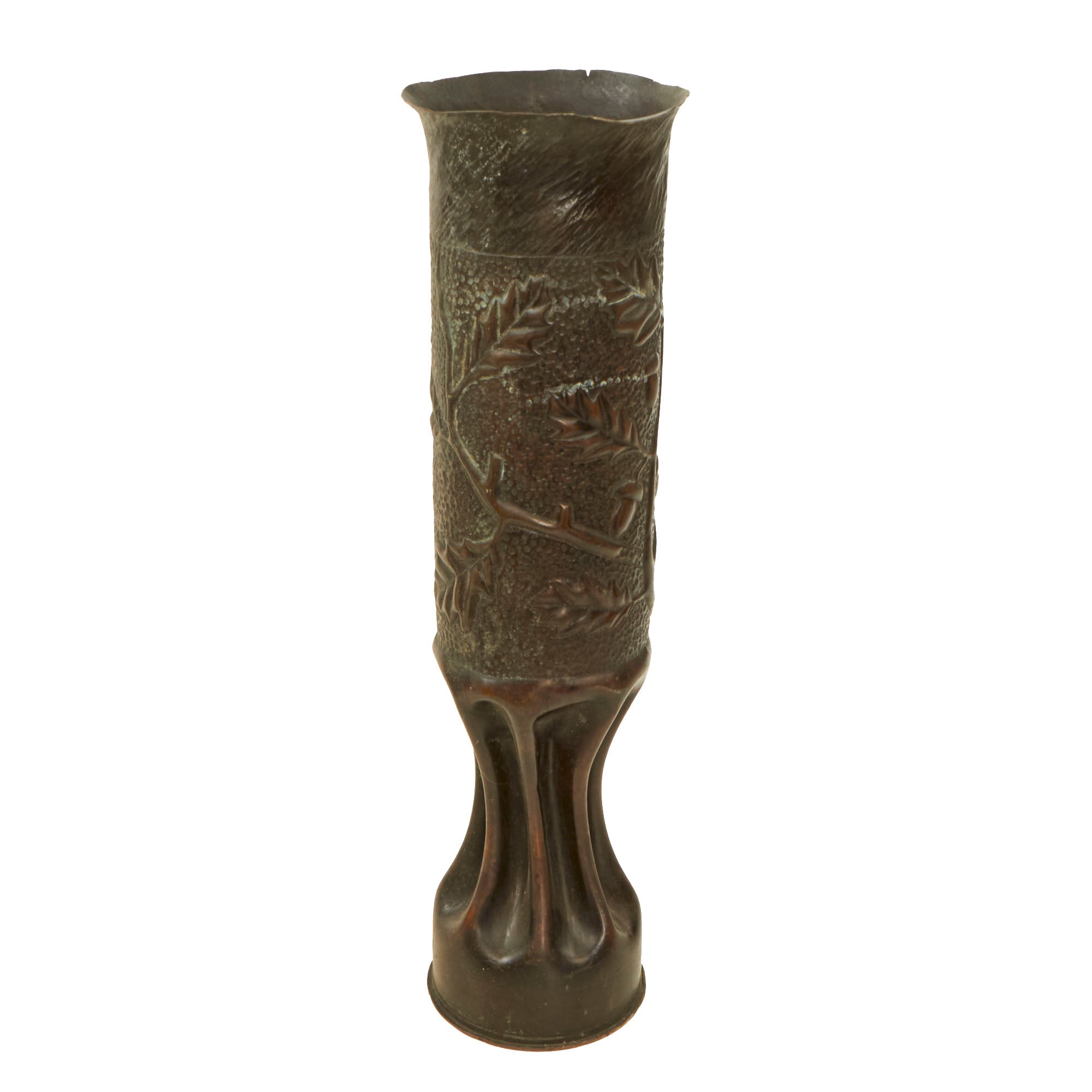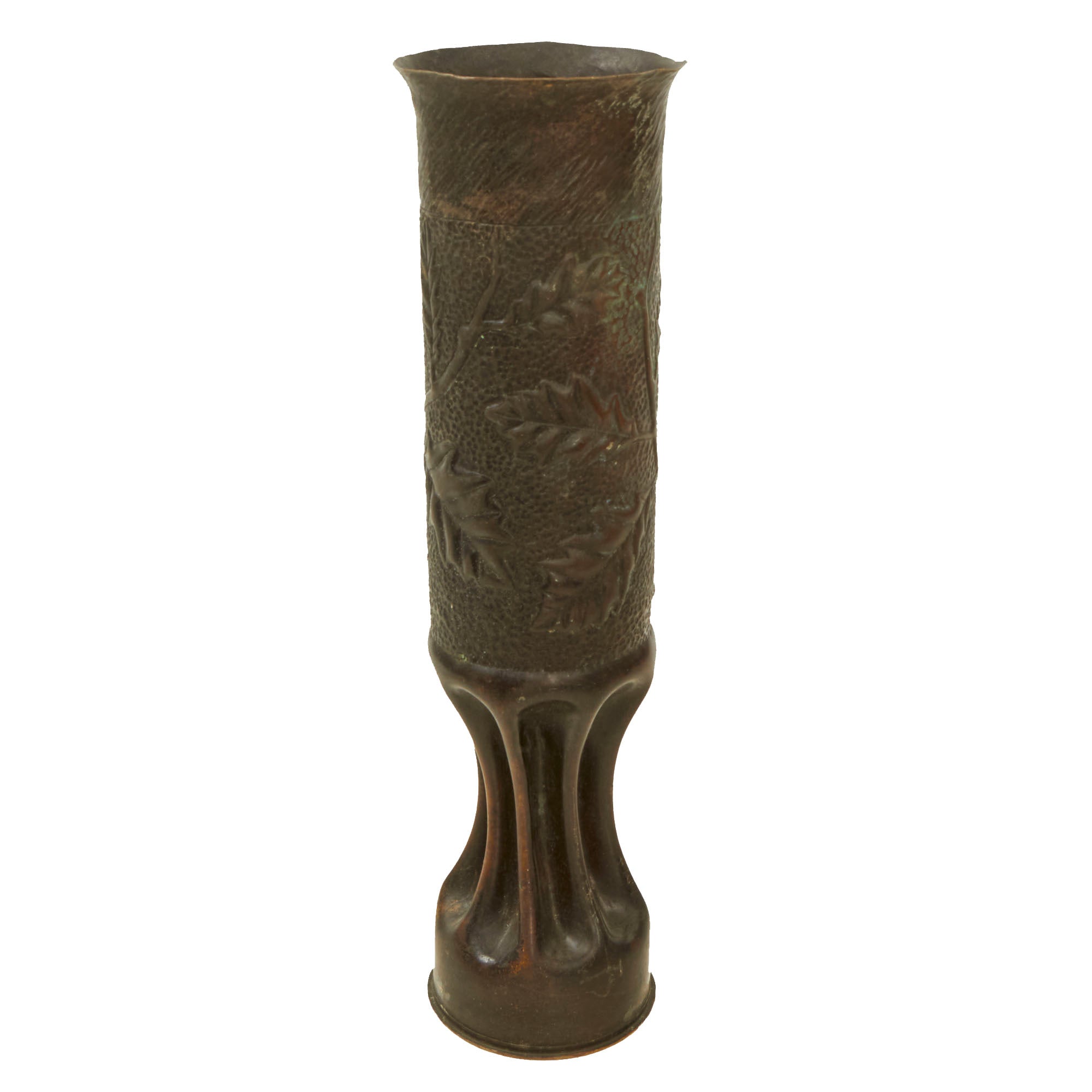The two matching 75mm shells depict oak leaves and acorns with stylized and flared tops. They are both dated 1916 and are 13½” tall. The third 75mm shell is dated 1918, measures 12¼” tall and has a strange set of letters stylized as a circle, AETCO. We haven’t found any information about this, making for a good research project. The British howitzer shell is similarly engraved with greenery and is dated 1917. It is 5¼” in diameter and 3½” tall.
