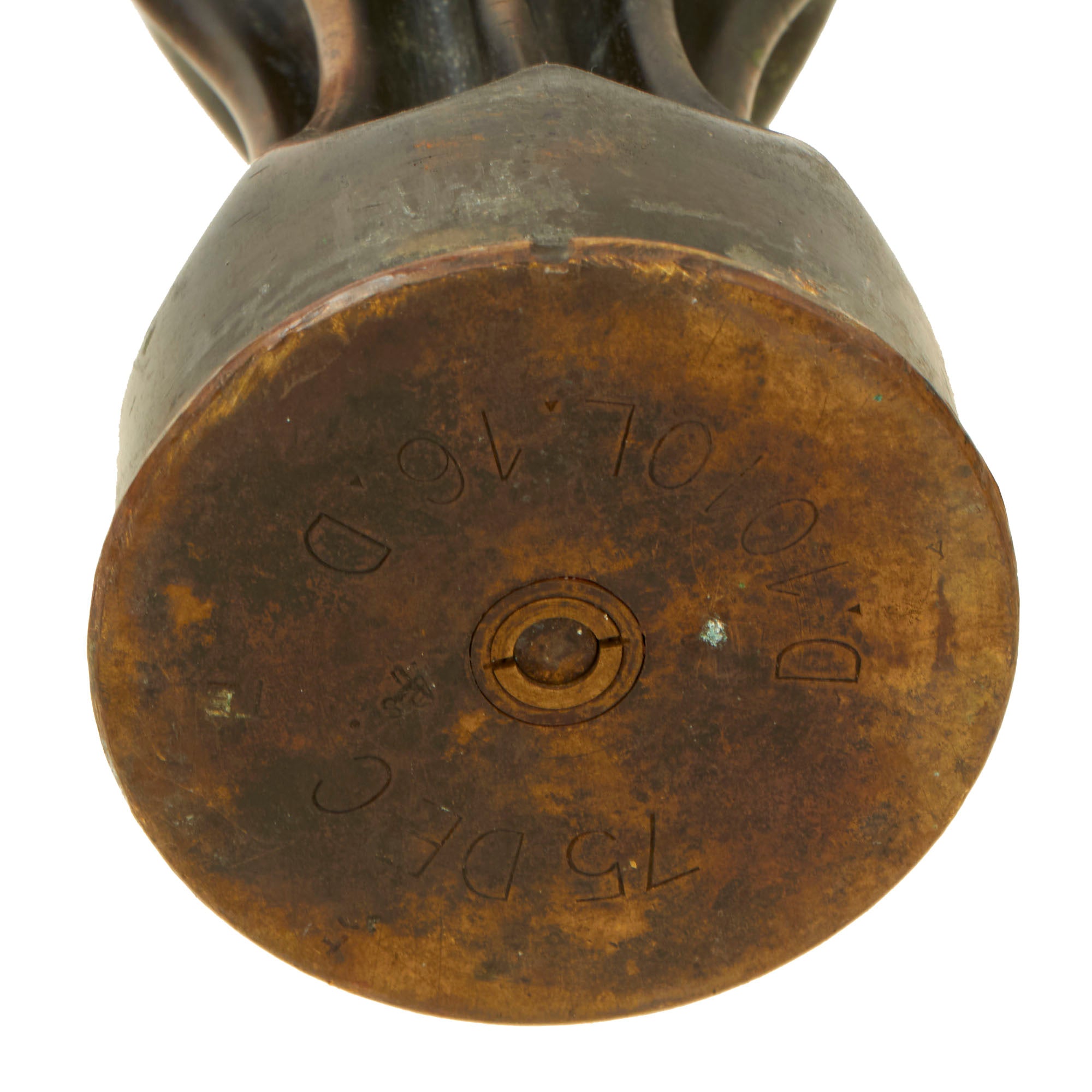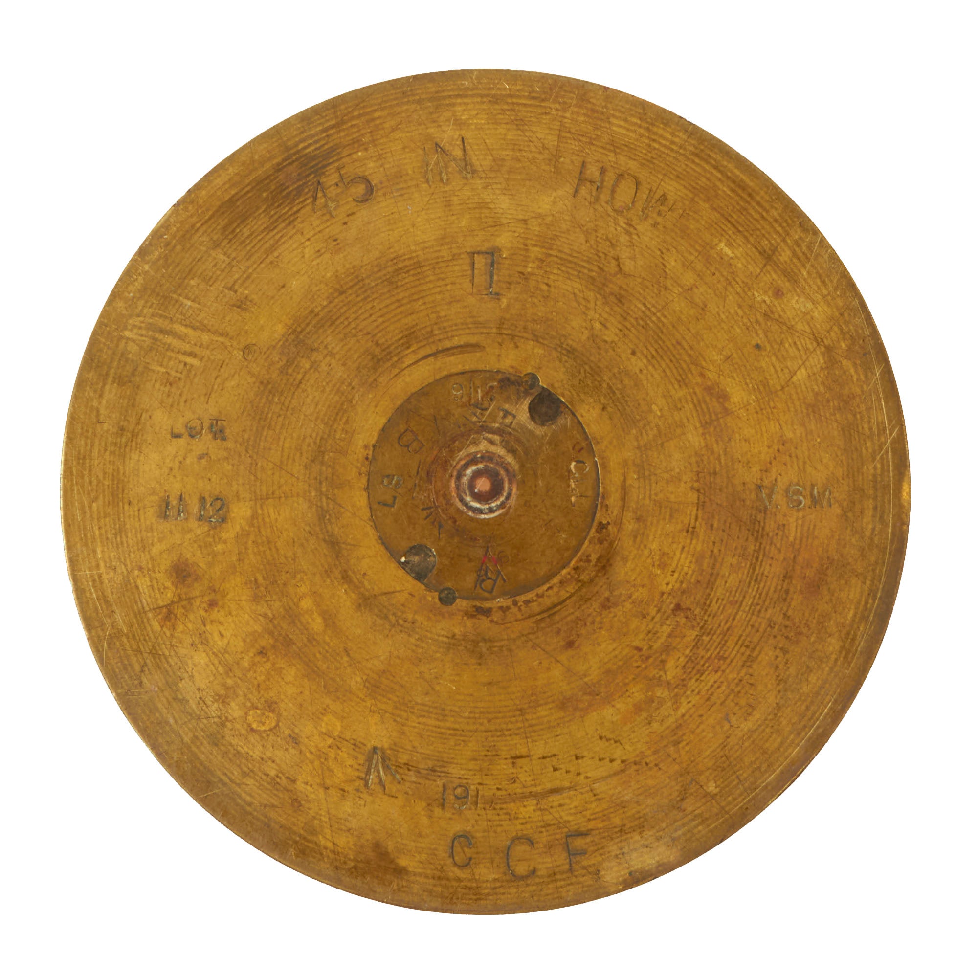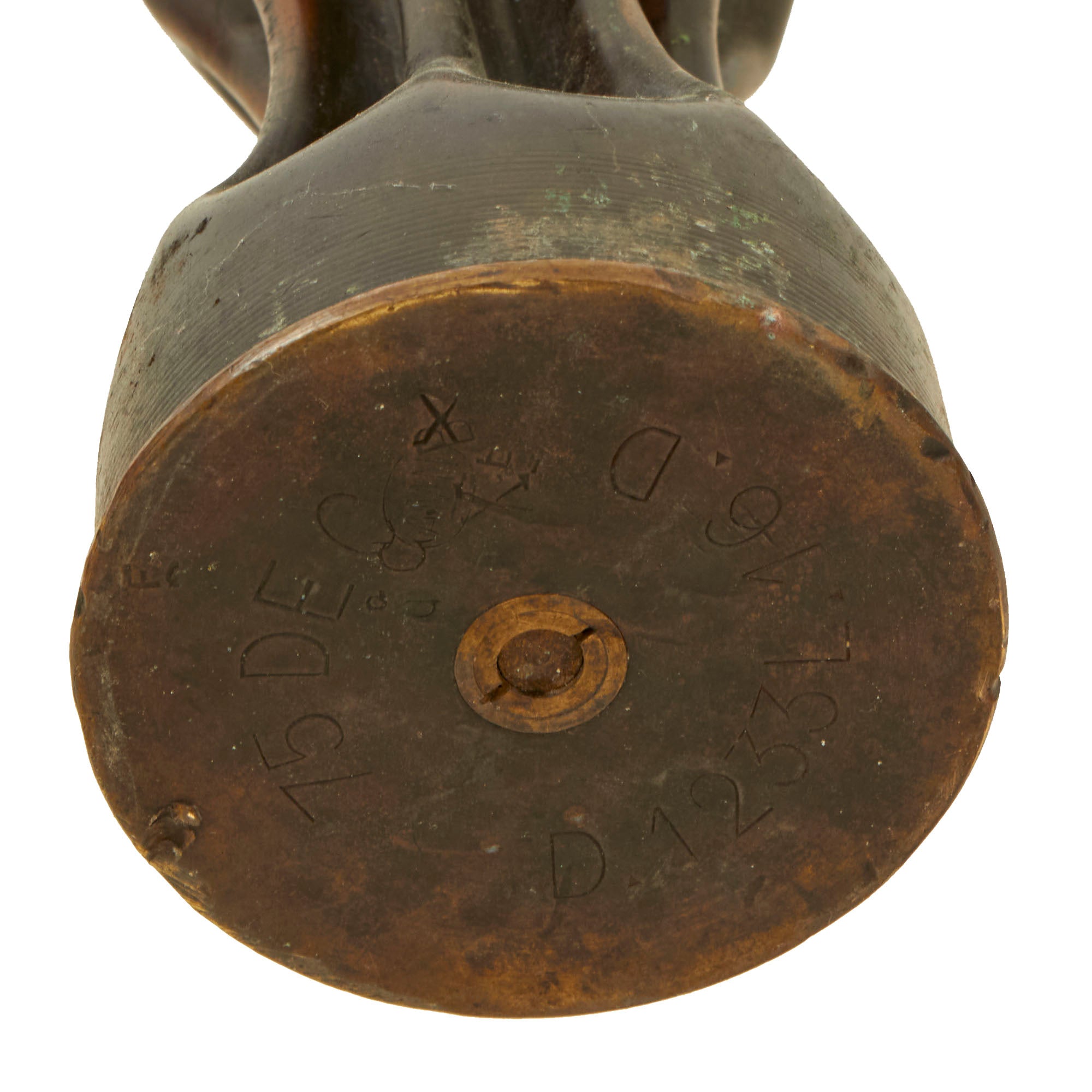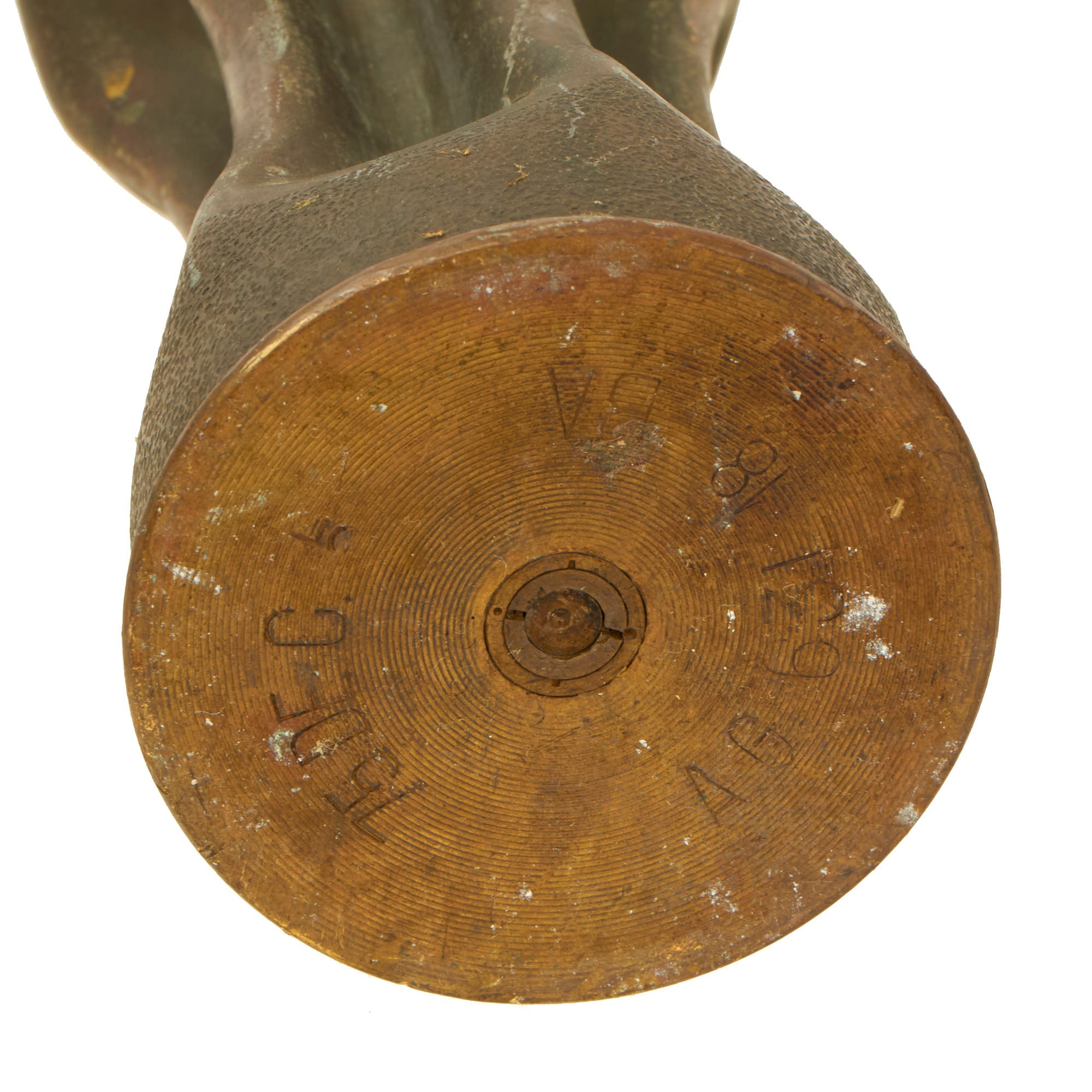 The two matching 75mm shells depict oak leaves and acorns with stylized and flared tops. They are both dated 1916 and are 13½” tall. The third 75mm shell is dated 1918, measures 12¼” tall and has a strange set of letters stylized as a circle, AETCO. We haven’t found any information about this, making for a good research project. The British howitzer shell is similarly engraved with greenery and is dated 1917. It is 5¼” in diameter and 3½” tall.