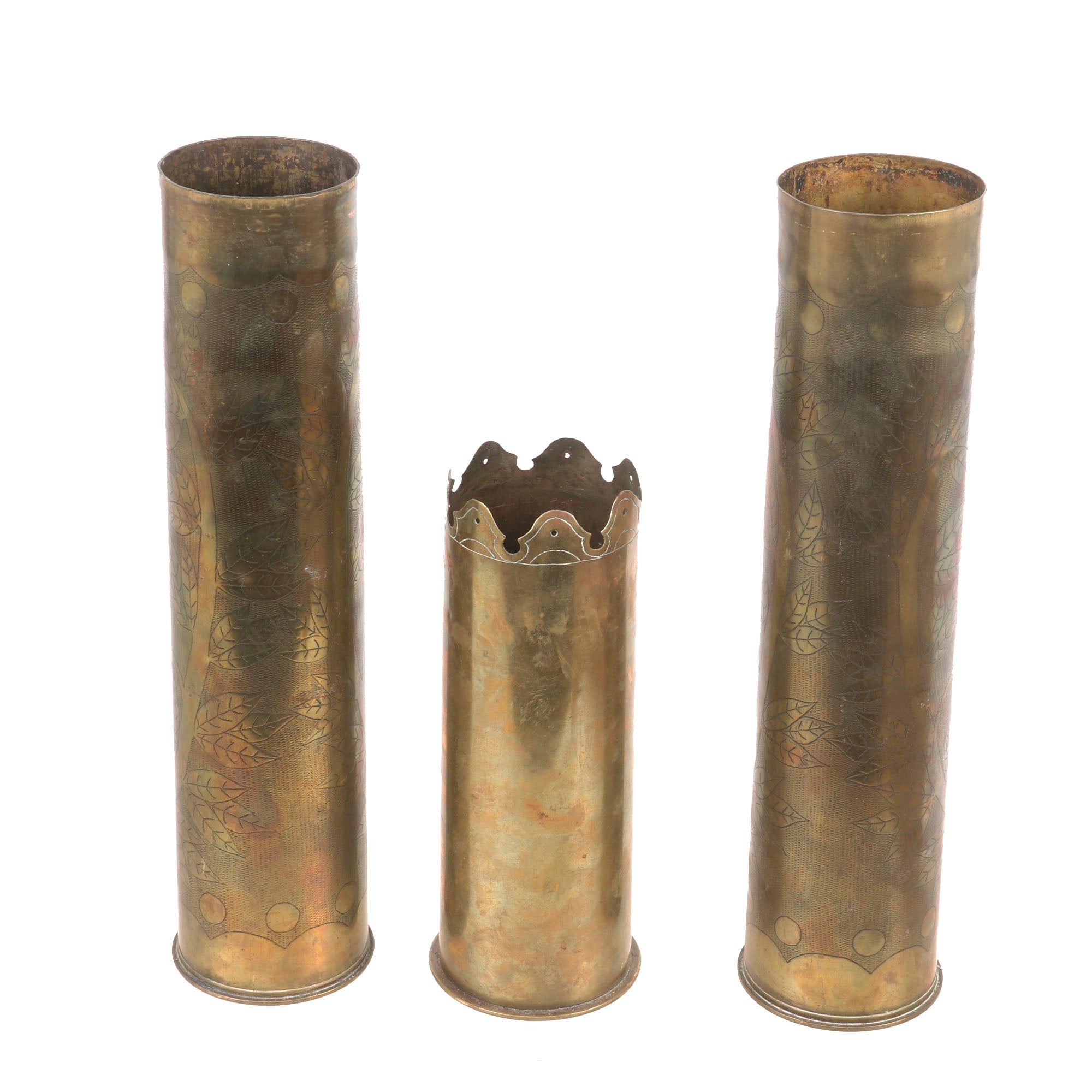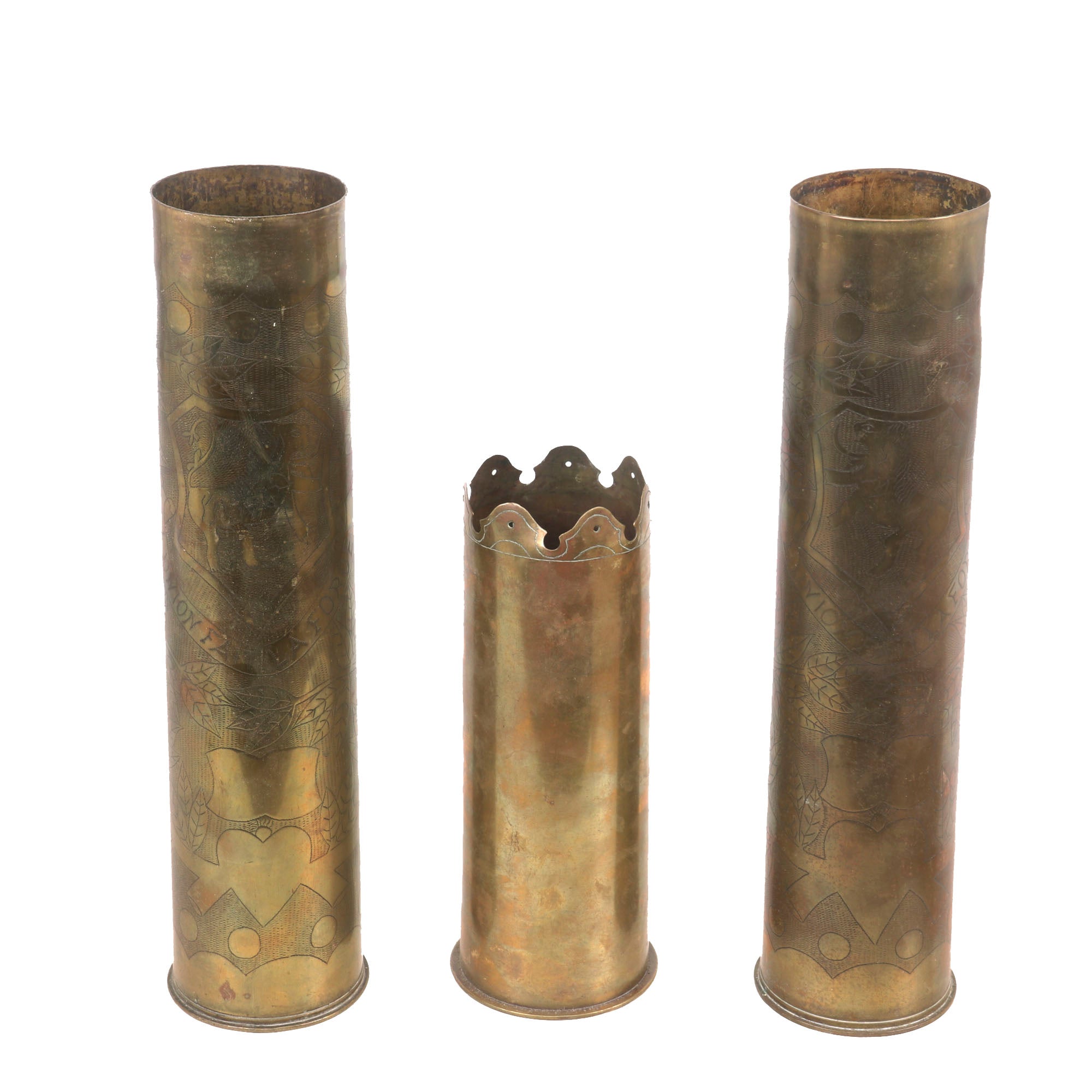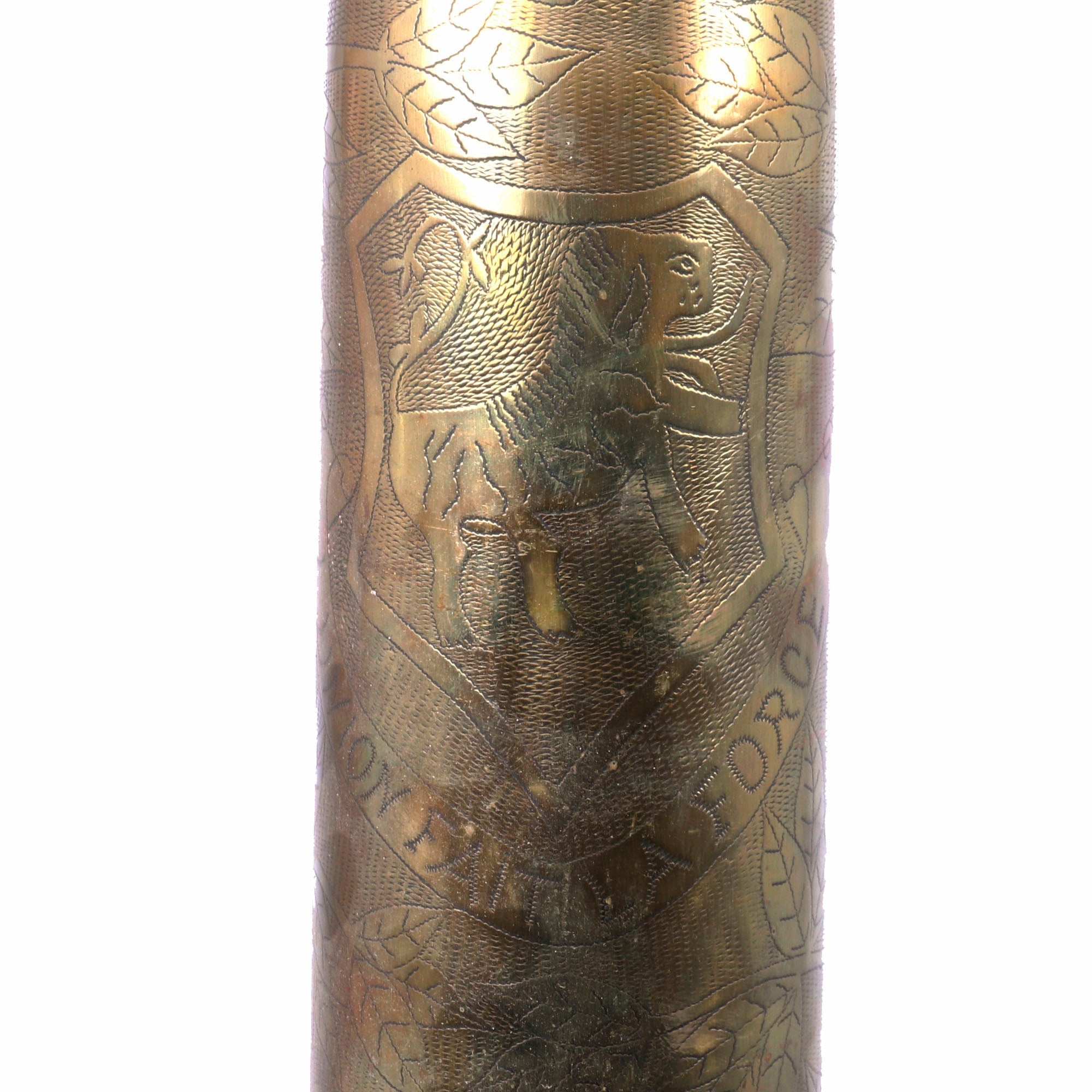 Original Items. Only One Lot Available. Trench art is any decorative item made by soldiers, prisoners of war, or civilians where the manufacture is directly linked to armed conflict or its consequences. It offers an insight not only to their feelings and emotions about the war, but also their surroundings and the materials they had available to them.Not limited to the World Wars, the history of trench art spans conflicts from the Napoleonic Wars to the present day. Although the practice flourished during World War I, the term 'trench art' is also used to describe souvenirs manufactured by service personnel during World War II. Some items manufactured by soldiers, prisoners of war or civilians during earlier conflicts have been retrospectively described as trench art.This lot is composed of three artillery shells and two fireplace tools, made from artillery shells. The two matching shells bear lovely engravings of vinery with the Belgium coat of arms, with the motto L'union fait la force below them, meaning Unity makes strength. These shells are 75mm and measure 13¾” tall. The third shell measures roughly 9”.The fireplace tools are also in nice condition and are lovely complements. The shovel measures 14½” long and the poker measures 14¾”. A lovely set, ready for further research and display.