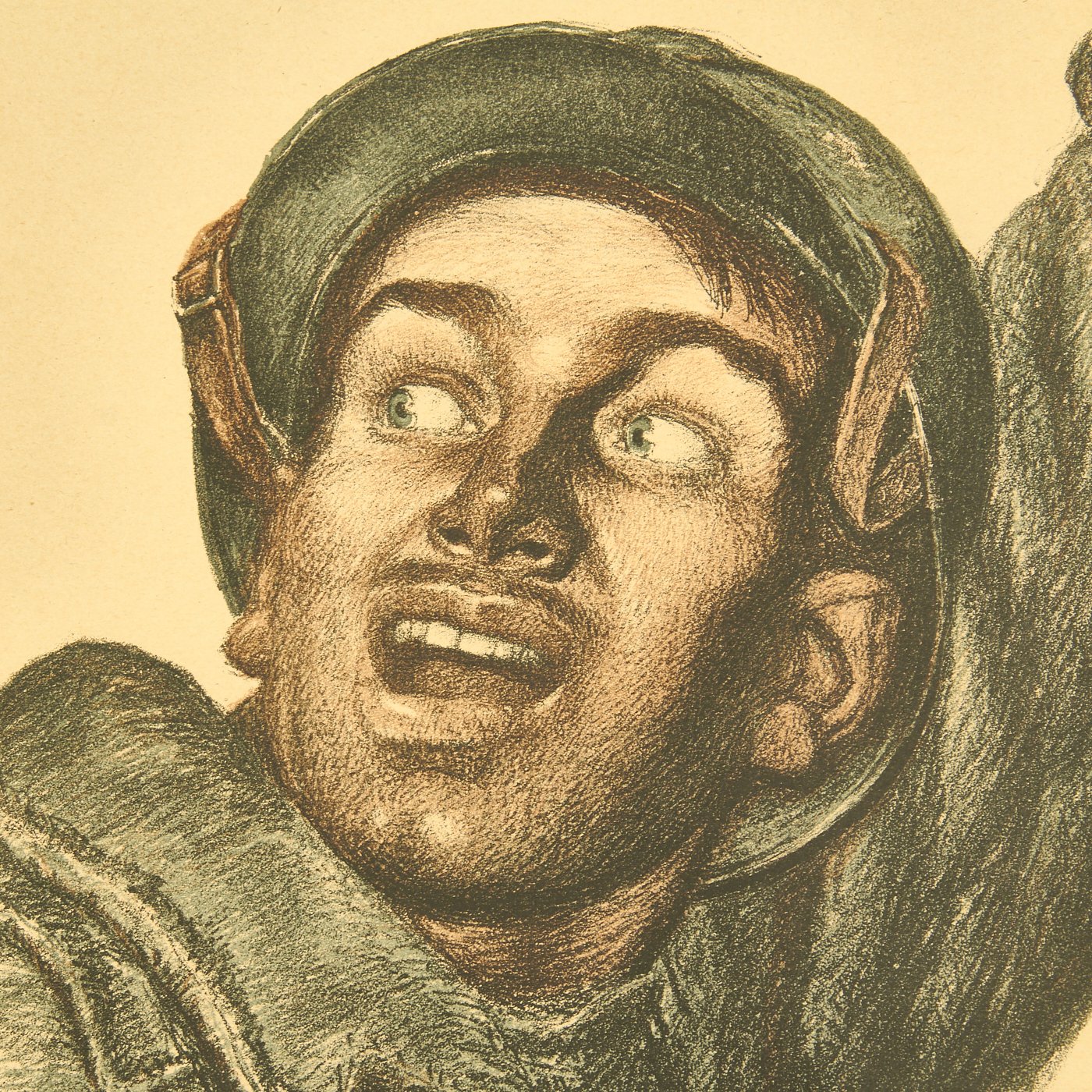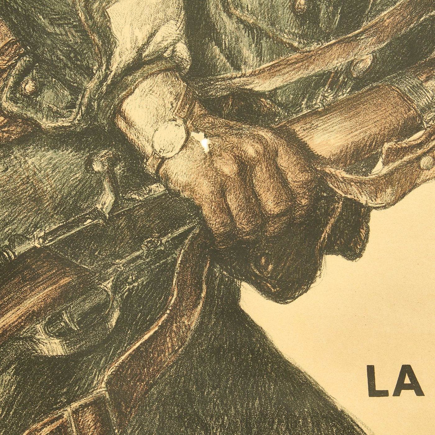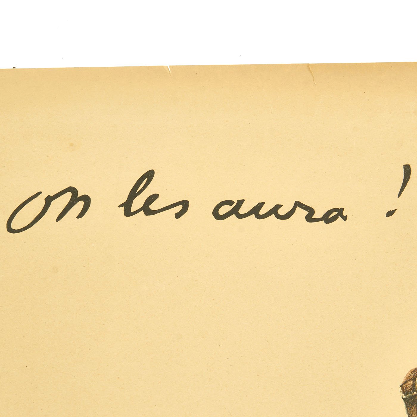 Original Item: Only One Available. Dating from 1916 this is a totally original French World War One Propaganda poster that measures 45" L x 31.5" W. It dears a French soldier and reads "On les Aura! " (We shall get them!) and translates to read "Subscribe to the 2nd National Defense Loan." The poster was designed by artist Jules Abel Faivre for the Second French National Defense War Loan in 1916. Poster is in good condition with solid vibrant colors, due to the age of the paper it is delicate and does have some minor damage along the edges.