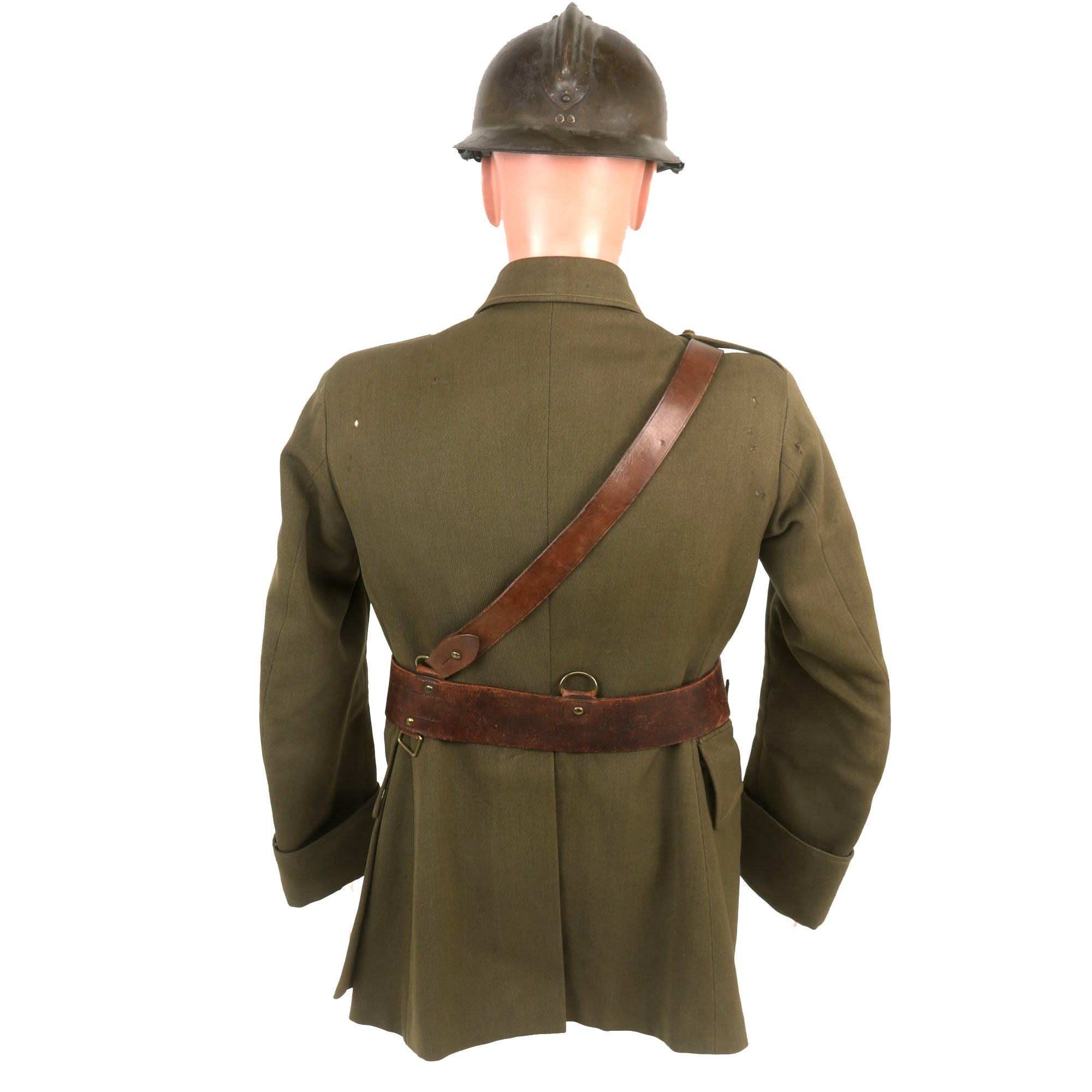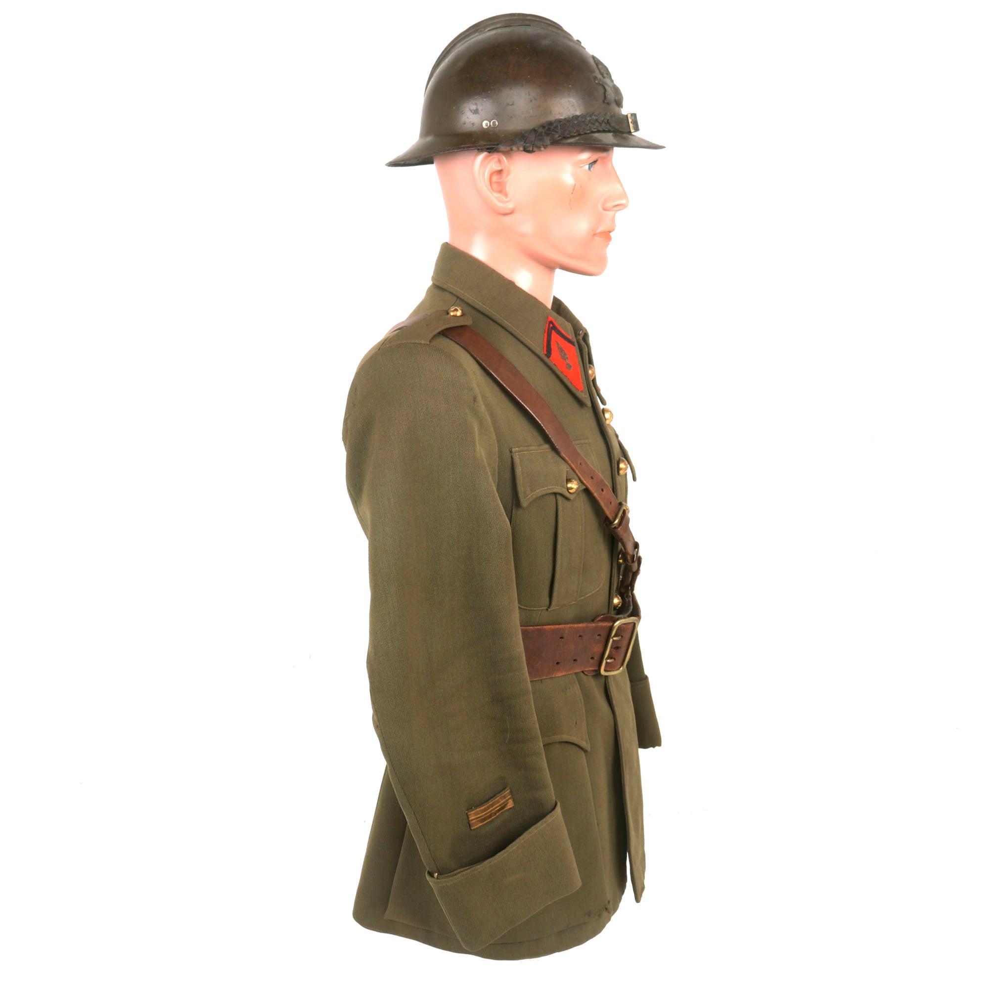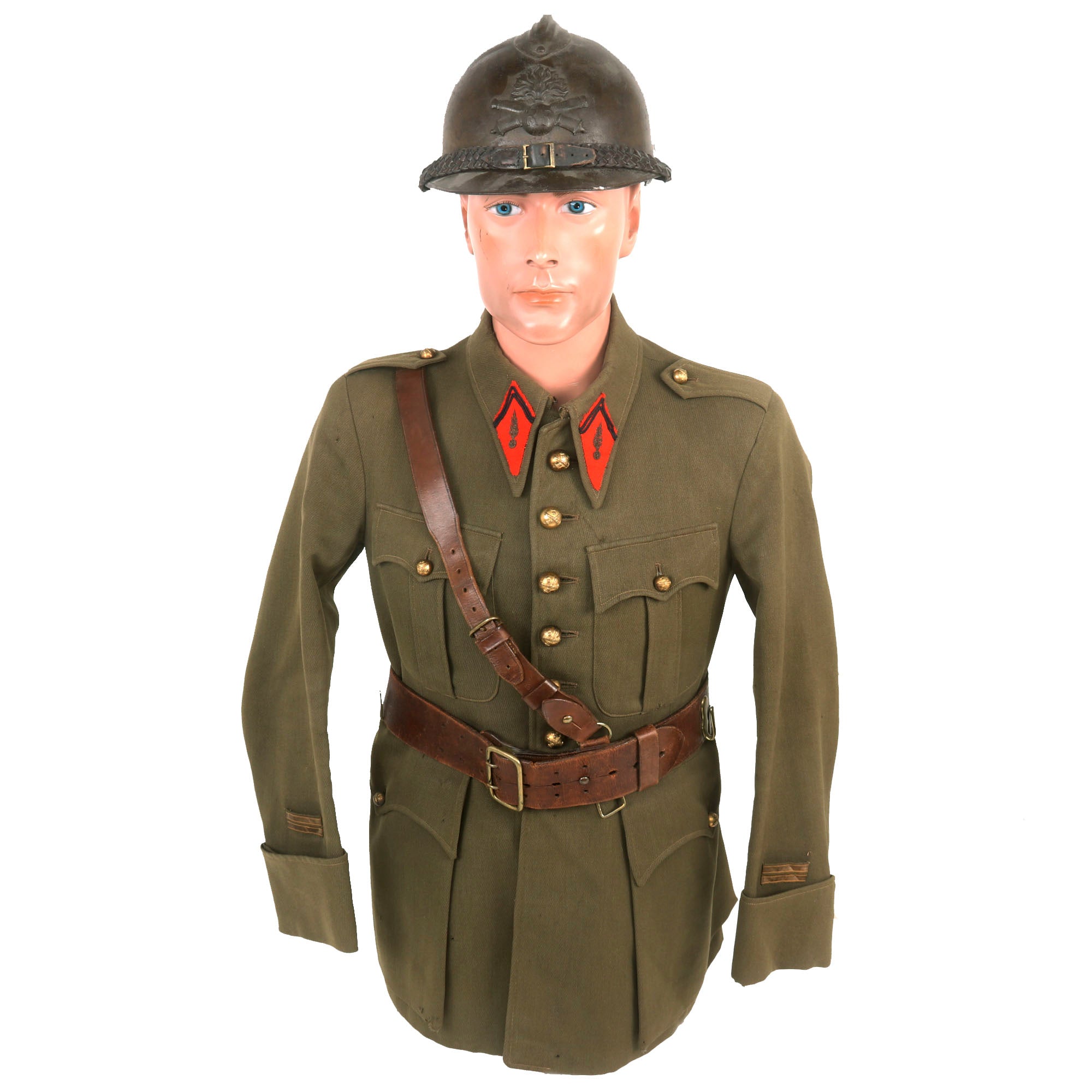 Original Grouping. One-of-a-Kind. This is a phenomenal French WWII uniform grouping to a Lieutenant in the French Field Artillery. This uniform dates to roughly 1940, and includes the officer’s tunic, breeches, red vest, greatcoat, Sam Browne Belt, Kepi, and M26 Helmet with a braided chinstrap.