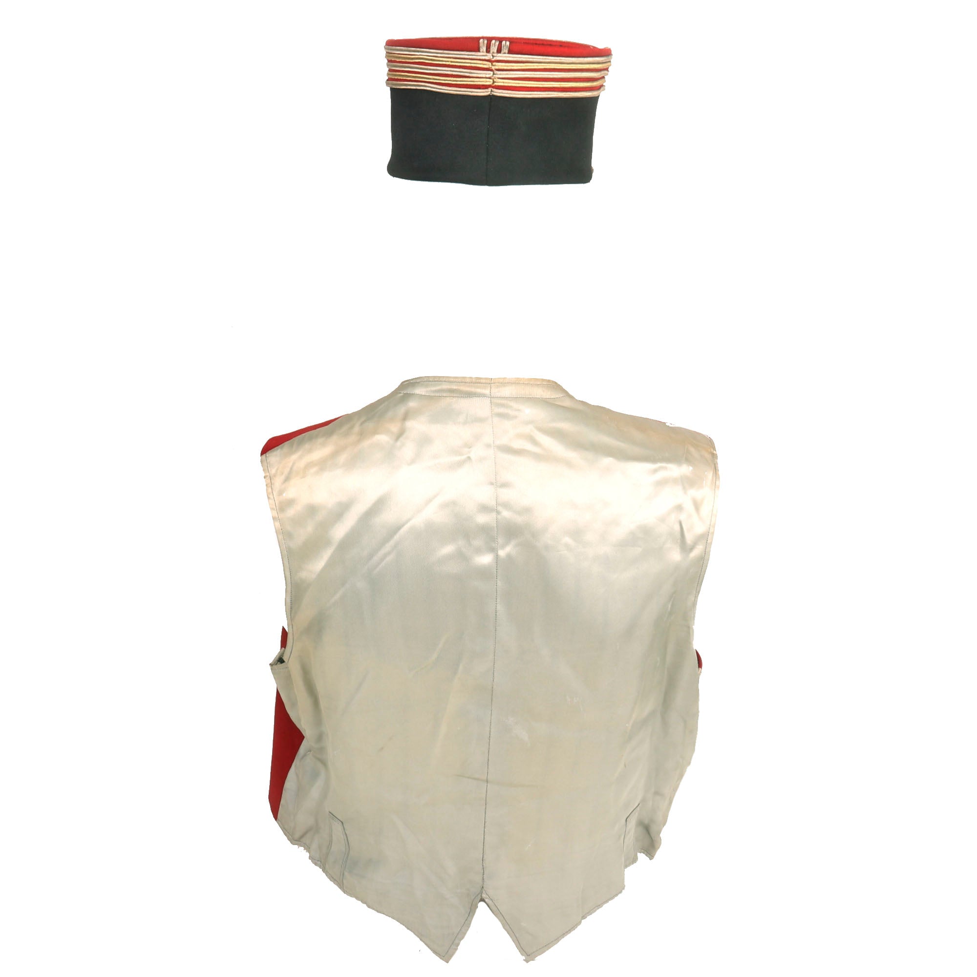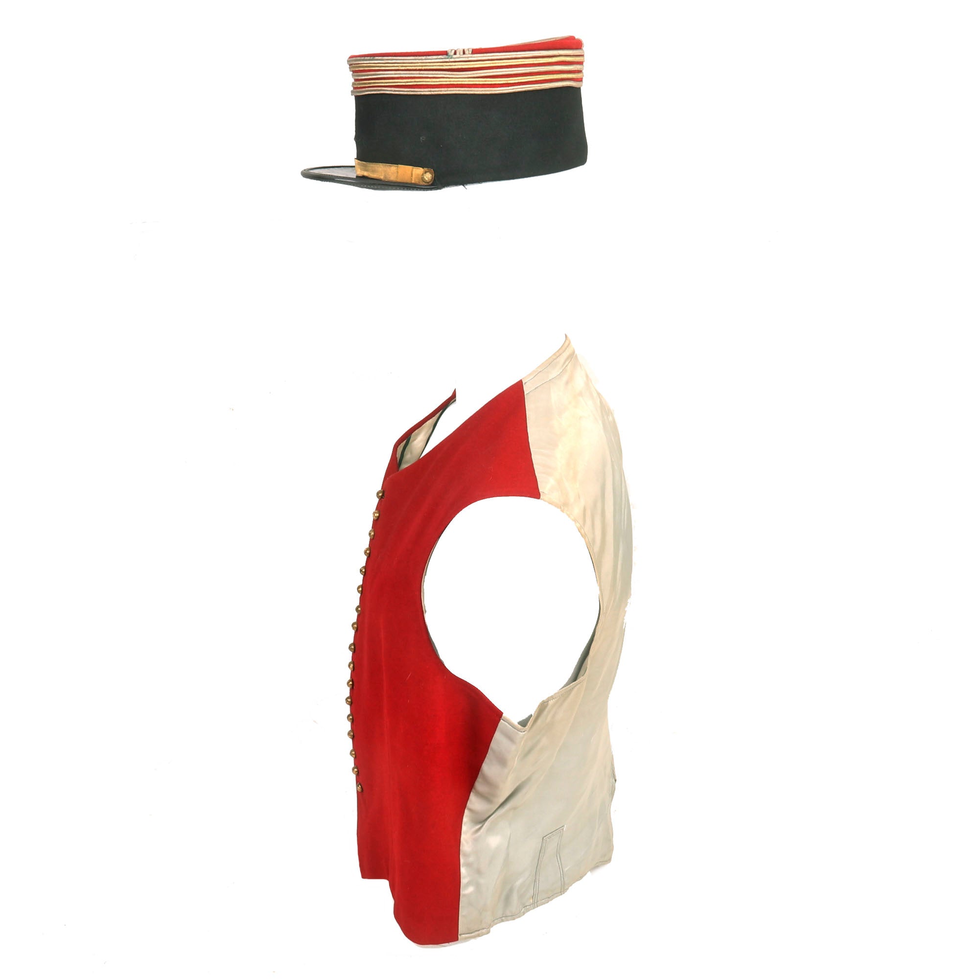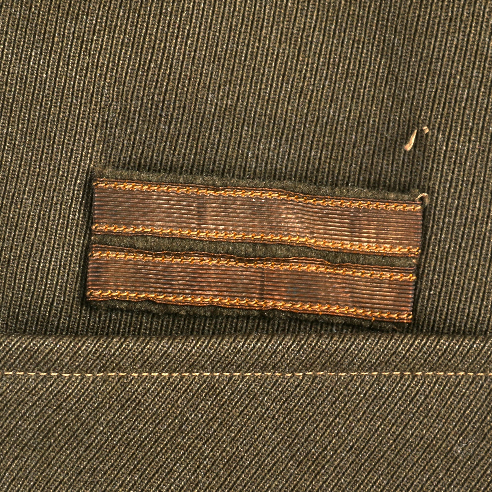 The tunic is in fair service-worn condition overall with some tears in the fabric and on the pockets, with light mothing overall. Also included is the officer’s Red Vest, which is correct for this model of uniform. The vest bears a staggering seventeen (17) small bras Field Artillery buttons on the front with a striped silk lining. The red of the vest is very well-aged and complements the uniform well. It is very difficult to find these uniform sets complete with the original vest.