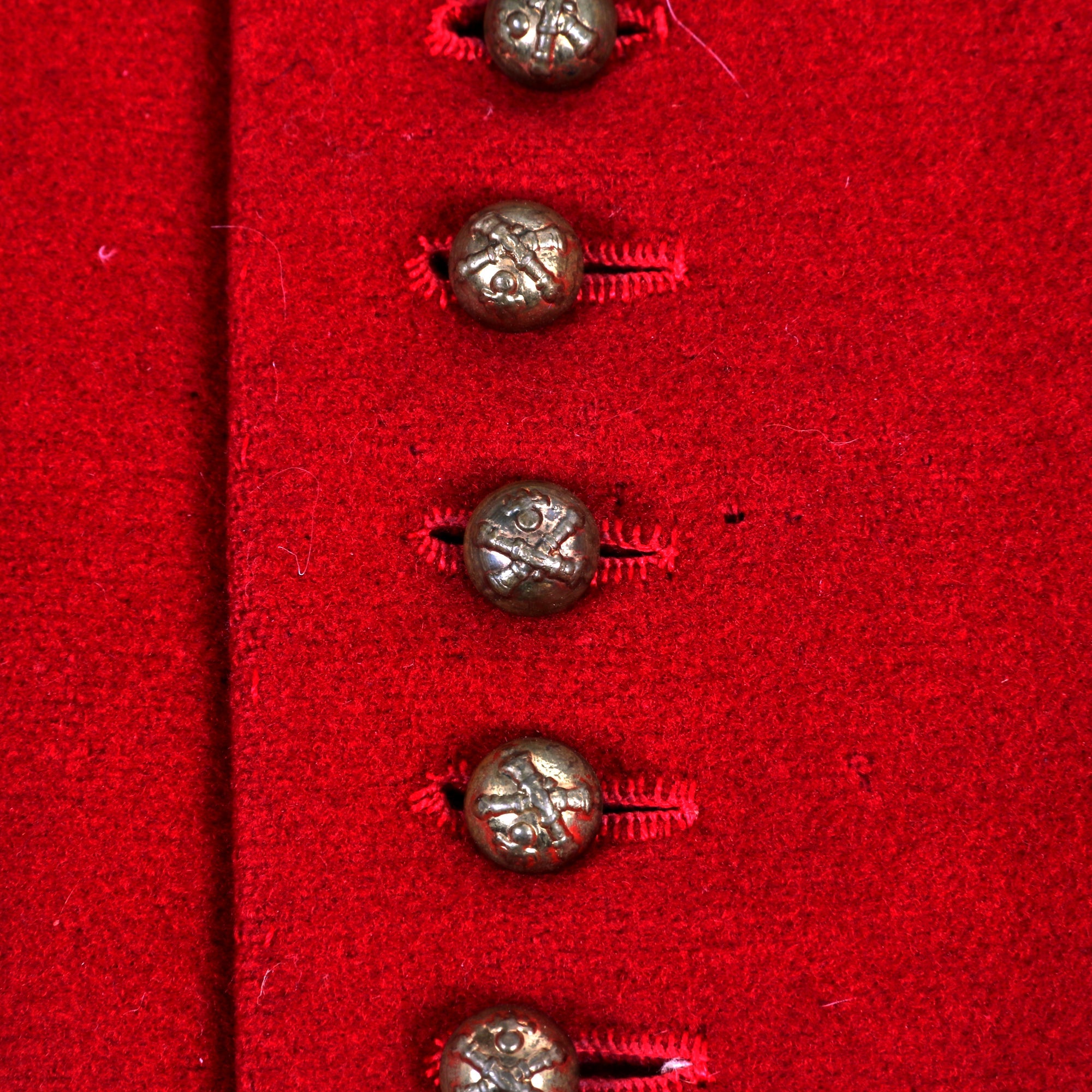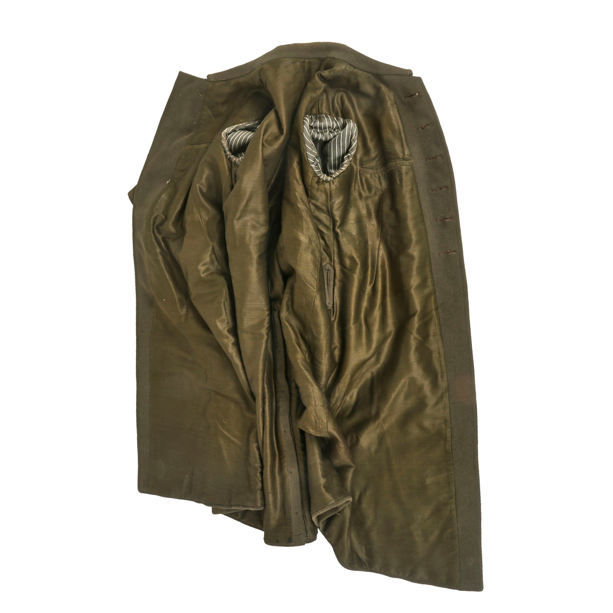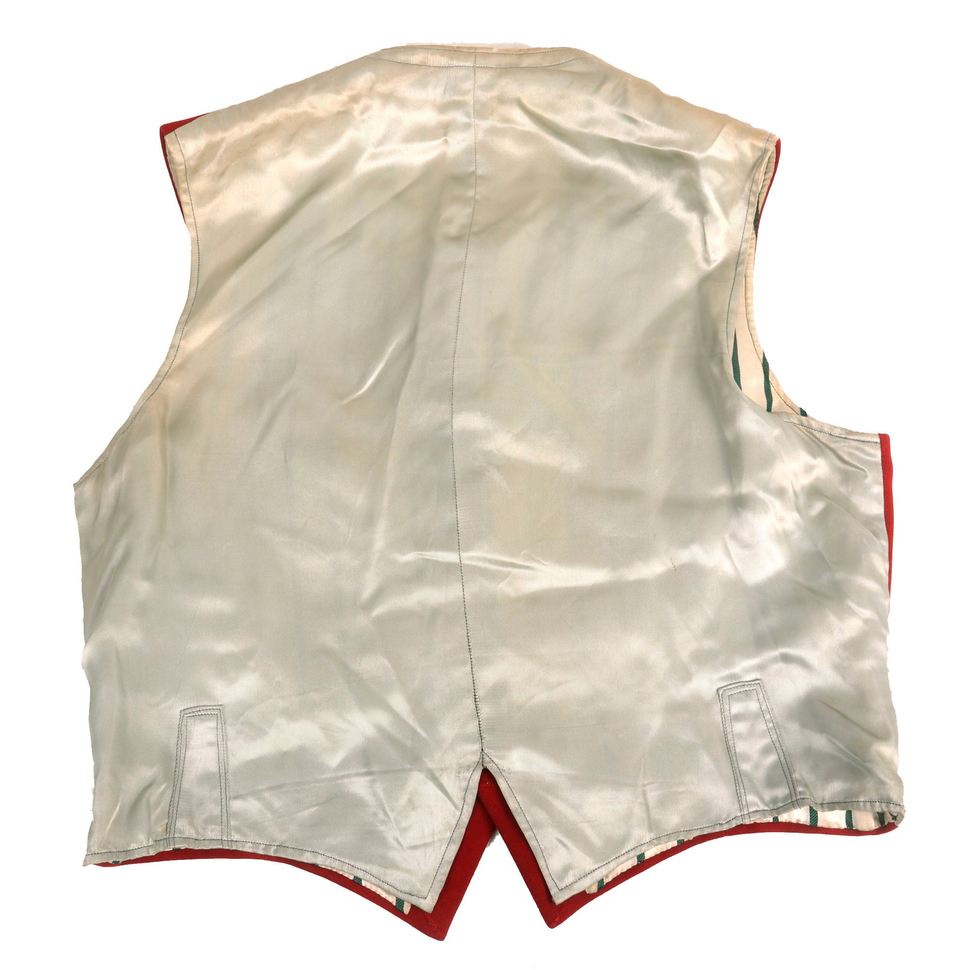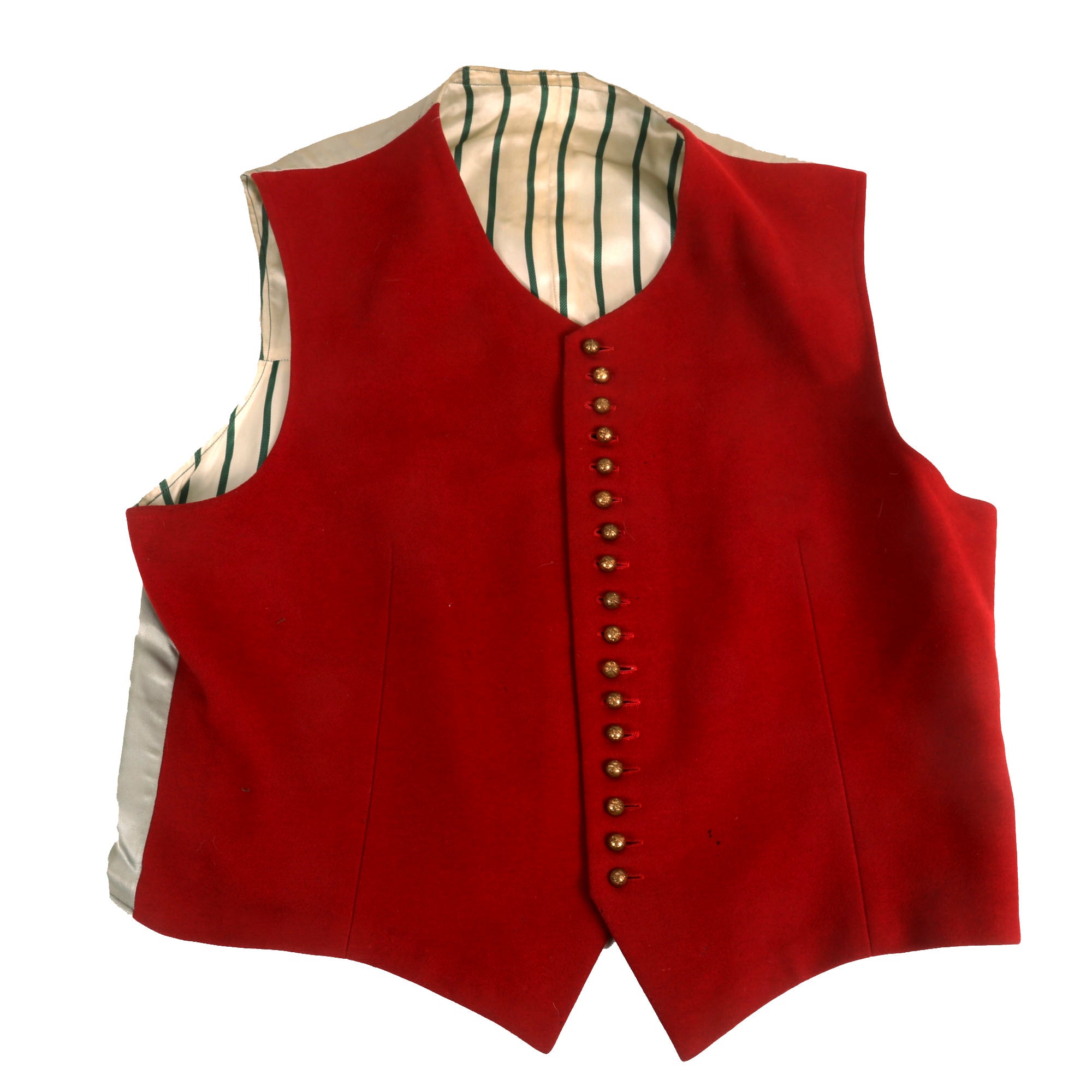 The tunic is in fair service-worn condition overall with some tears in the fabric and on the pockets, with light mothing overall. Also included is the officer’s Red Vest, which is correct for this model of uniform. The vest bears a staggering seventeen (17) small bras Field Artillery buttons on the front with a striped silk lining. The red of the vest is very well-aged and complements the uniform well. It is very difficult to find these uniform sets complete with the original vest.