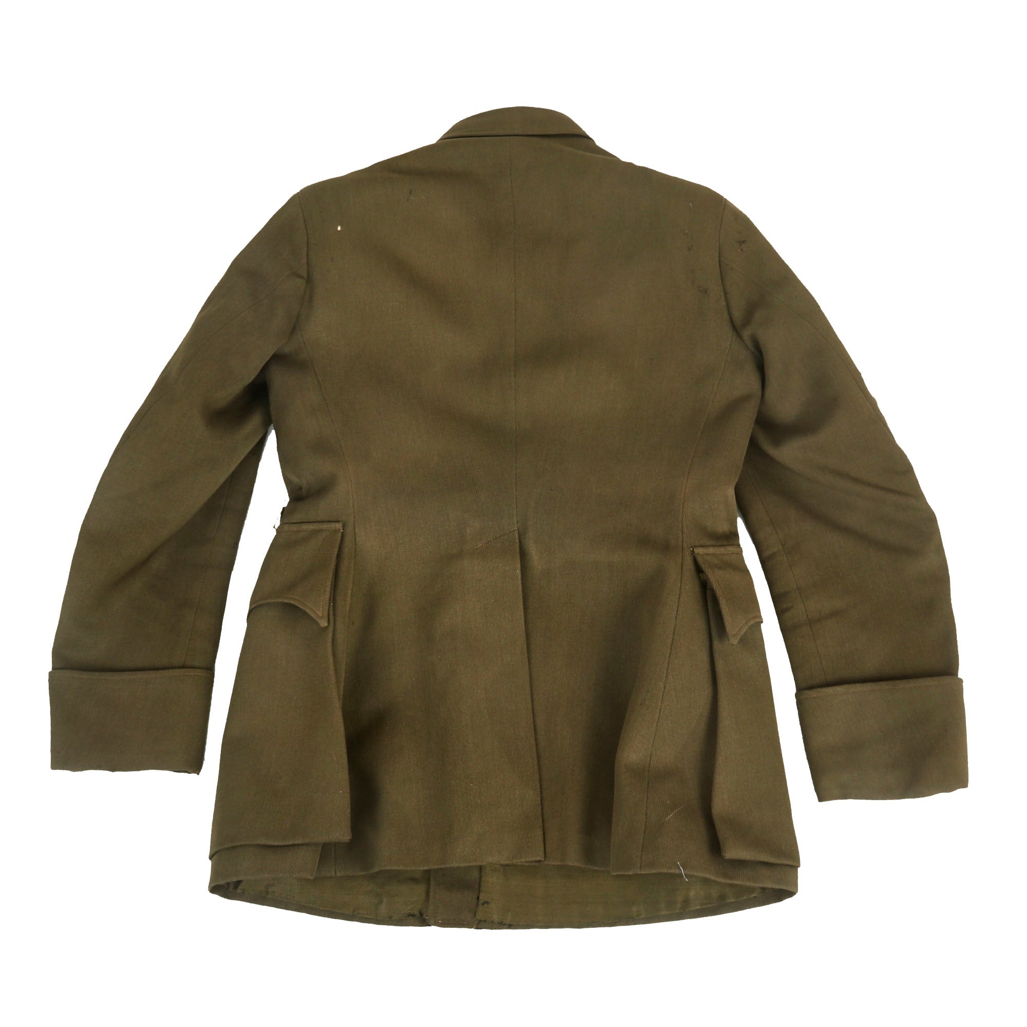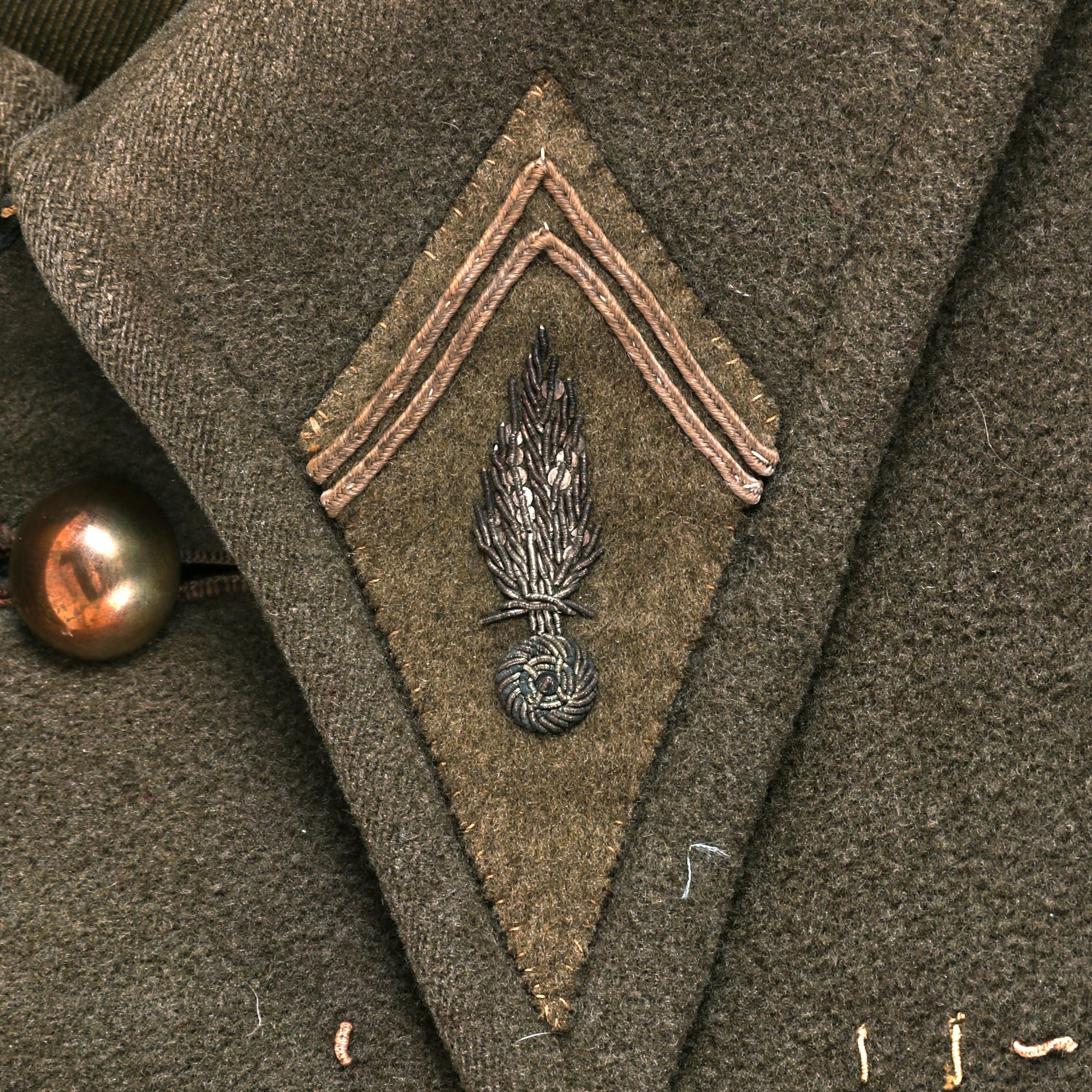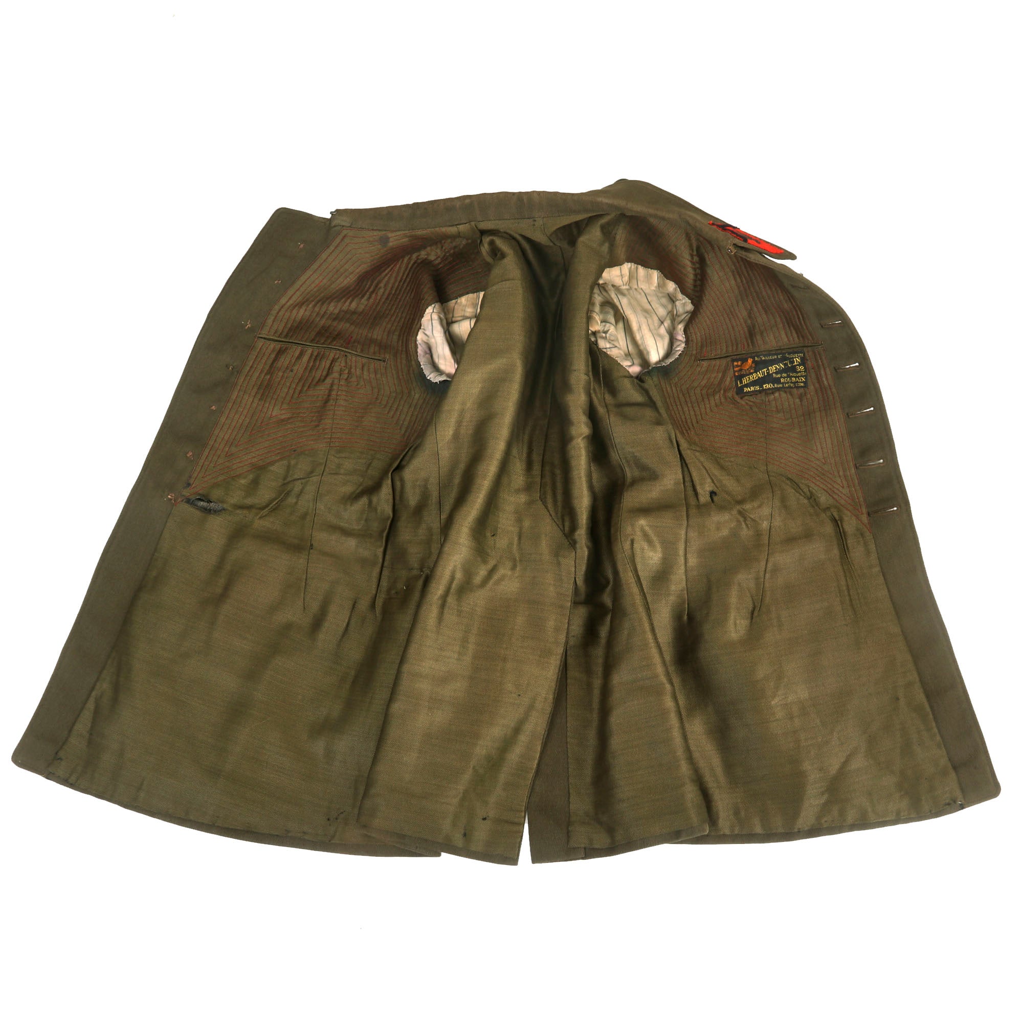 The uniform includes the officer’s single-breasted tunic with seven brass Field Artillery buttons sewn to the front. The right cuff bears two stripes, indicating the rank of Lieutenant. The collar bears two red felt-backed Flaming bomb insignia with two black chevrons at the top, denoting a Lieutenant of Field Artillery. The interior of the tunic is well worn, with a still-clear maker’s tag bearing a French bird and reading: