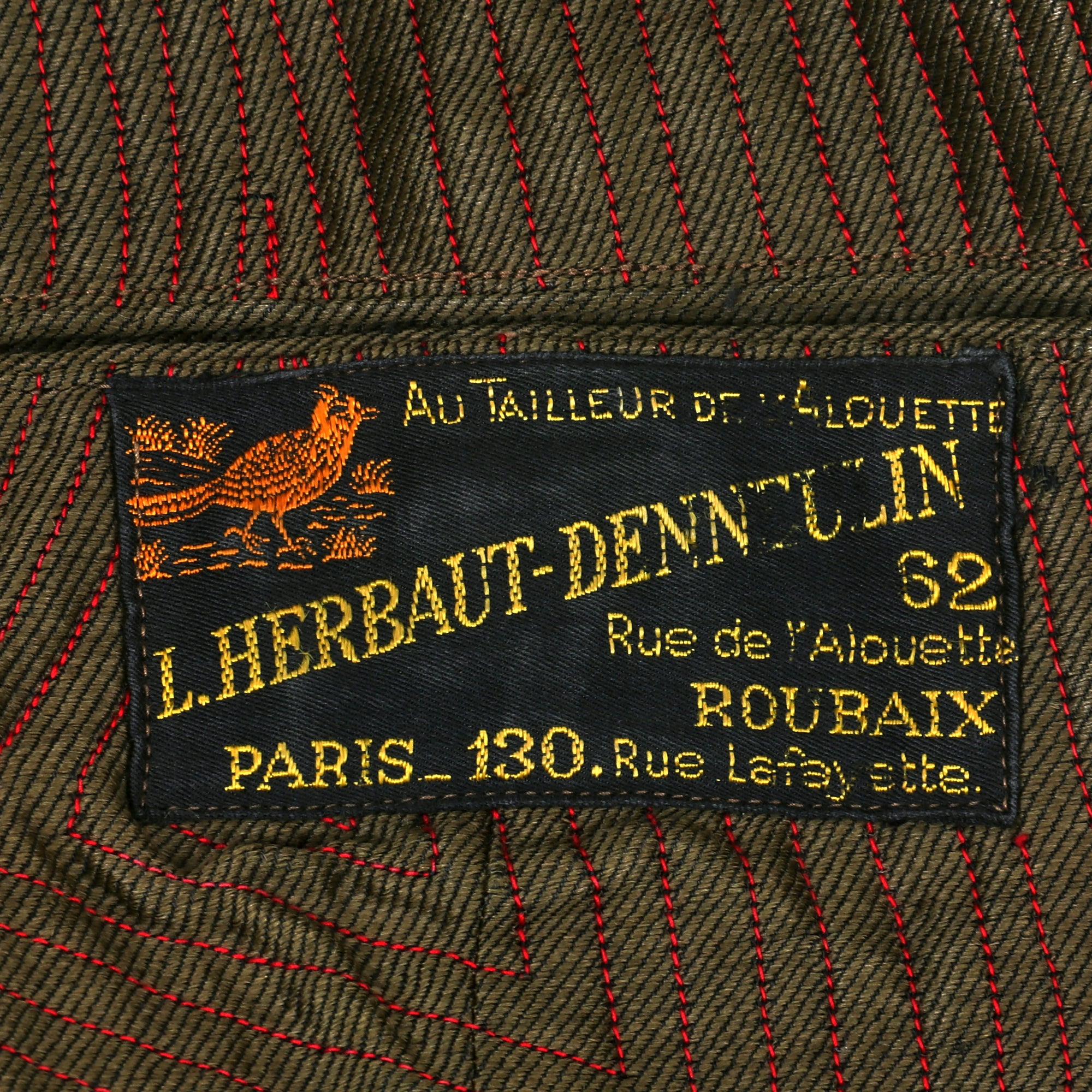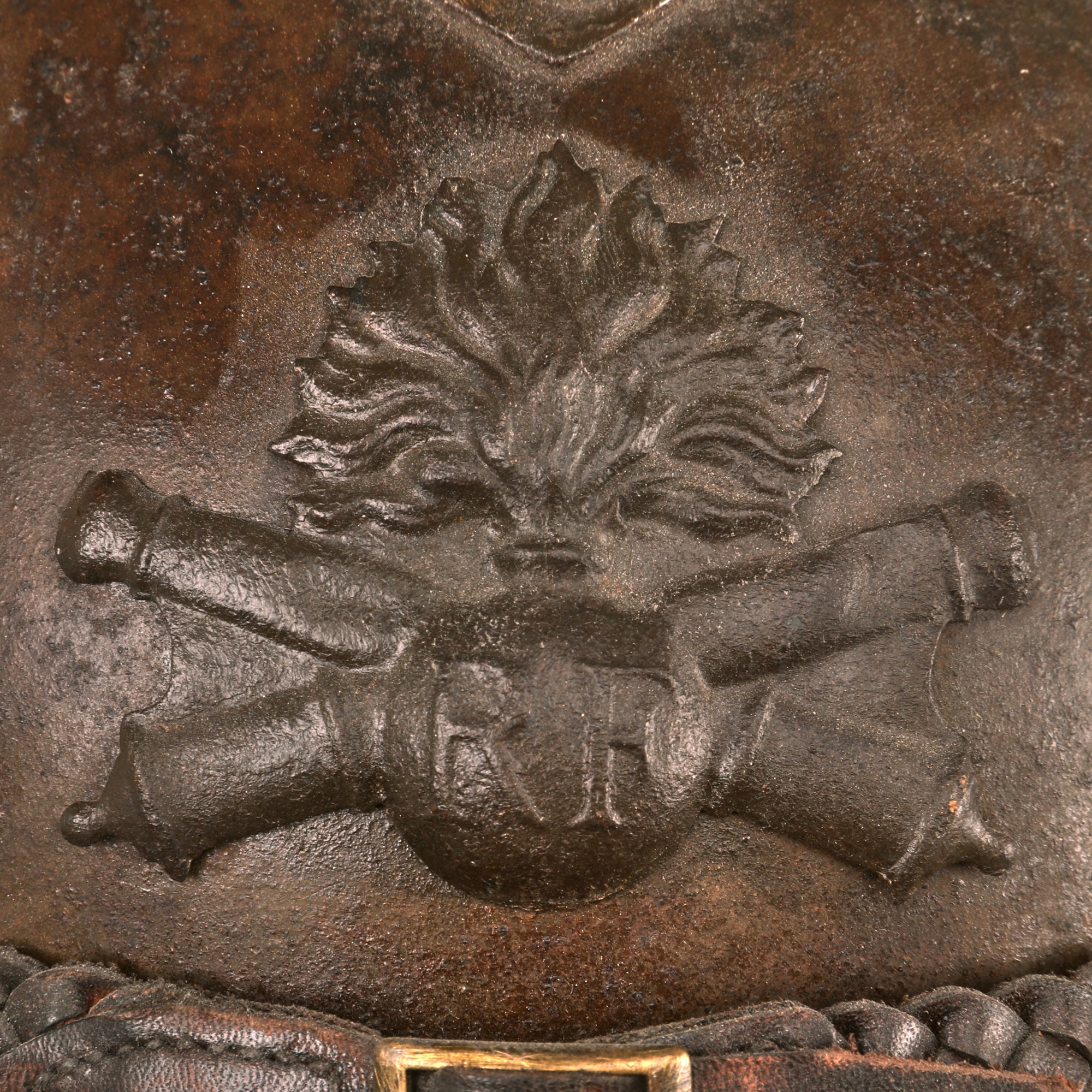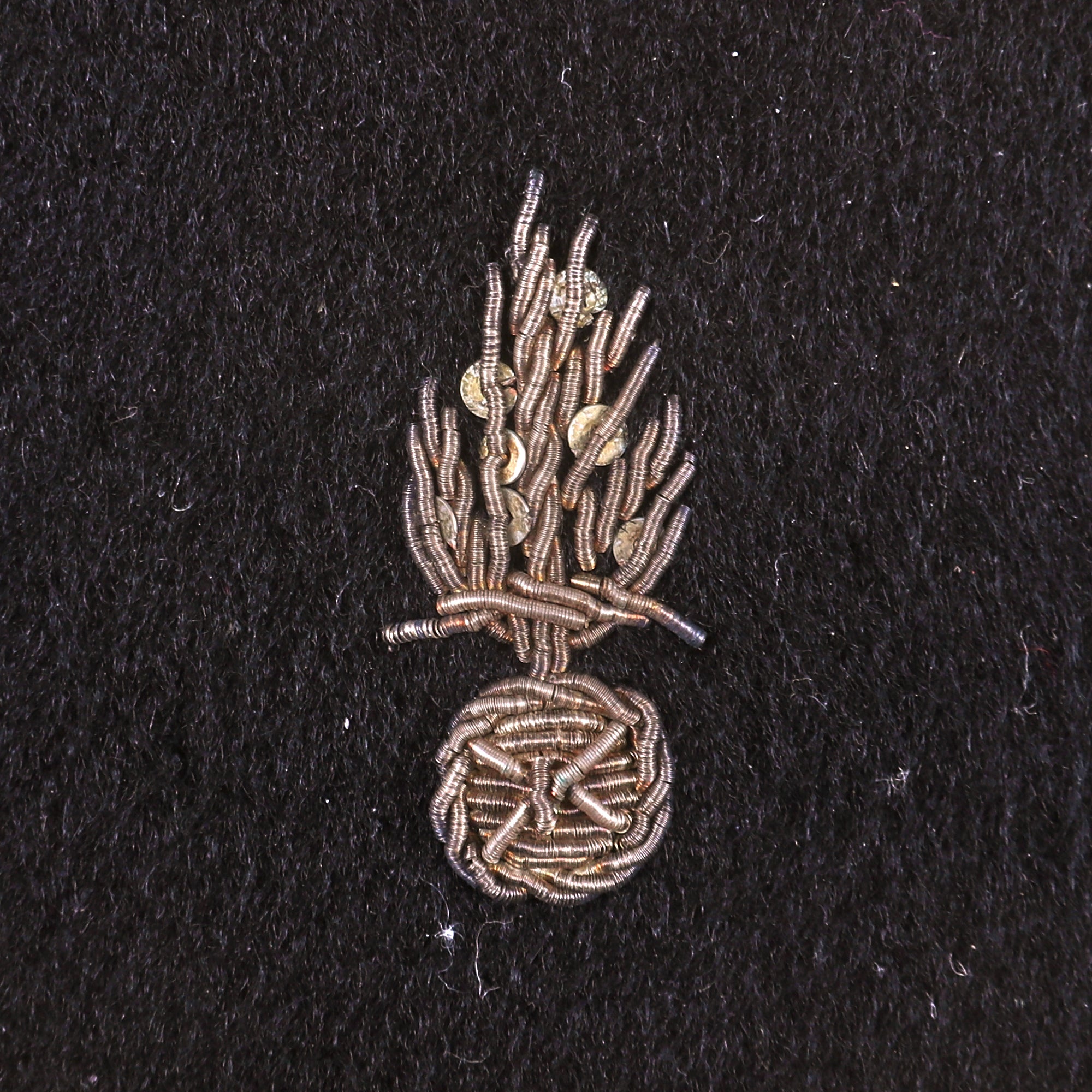 The uniform includes the officer’s single-breasted tunic with seven brass Field Artillery buttons sewn to the front. The right cuff bears two stripes, indicating the rank of Lieutenant. The collar bears two red felt-backed Flaming bomb insignia with two black chevrons at the top, denoting a Lieutenant of Field Artillery. The interior of the tunic is well worn, with a still-clear maker’s tag bearing a French bird and reading: