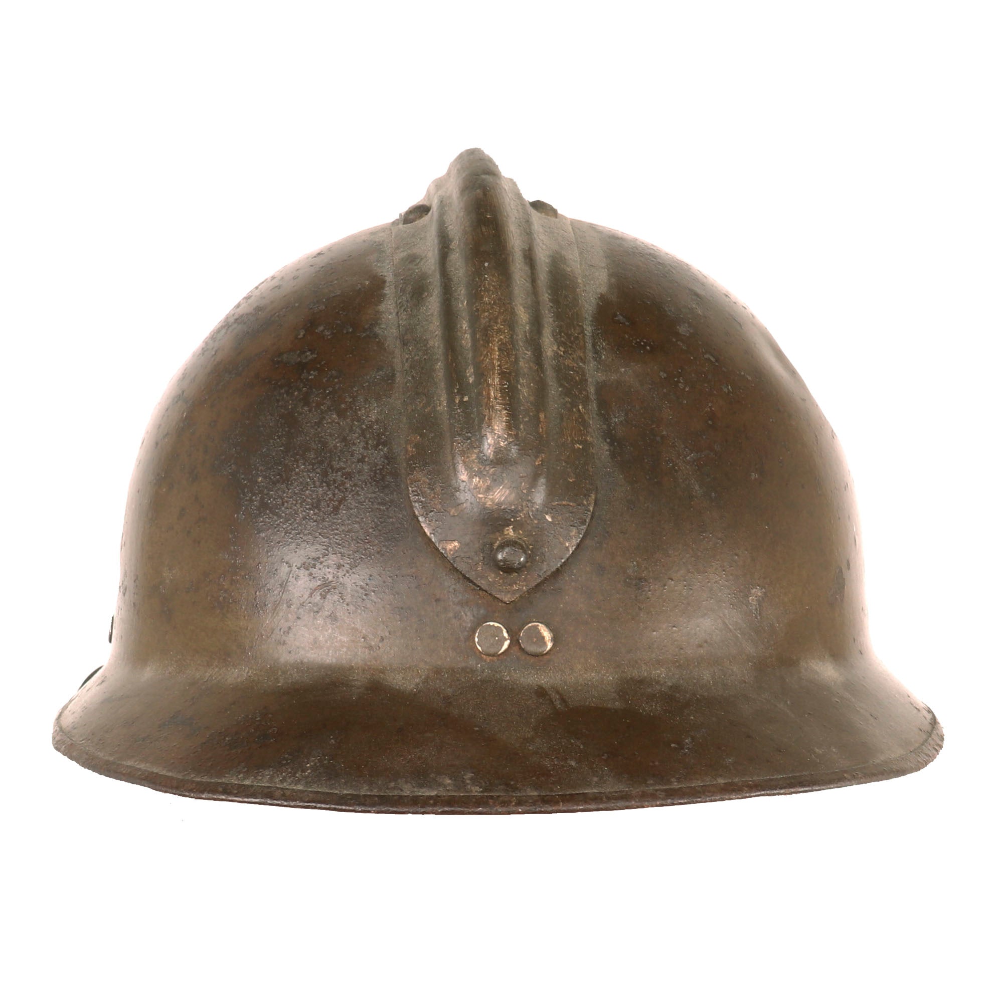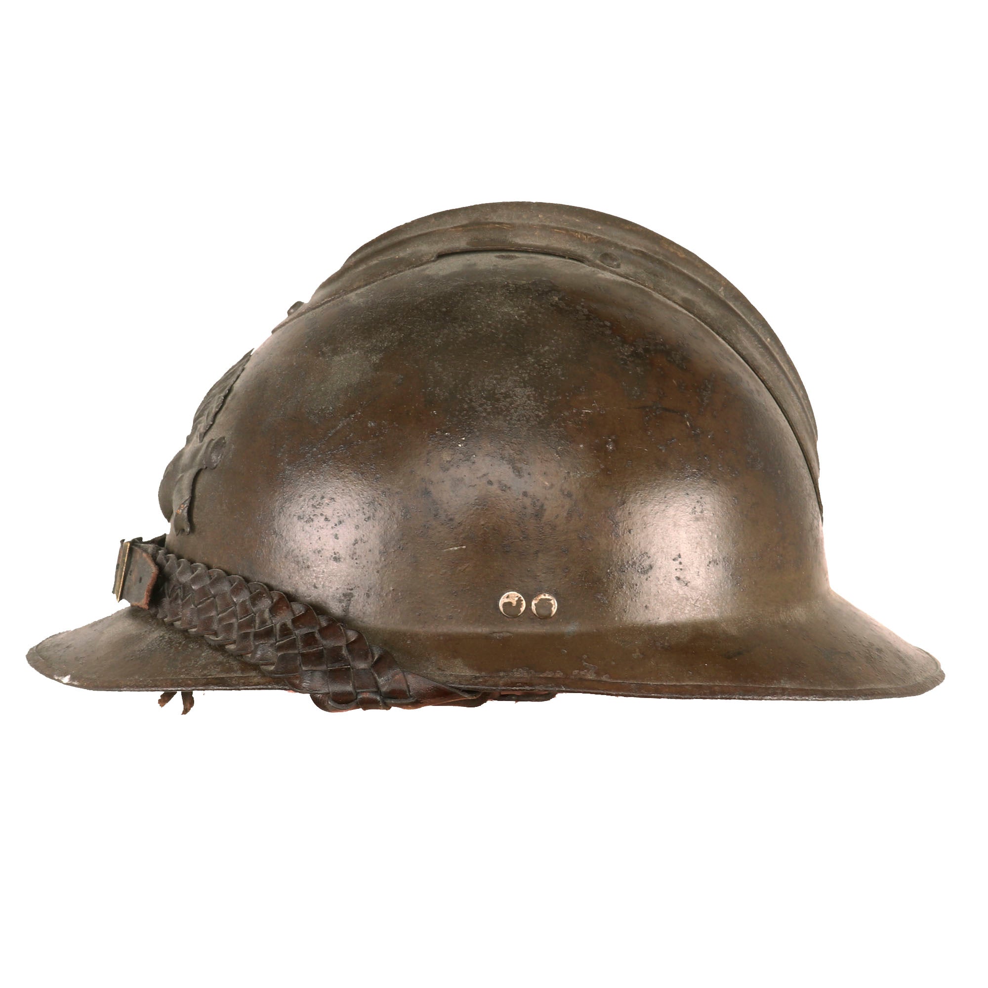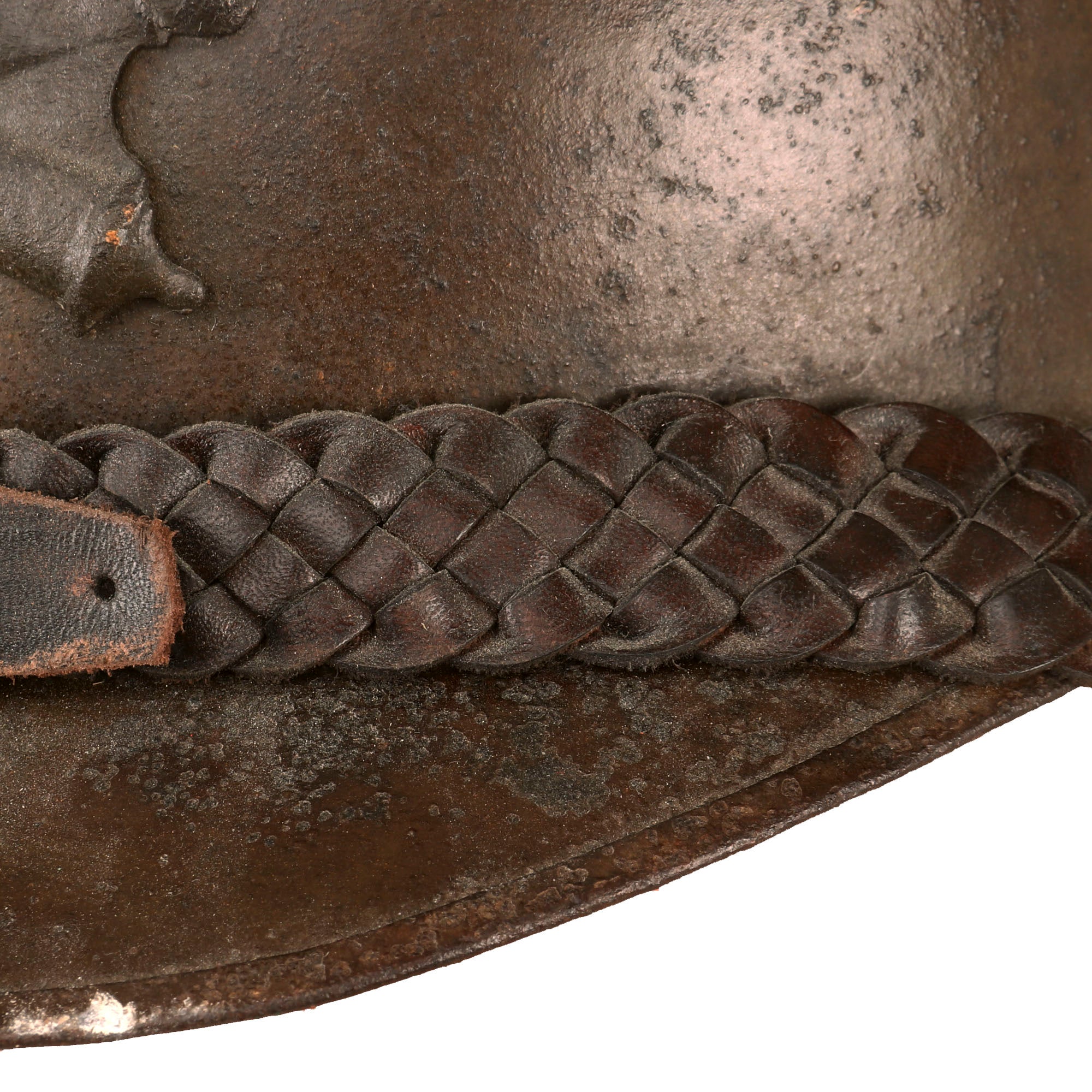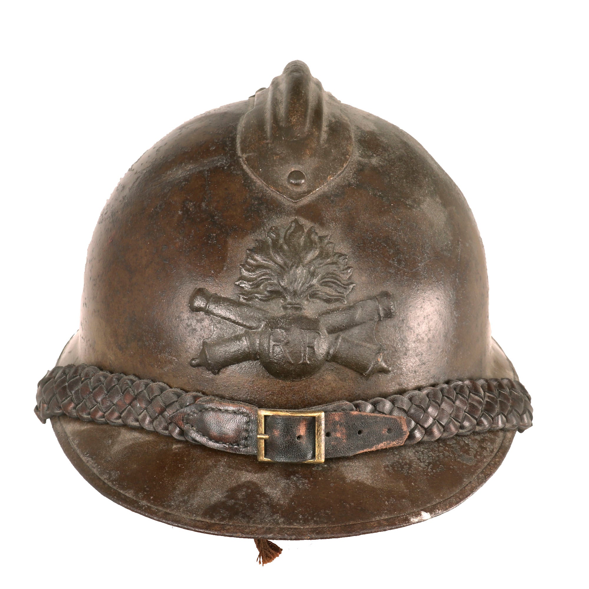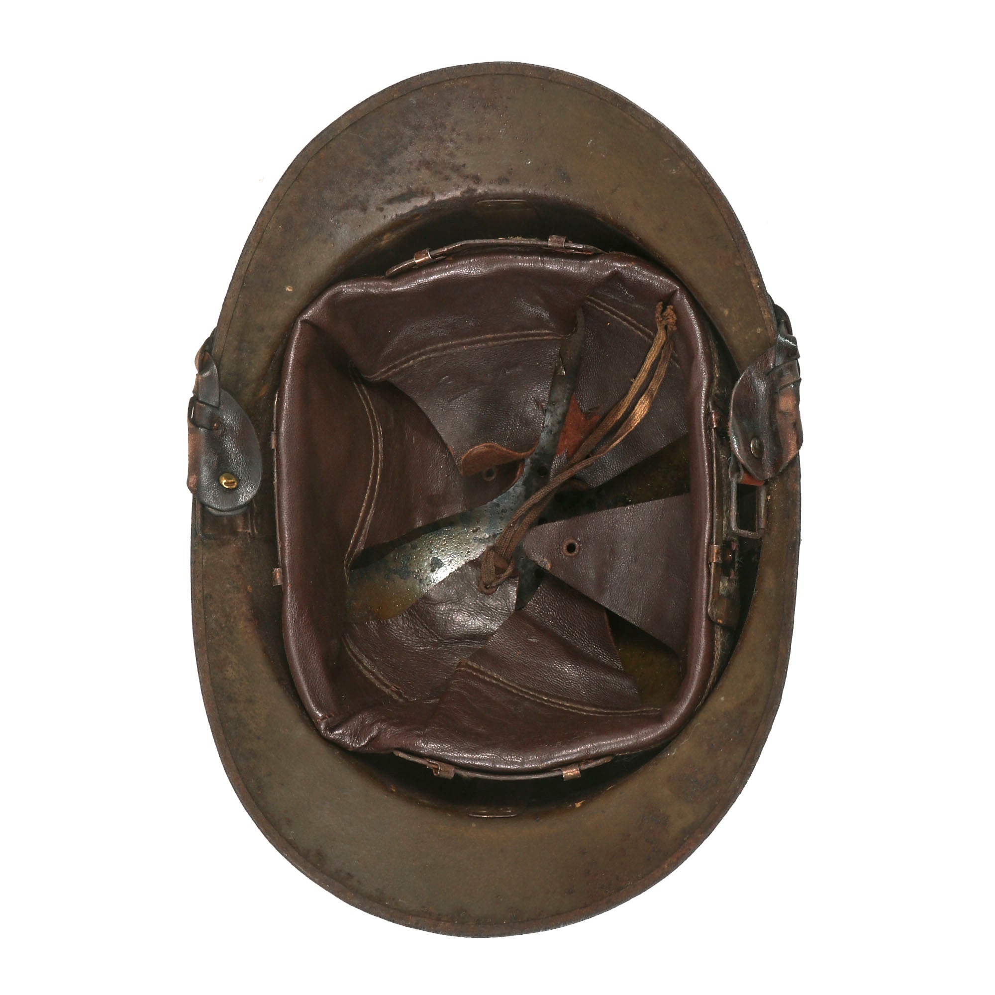 The included helmet is a great M1926 Adrian helmet with a WWI-era Artillery helmet plate affixed to the front, which has certainly always been there. The brownish paint of the helmet has been well-retained with heavy wear commensurate with age. The helmet retains its original liner & gorgeous braided-leather chinstrap which denotes the wearer as an officer. The chinstrap is in great condition with the buckle still well-retained, the chinstrap sat upon the helmet’s brim. The liner is in similar great condition and is still very supple. This is one of the best M26 Adrian helmets we have had in its own right!