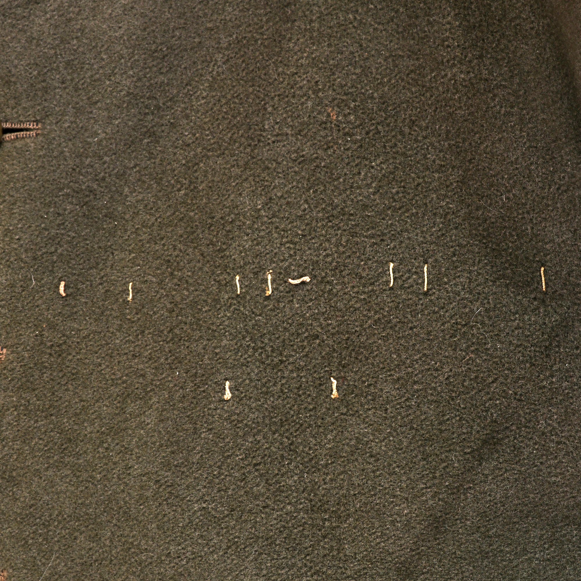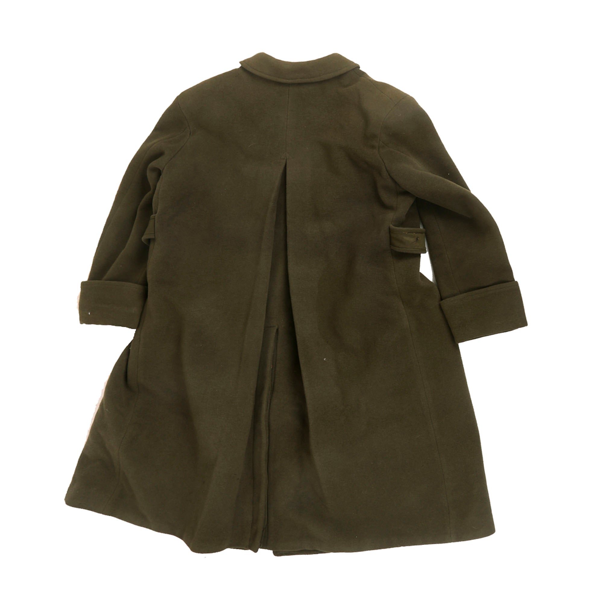 The greatcoat is enormous and still bears the six plain brass buttons at the front. The same collar insignia with now a green felt backing are present with the two chevrons at the top denoting Lieutenant. This coat originally had ribbons attached to the left breast, evident by the stitch loops still visible, but the ribbons are no longer present. There was a maker’s tag on the interior, now removed. The original tightening strap on the back is present but all the buttons are missing. A very nice greatcoat to complement the grouping.