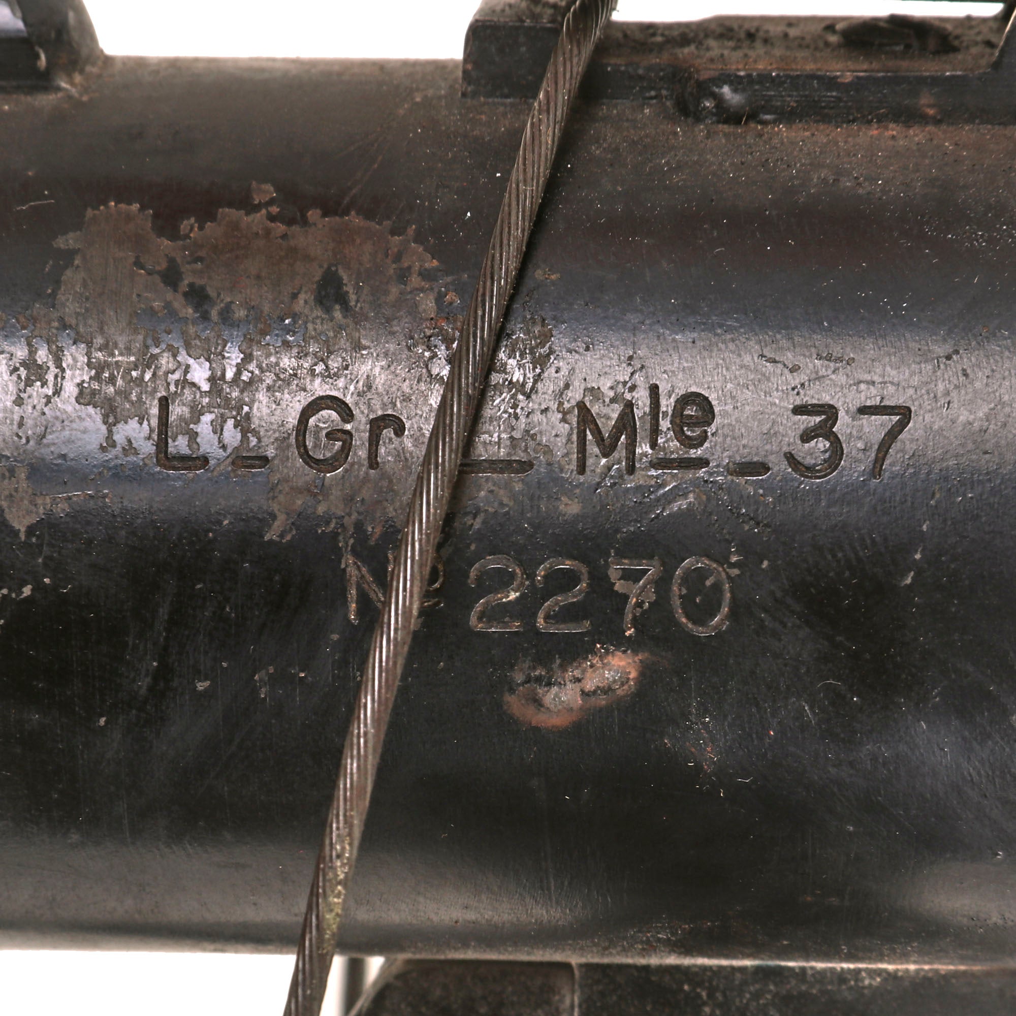 This is short for Lance Grenades modèle 37 (Grenade Launcher Model 37), the official issue name used by the French. It is still adjustable for windage with the screw gear on the top of the bipod, and the angle adjustment is handled by a metal wire that locks into the back of the barrel. There is a range adjustment in the center of the tube, but it is frozen. It still has the bubble level at the bottom of the barrel, which unbroken and functional, and it folds up correctly with the base plate.